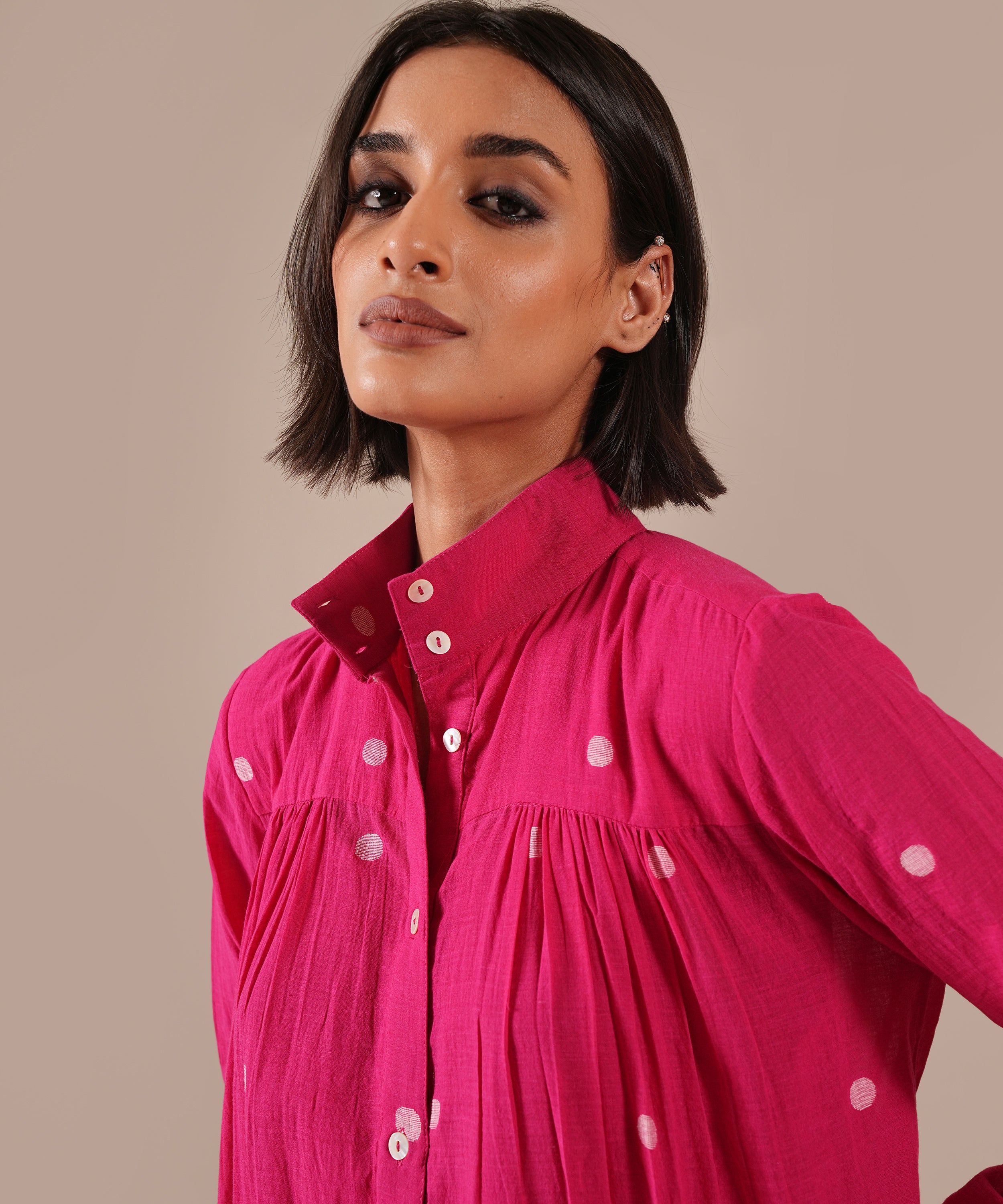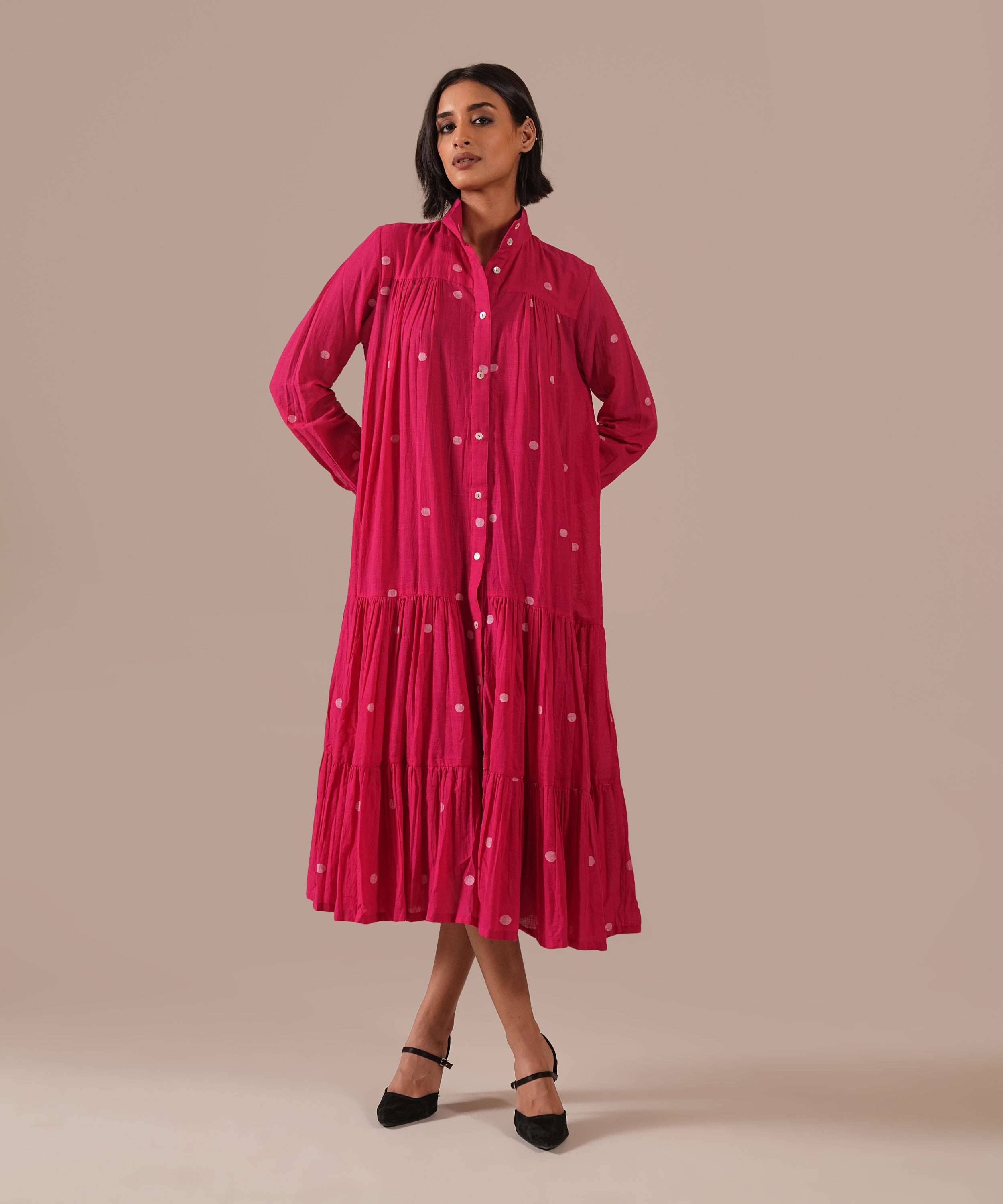 A minimalistic tiered shirt dress featuring high collar neck, front button fastening, full sleeves that comes with gentle pleats at the front and back which be styled in multiple ways. This dress also comes with a separate slip.