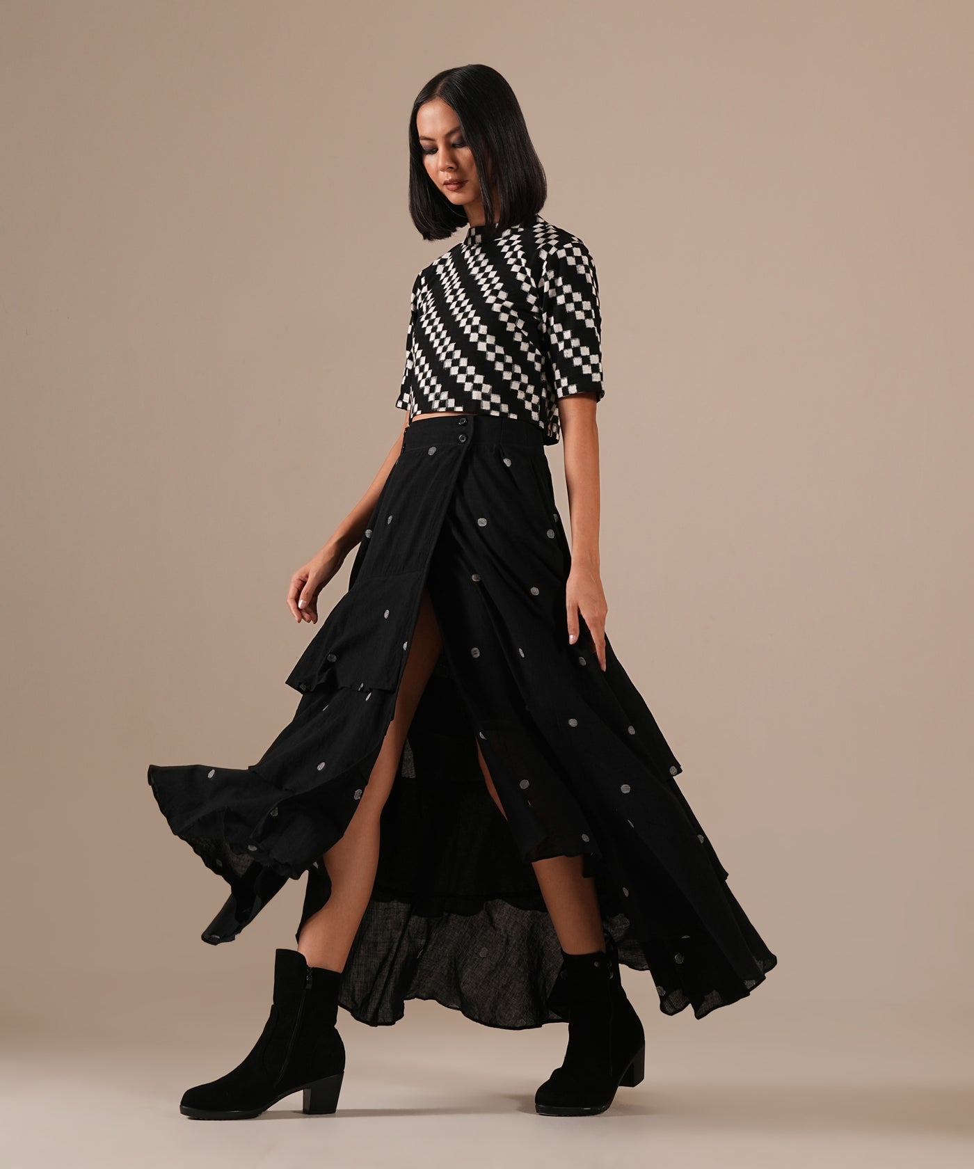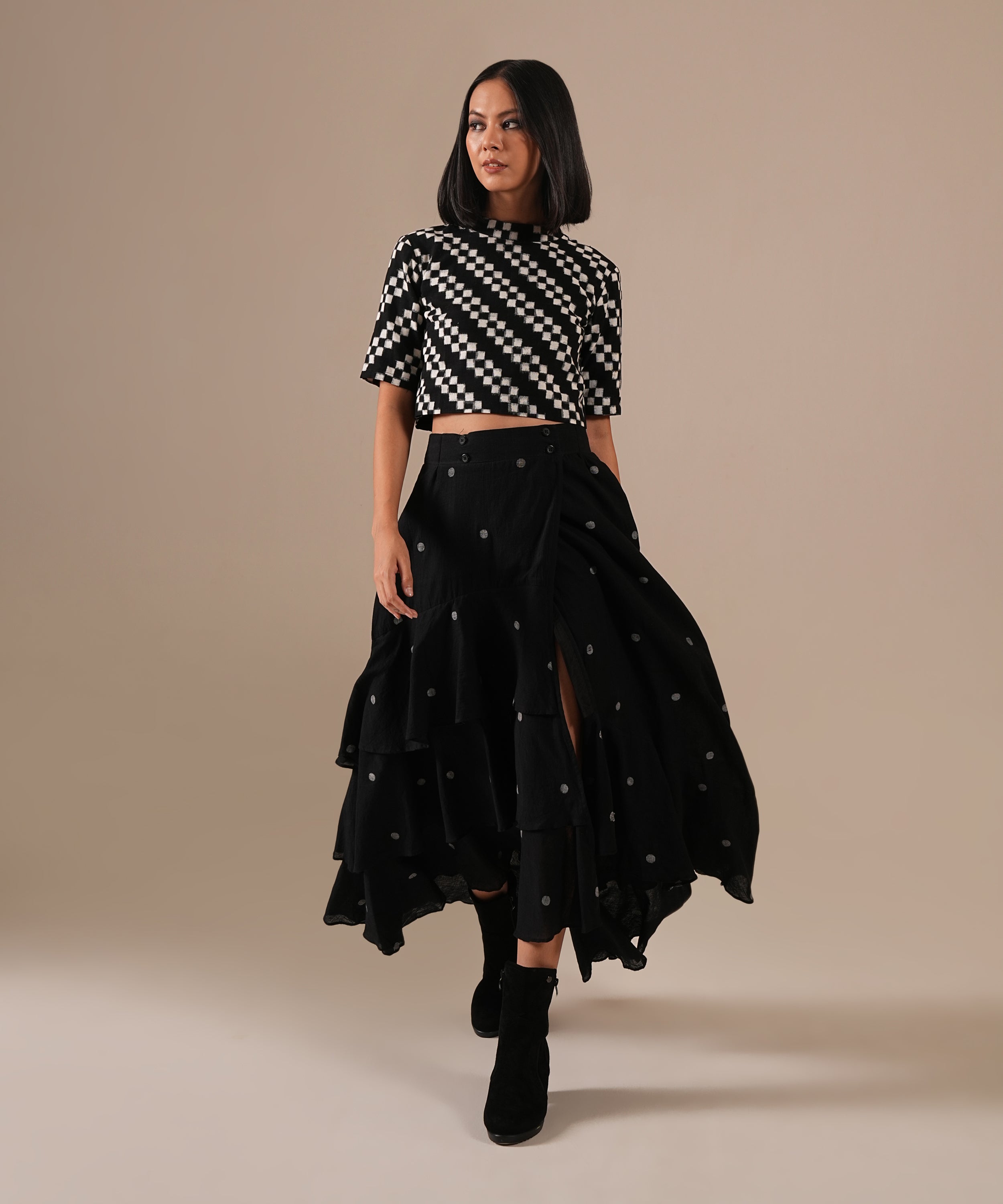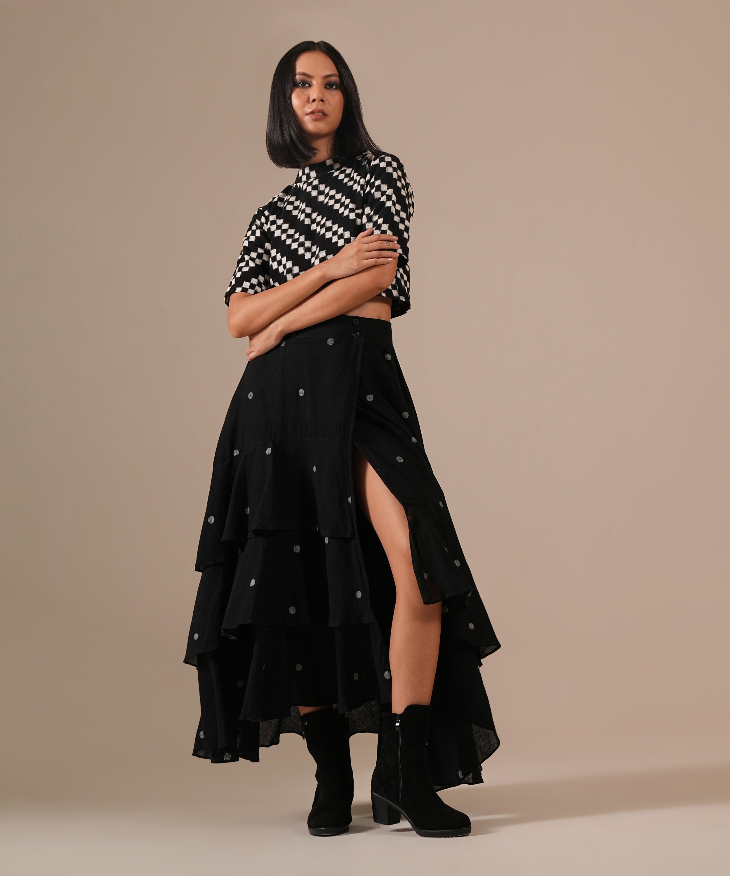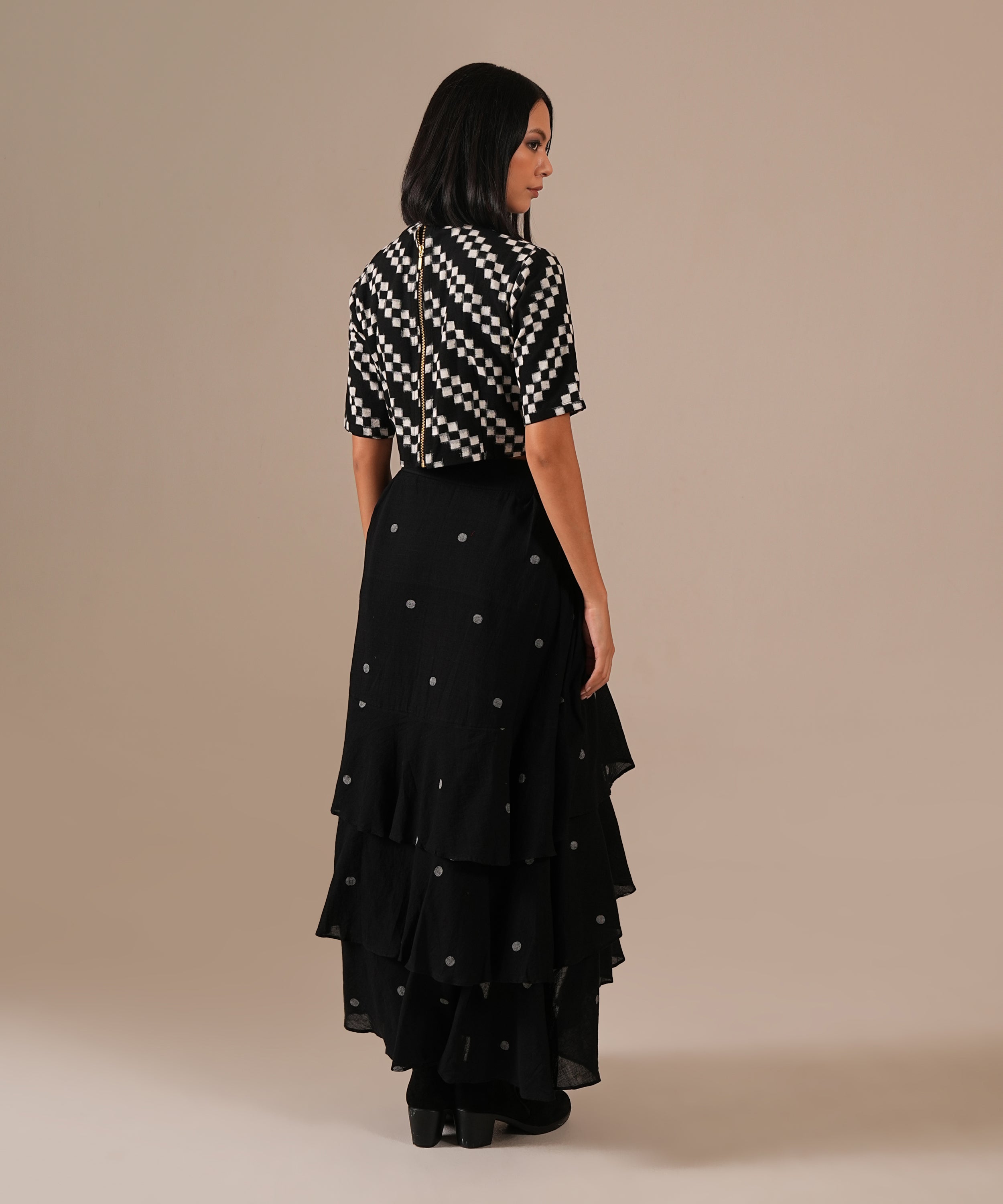 An exquisite amalgamation of handwoven Ikat and delicate Jamdani, this set is a true celebration of textile artistry. The Ikat blouse features a structured stand collar and a sleek back zipper opening, lending a modern edge to a heritage weave. It is paired with a layered Jamdani wrap skirt, finished with a soft ruffled hem that adds graceful movement and feminine charm. Striking yet timeless, this ensemble is designed to stand out — a piece that feels as special as the craft it carries.