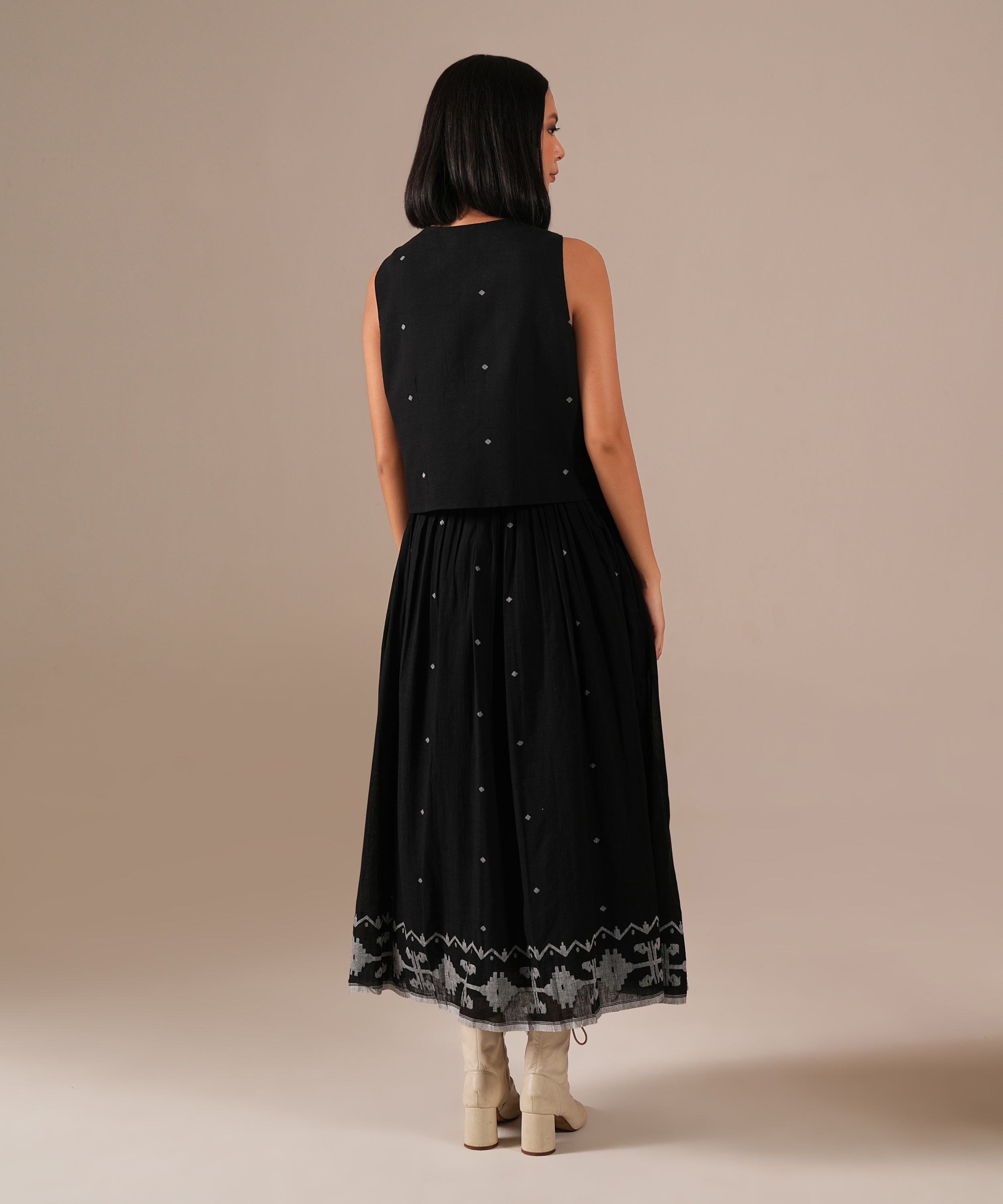 A classic Jamdani ensemble featuring a fit-and-flare dress with adjustable straps and back zipper fastening, paired with a tailored waistcoat accentuated by contrast lining. Handwoven by Indian artisans, it comes with a signature fabric belt and functional side pockets, a timeless blend of artisanal craftsmanship and effortless elegance.