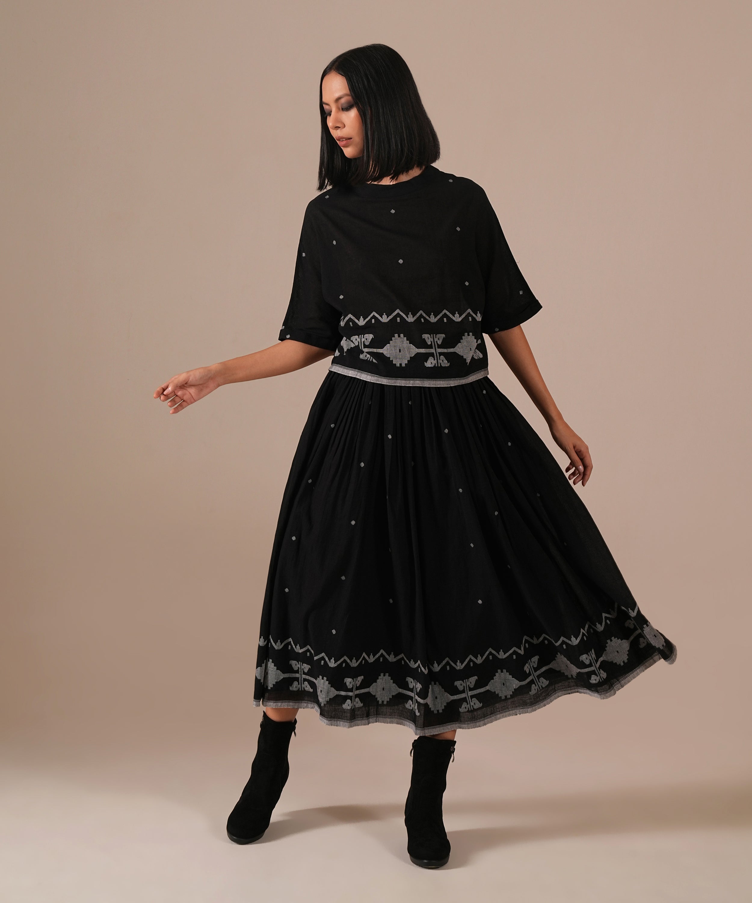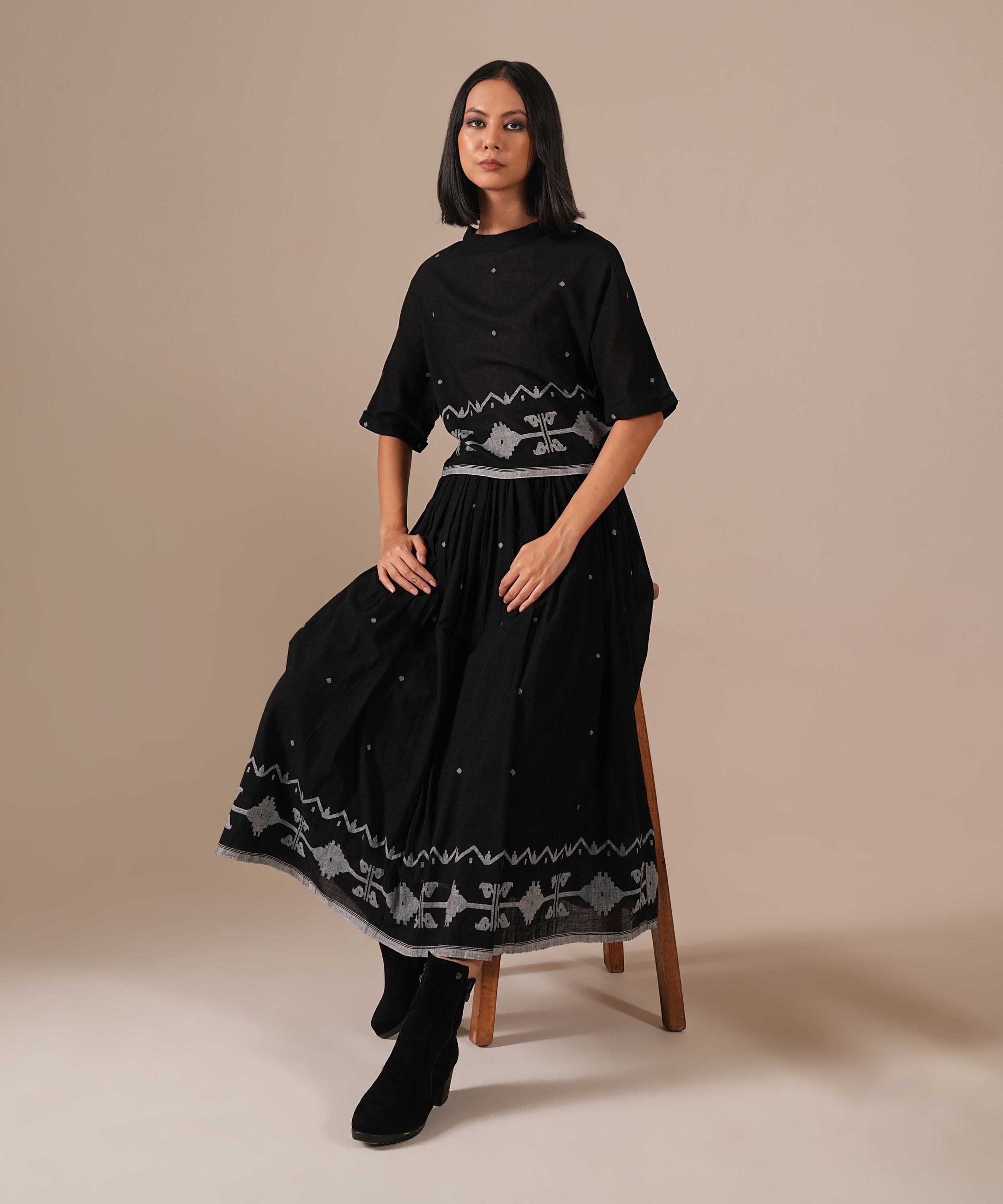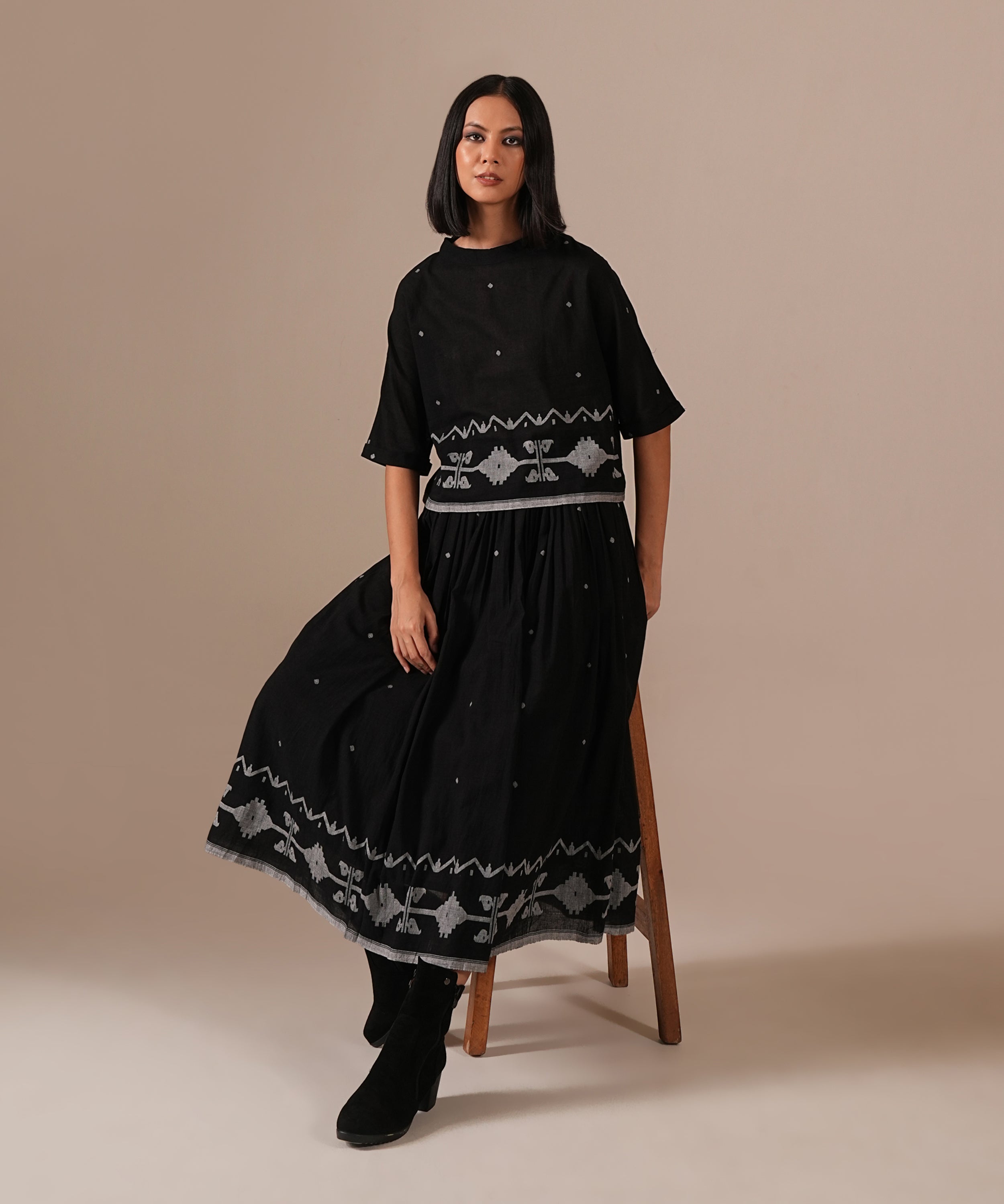 A classic jamdani co-ord set featuring jamdani gathered skirt with side pockets and a boxy top is a perfect choice for your wardrobe.