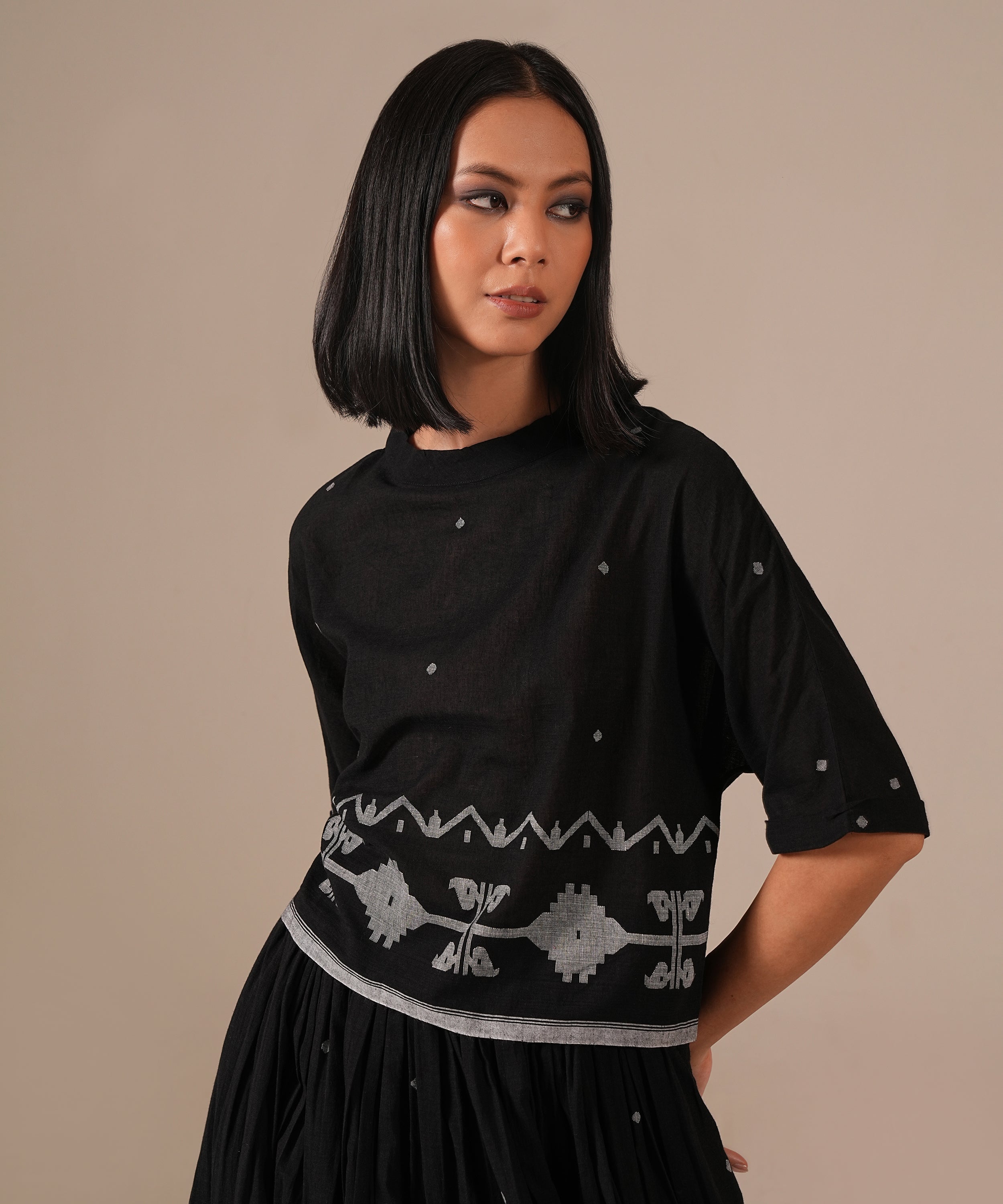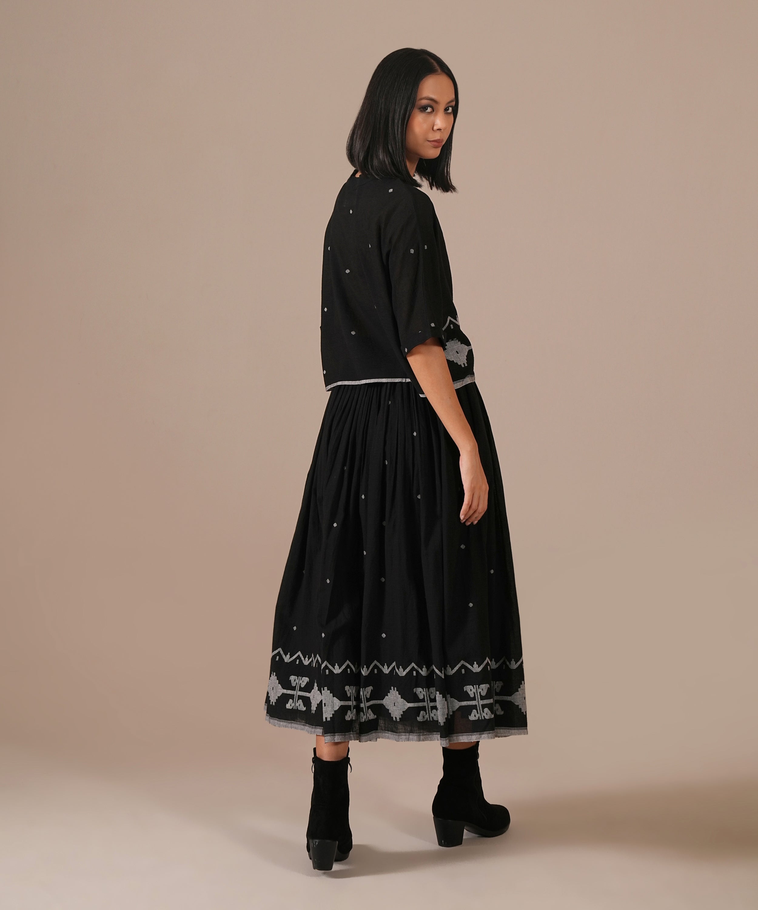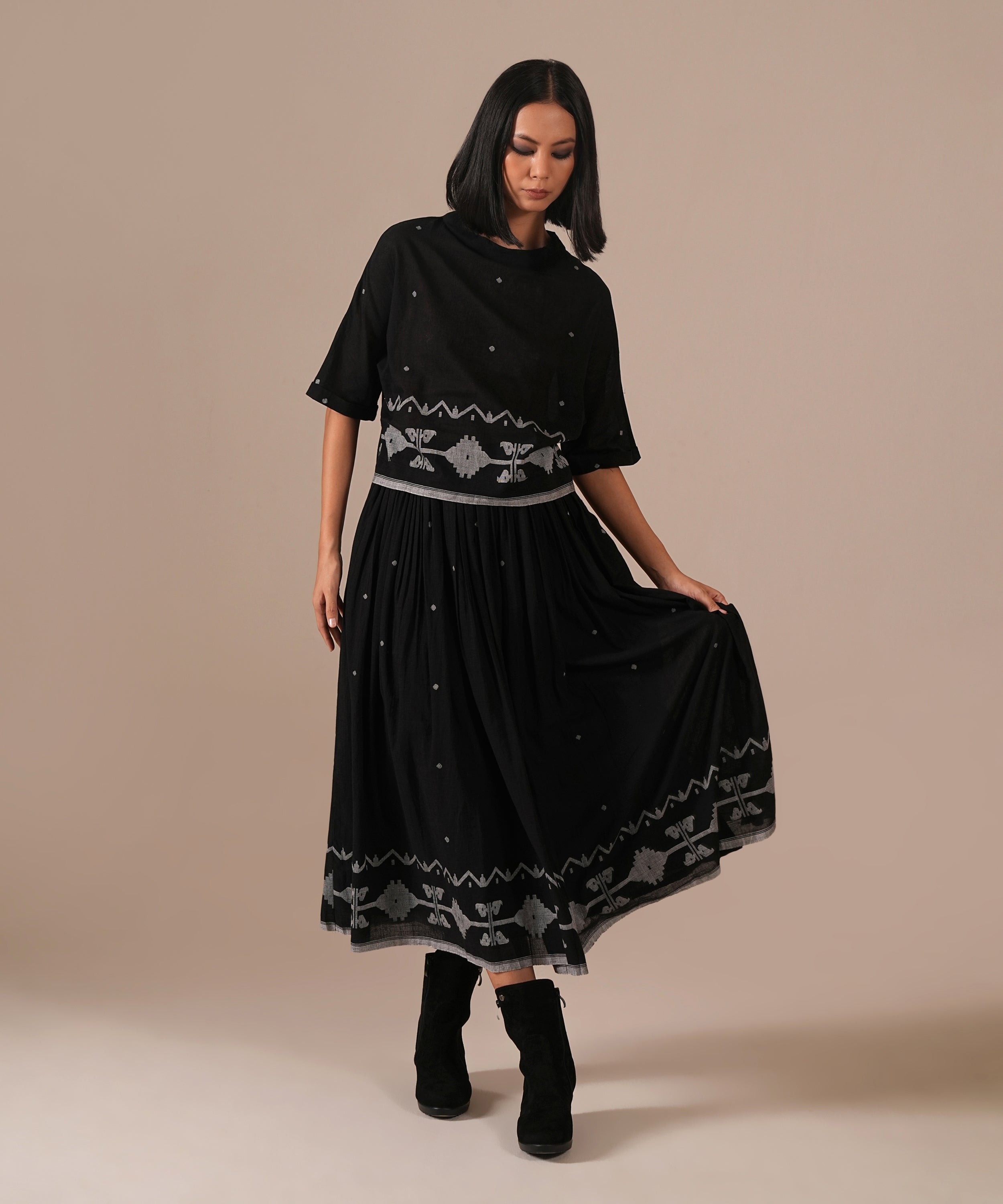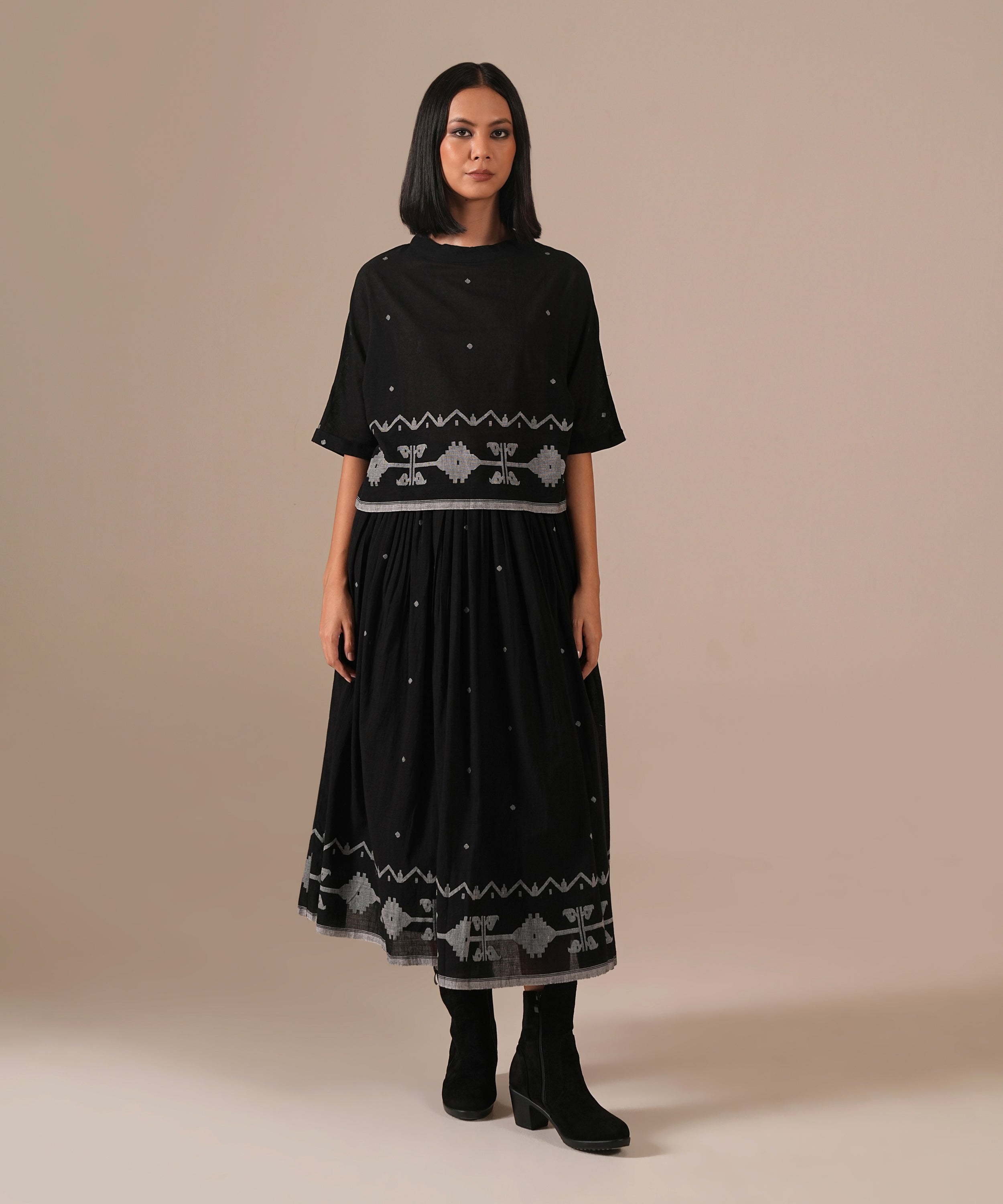 A classic jamdani co-ord set featuring jamdani gathered skirt with side pockets and a boxy top is a perfect choice for your wardrobe.