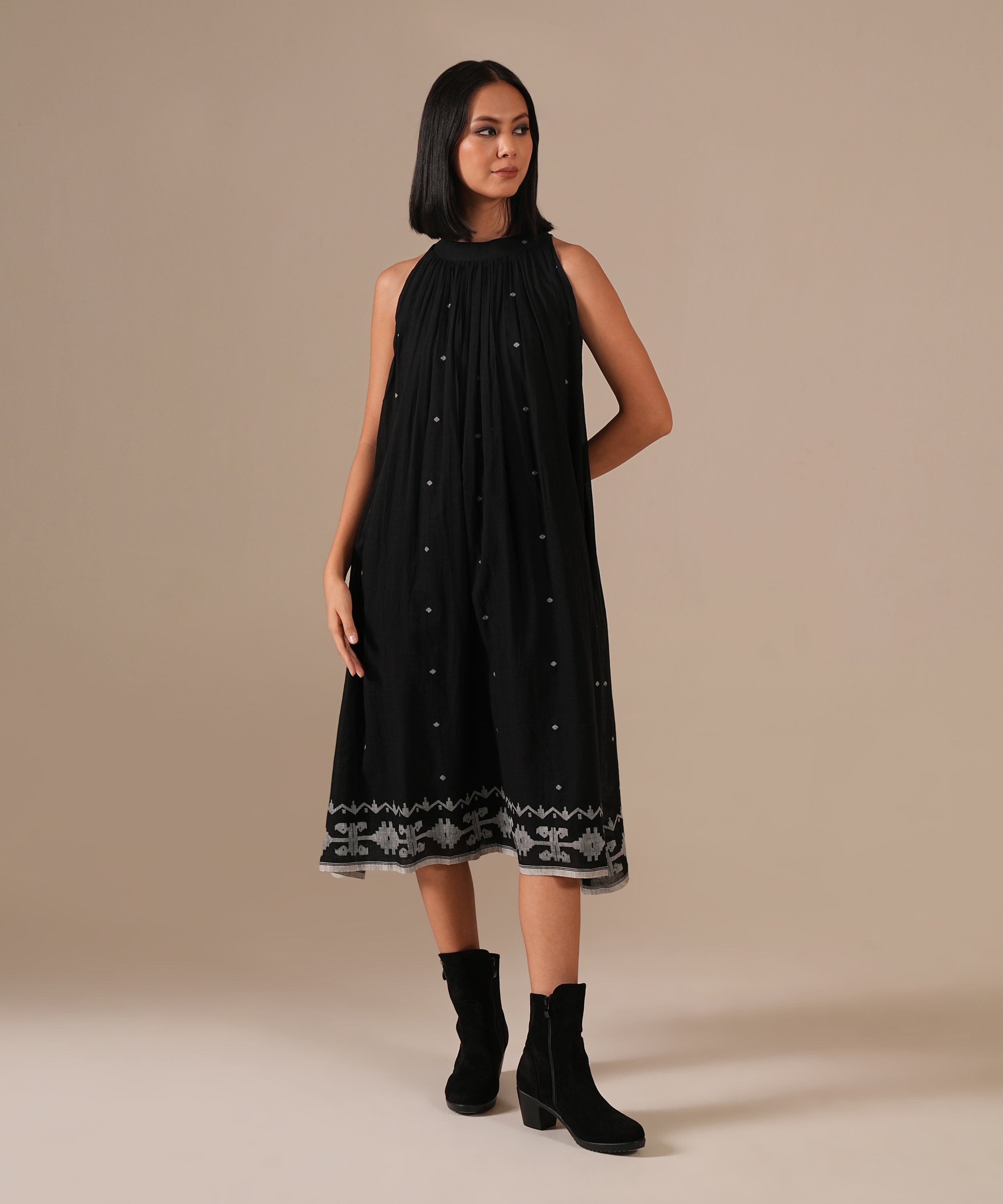 A classic jamdani gathered dress featuring halter neck, gentle gathers and back zipper is perfect for the summer wanderers. Handwoven by Indian artisans, the dress also comes with attached lining and side pockets.