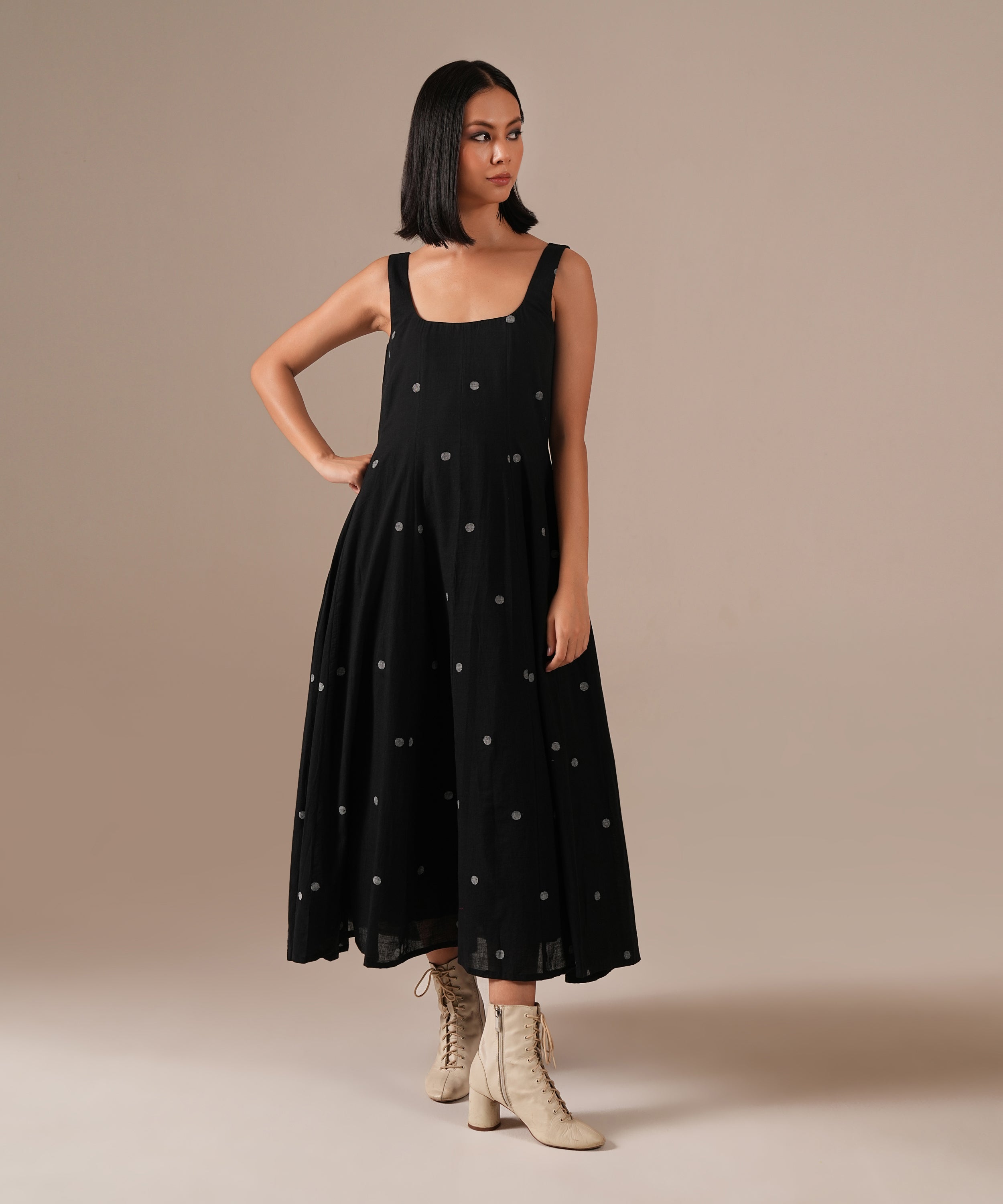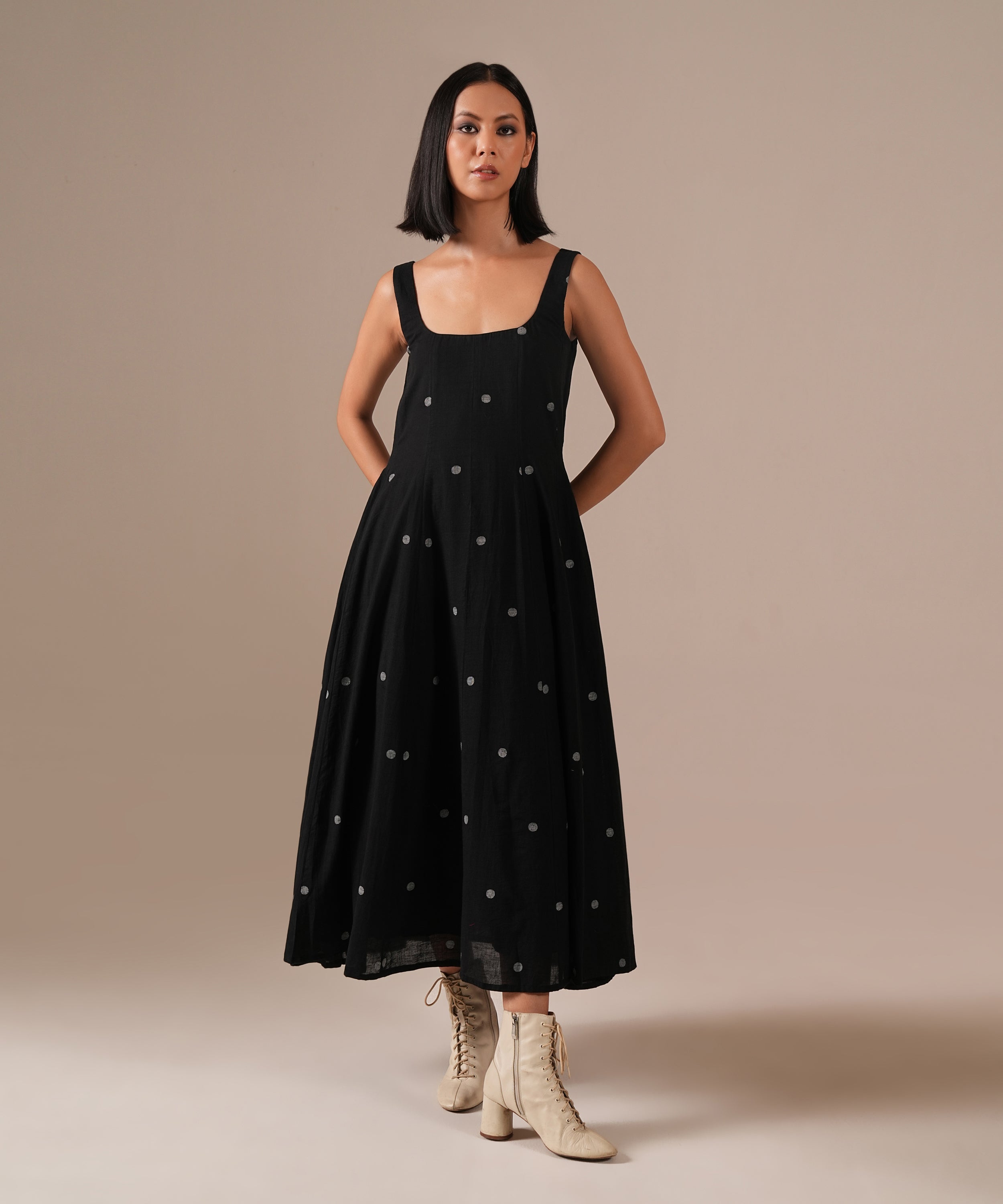 The jamdani fit-and-flare dress featuring a deep square neck, back zipper fastening, and kali/panel detailing is perfect for your summer. Handwoven by Indian artisans, the dress comes with side pockets.