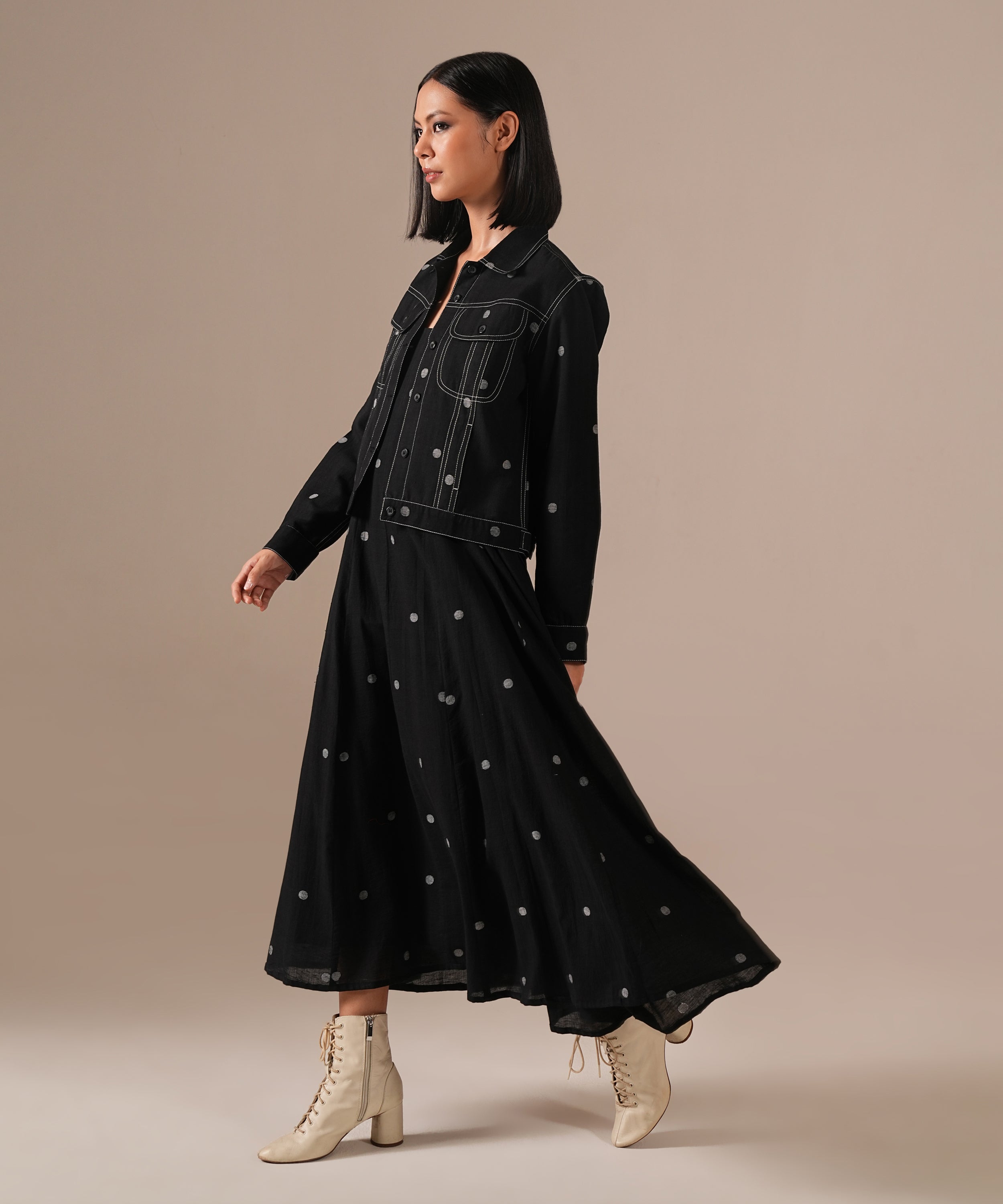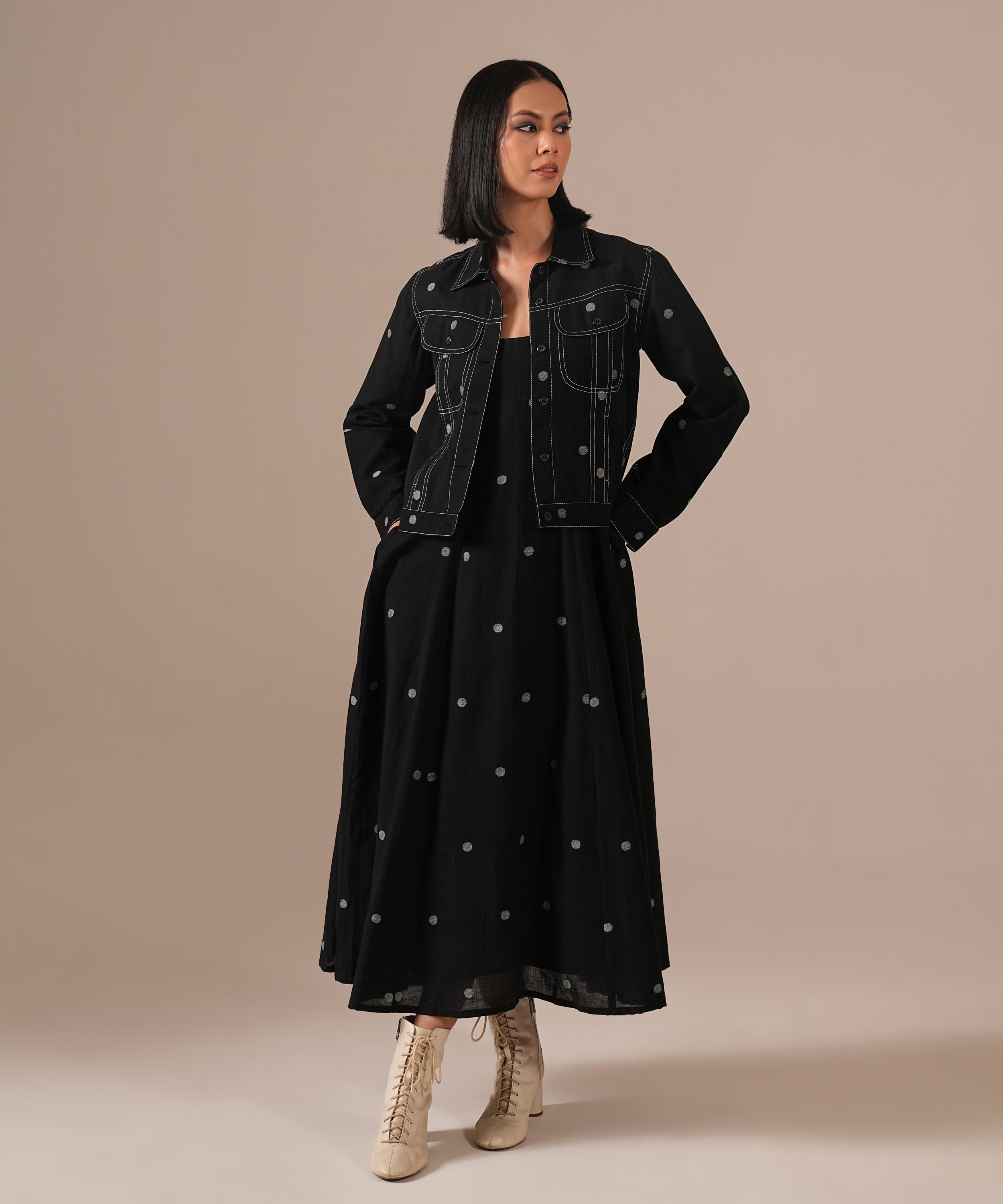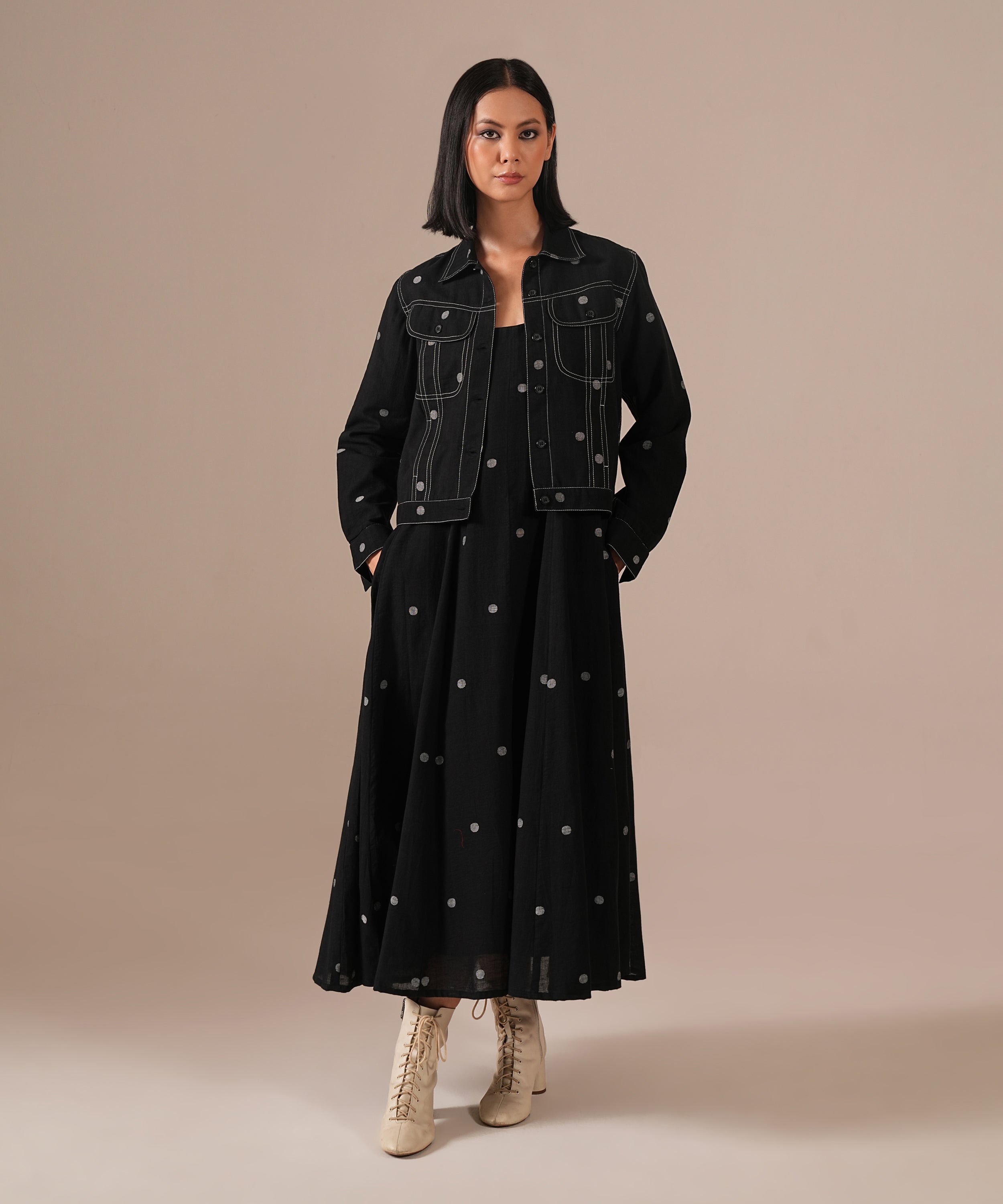 A Jamdani fit-and-flare ensemble featuring a deep square-neck dress with back zipper fastening, kali panel detailing, and functional side pockets. It is paired with a denim-inspired Jamdani co-ord jacket, reimagining the timeless weave with a modern denim aesthetic. Handwoven by Indian artisans, this set beautifully blends tradition with contemporary design.