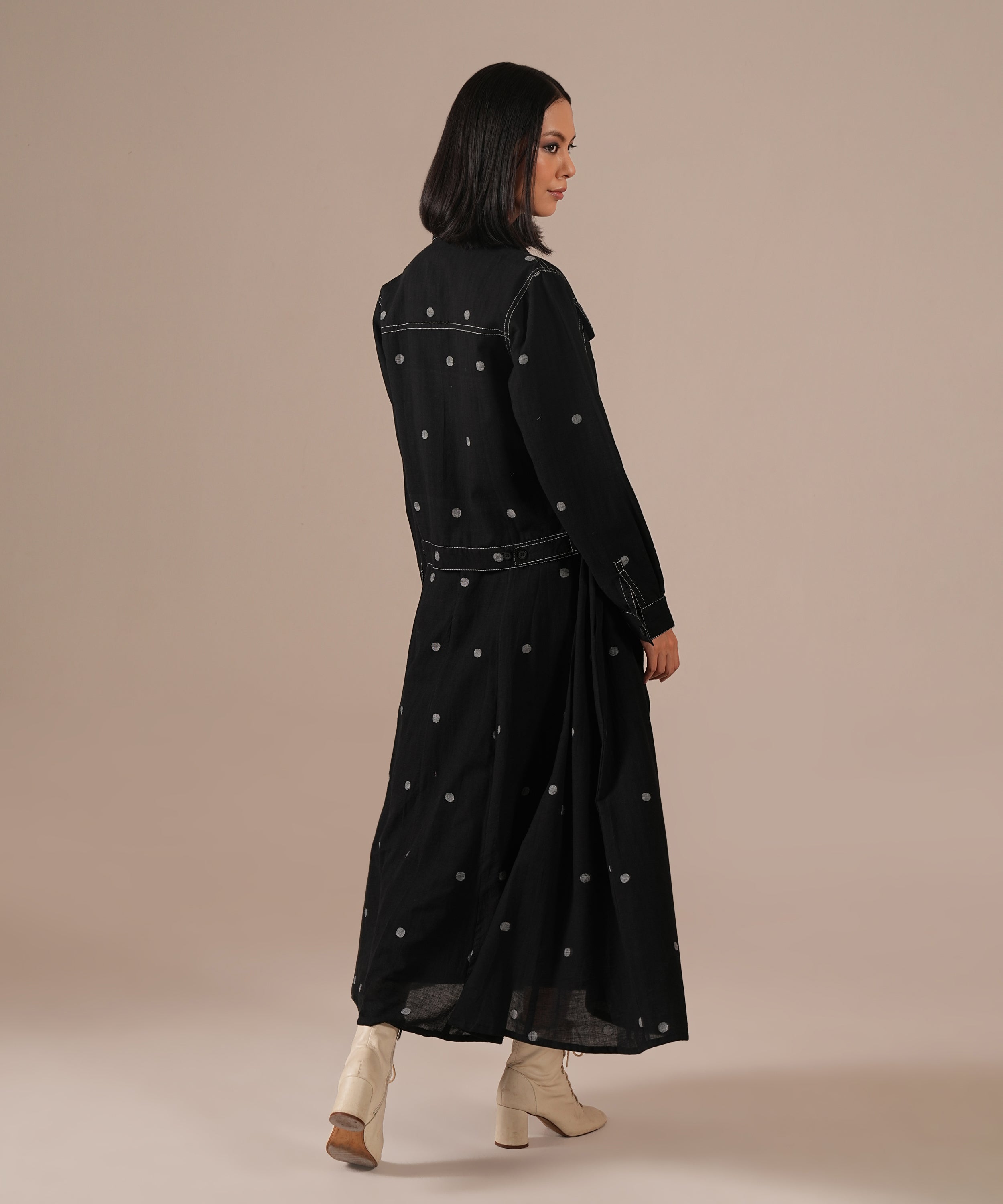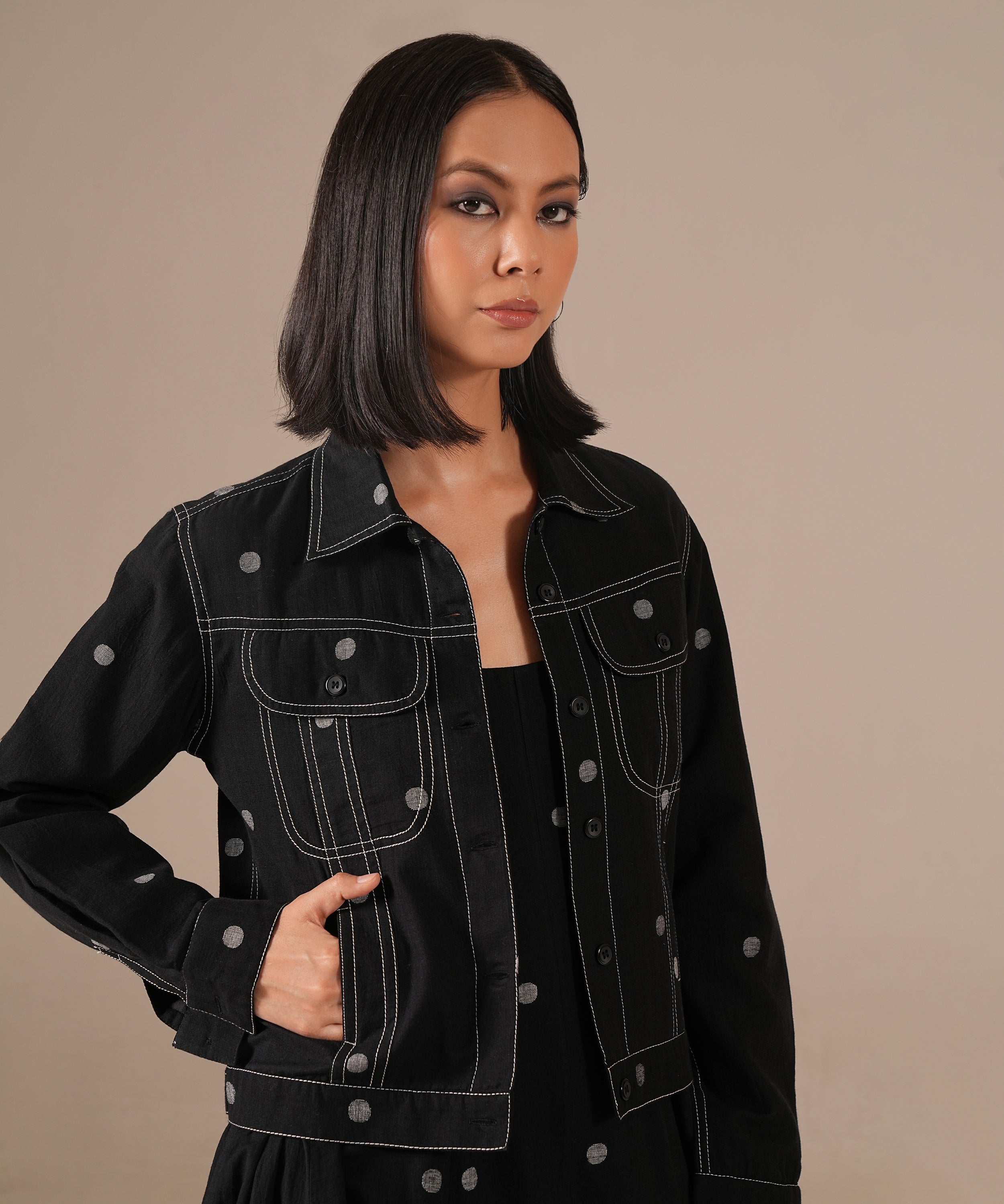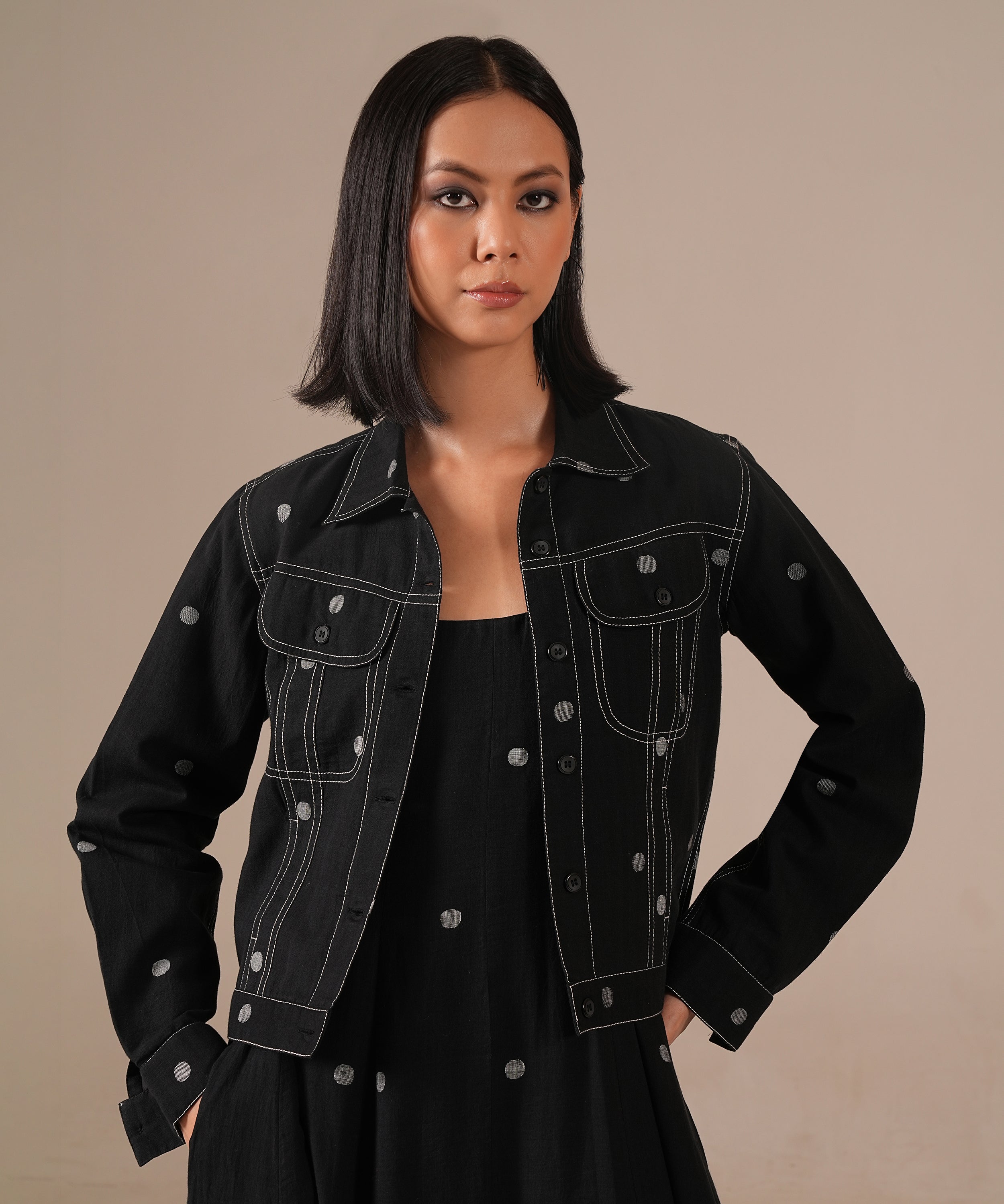 A Jamdani fit-and-flare ensemble featuring a deep square-neck dress with back zipper fastening, kali panel detailing, and functional side pockets. It is paired with a denim-inspired Jamdani co-ord jacket, reimagining the timeless weave with a modern denim aesthetic. Handwoven by Indian artisans, this set beautifully blends tradition with contemporary design.