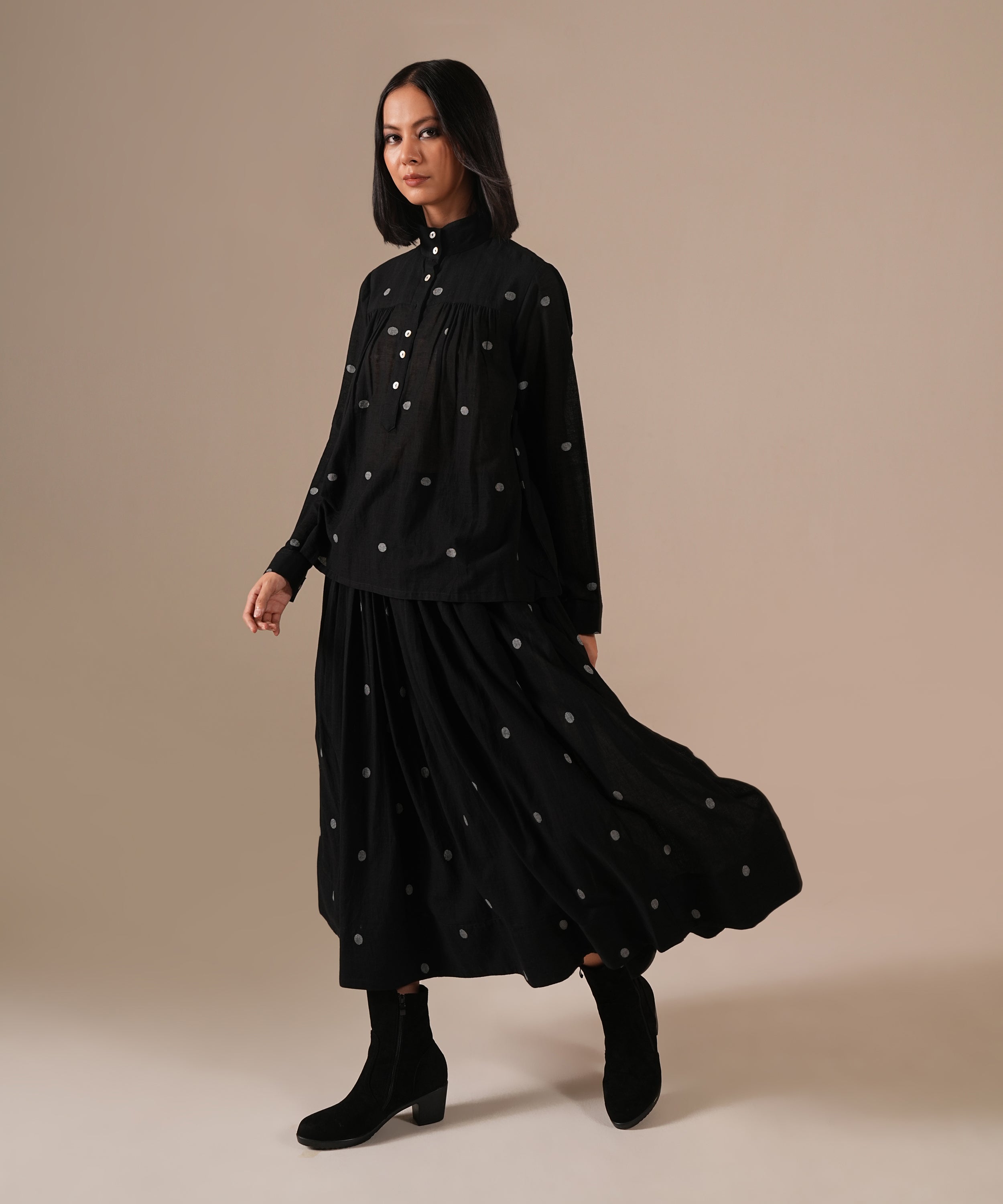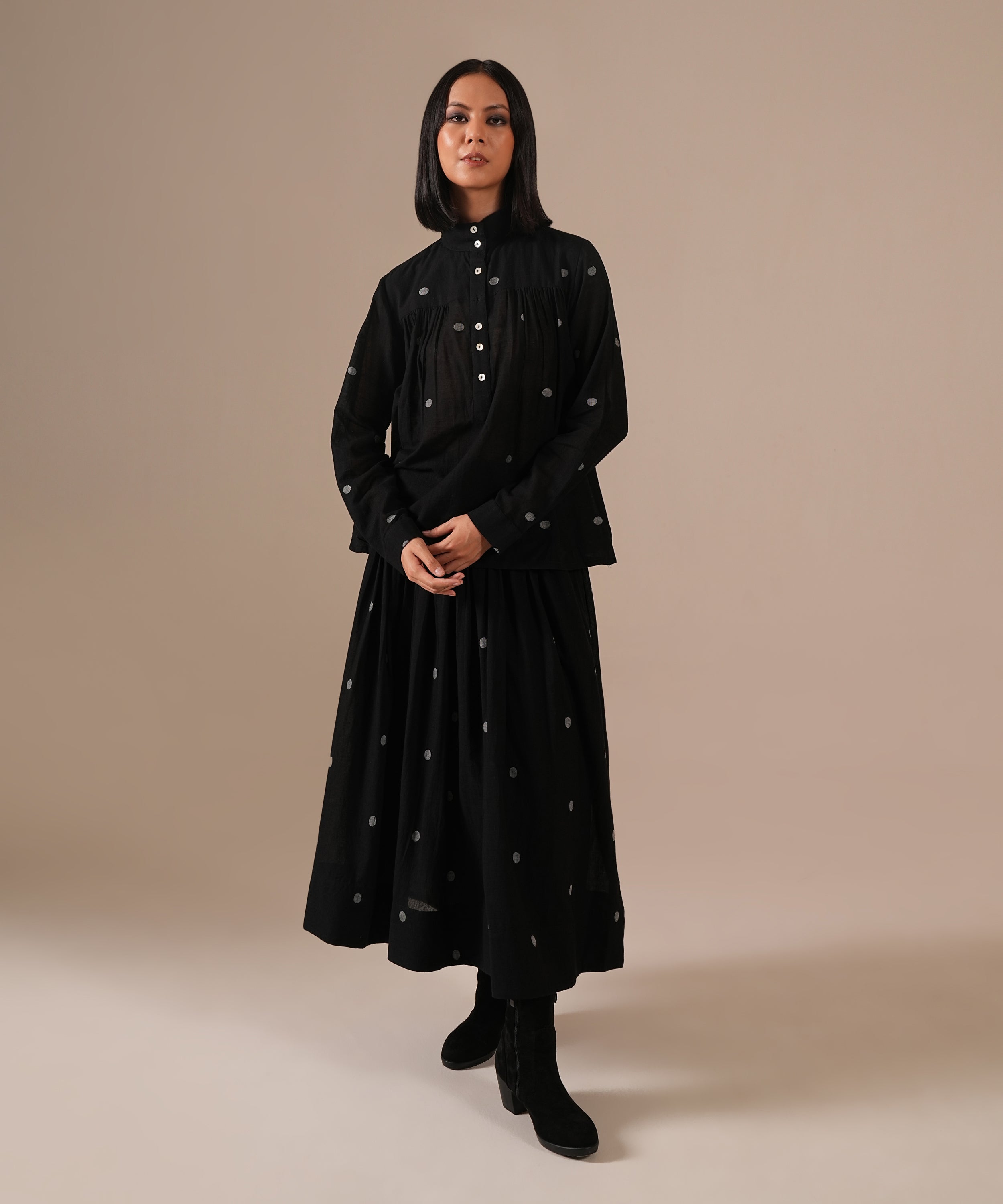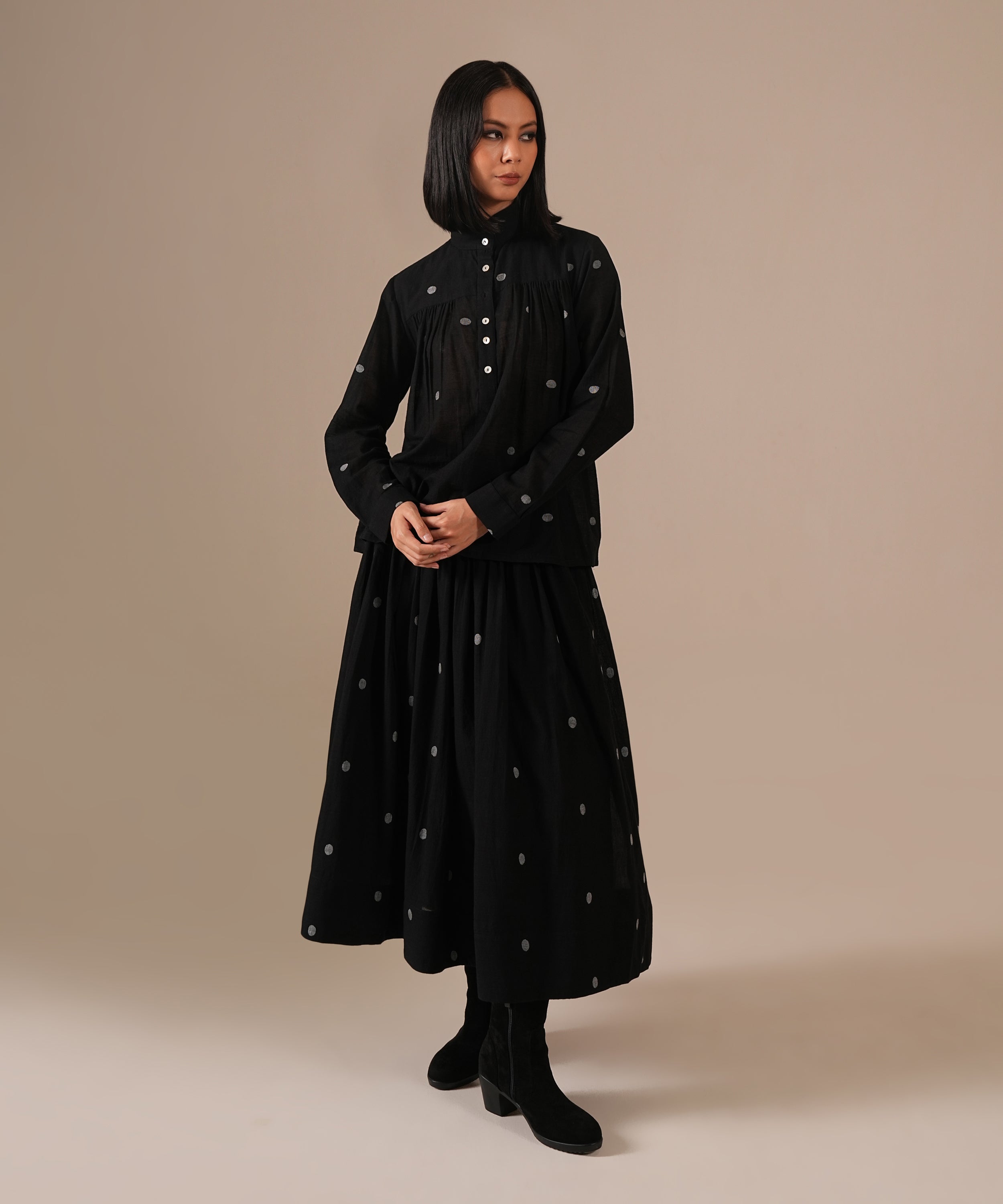 This handcrafted ensemble features a gathered skirt with side pockets and a co-ord high collared top.
