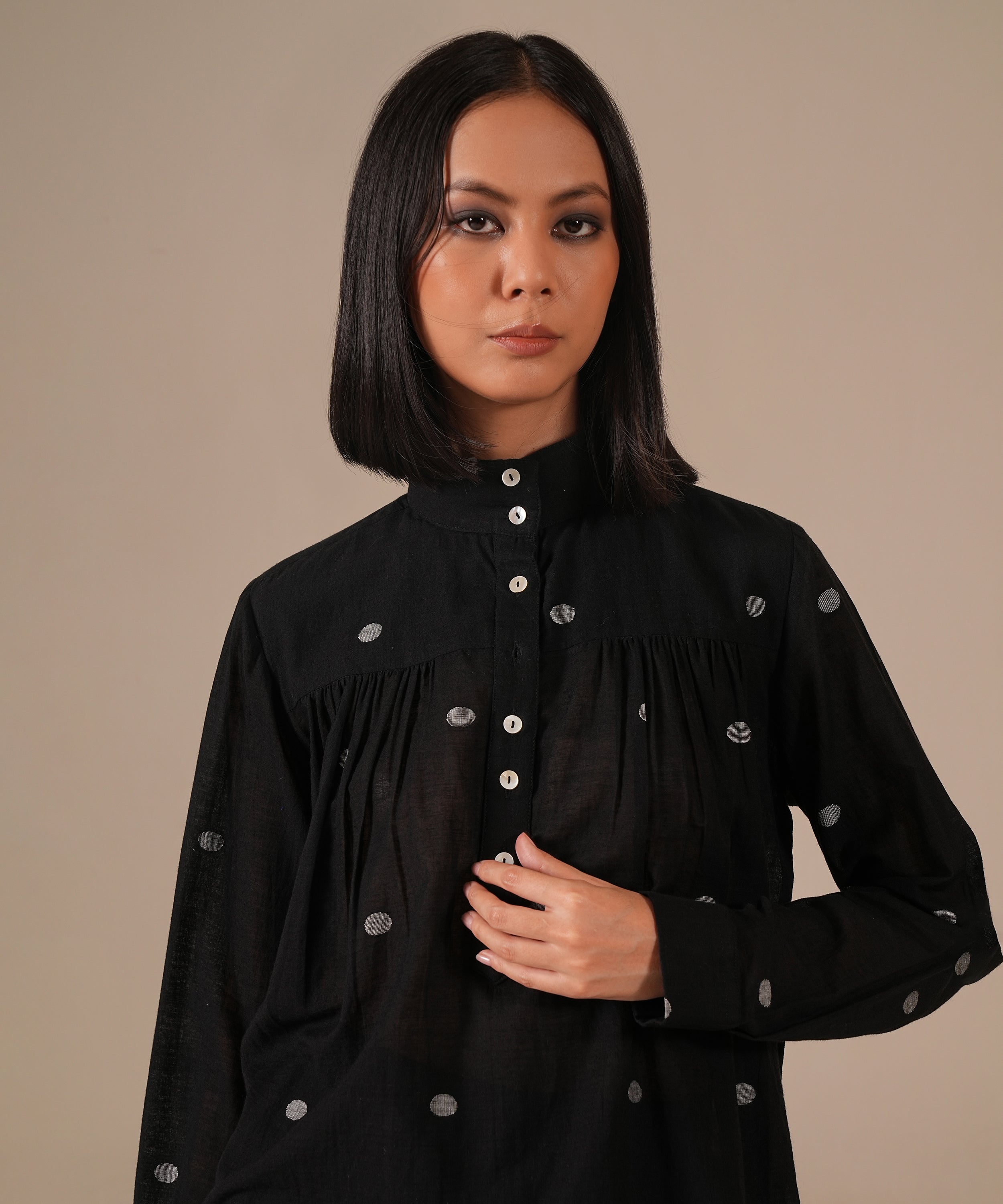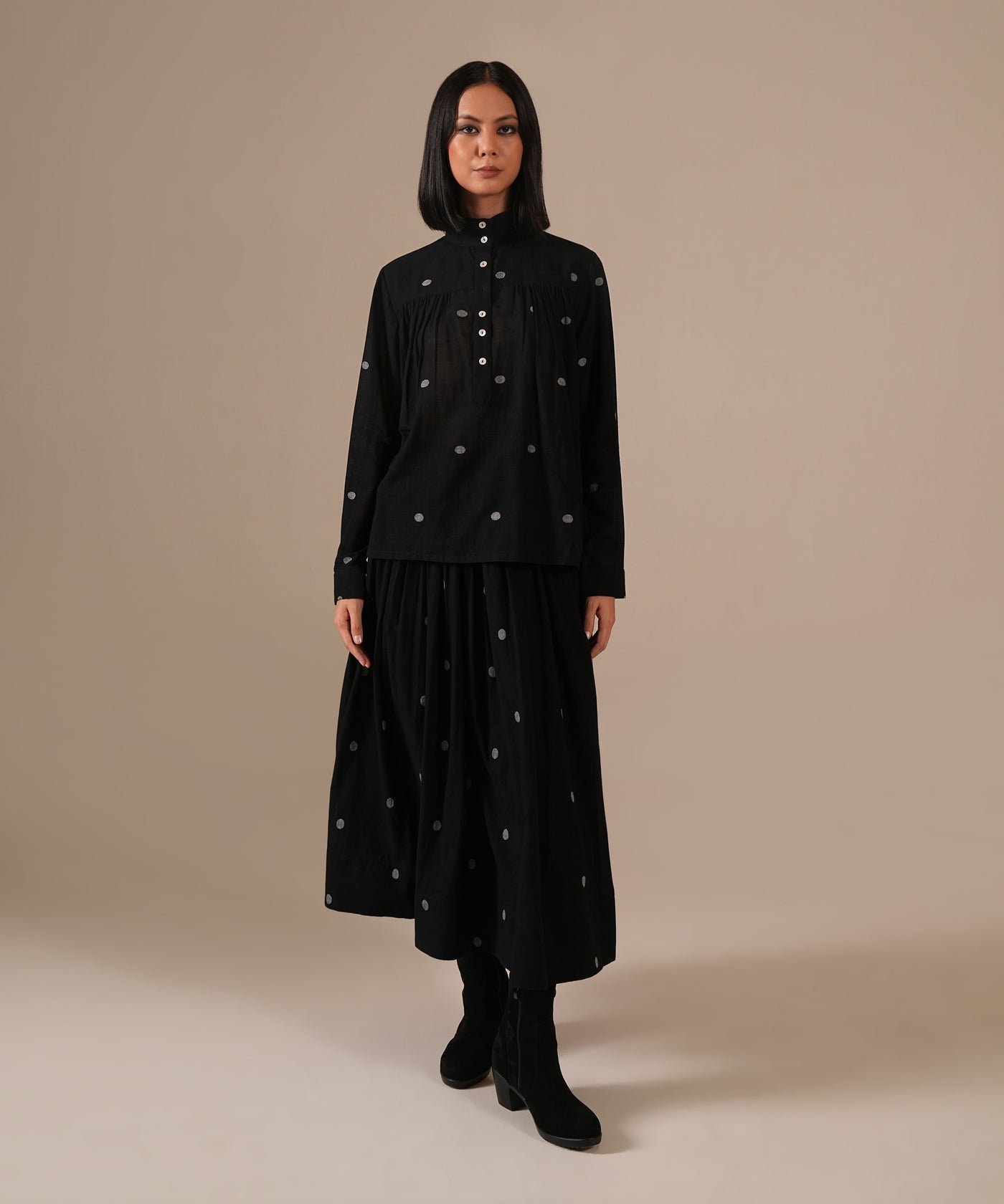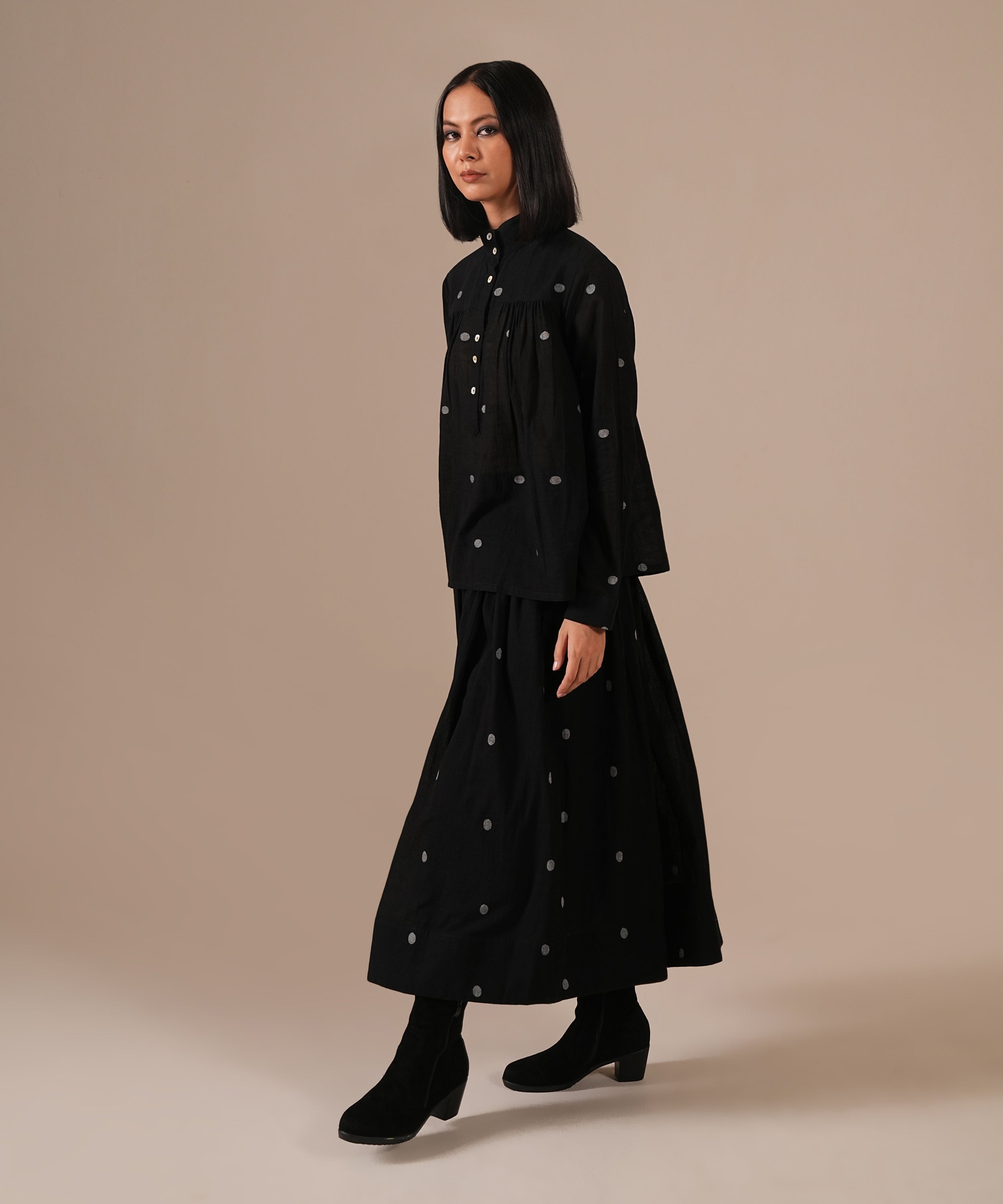 This handcrafted ensemble features a gathered skirt with side pockets and a co-ord high collared top.