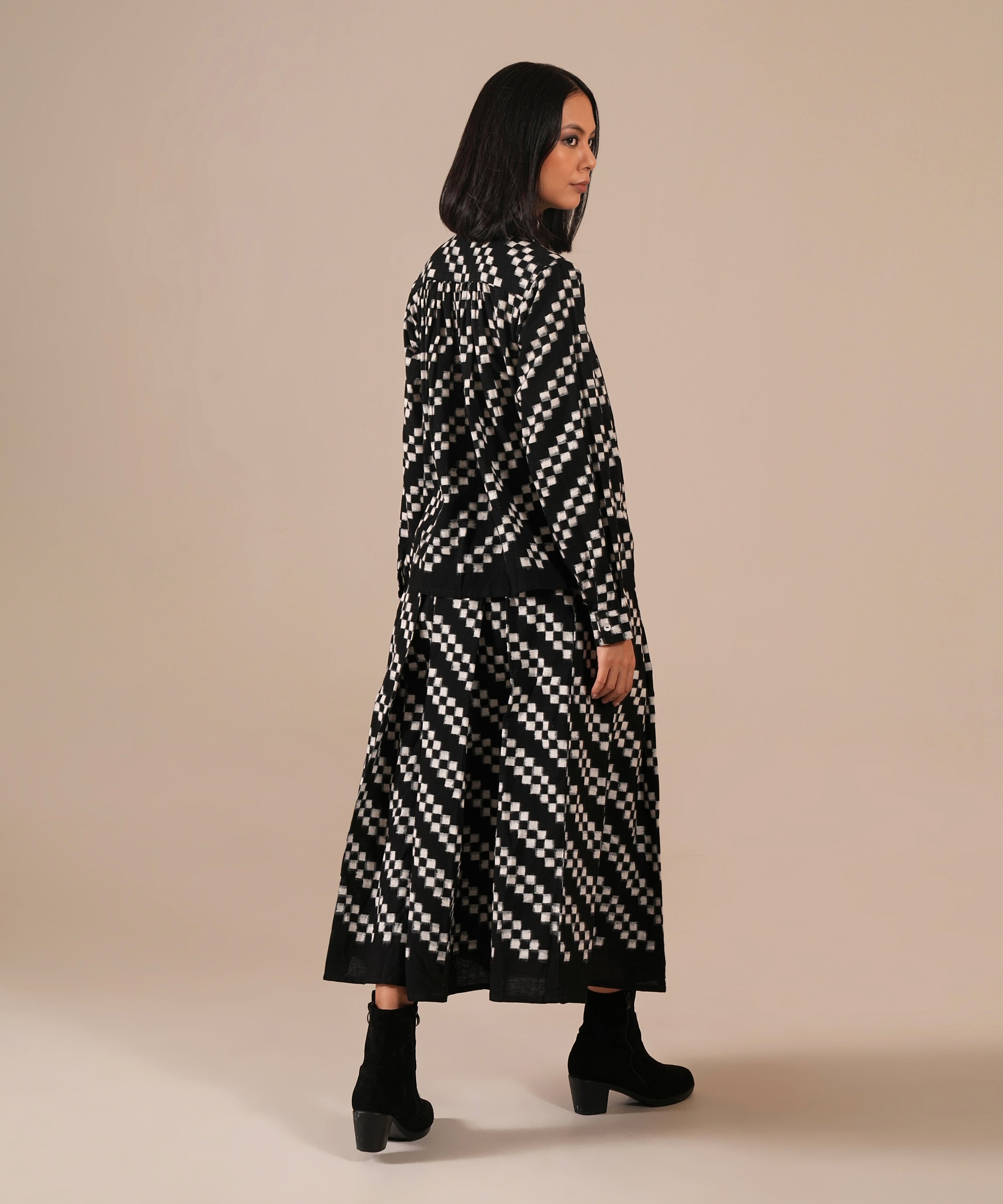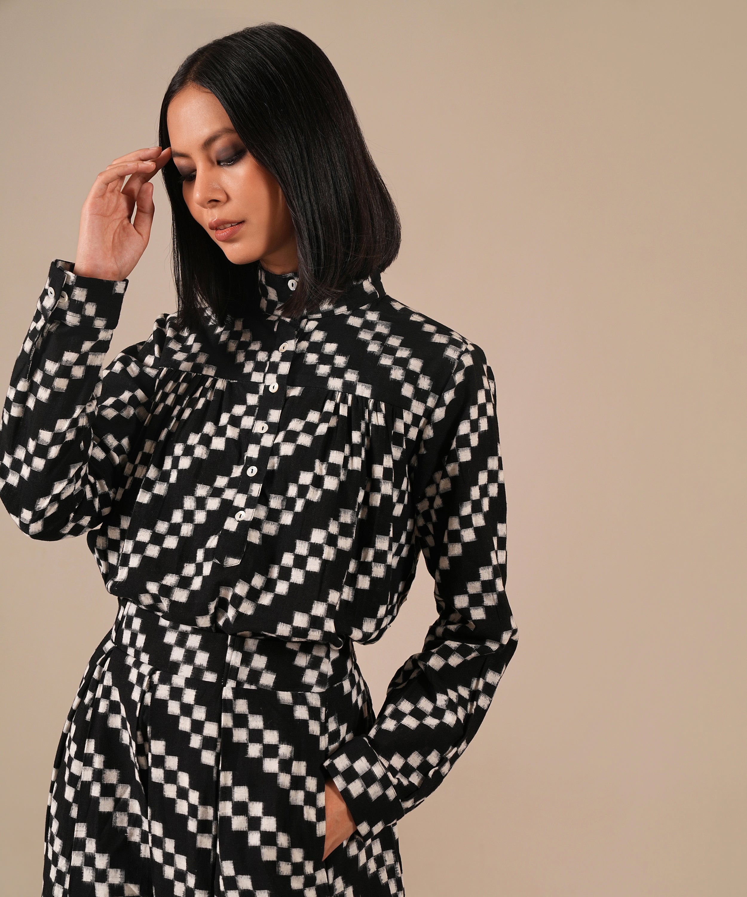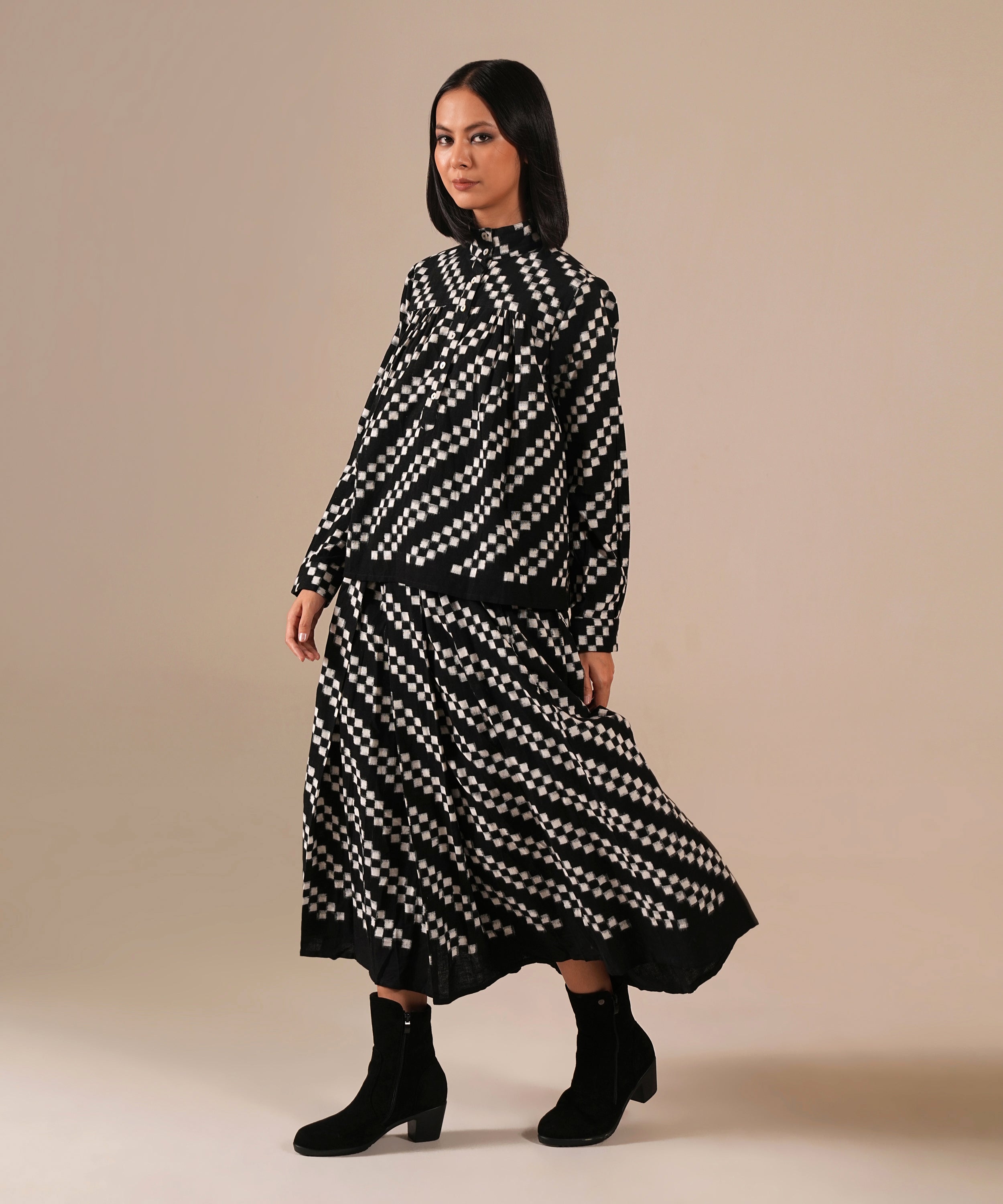 This handcrafted ensemble features a gathered skirt with side pockets and a co-ord high collared top.