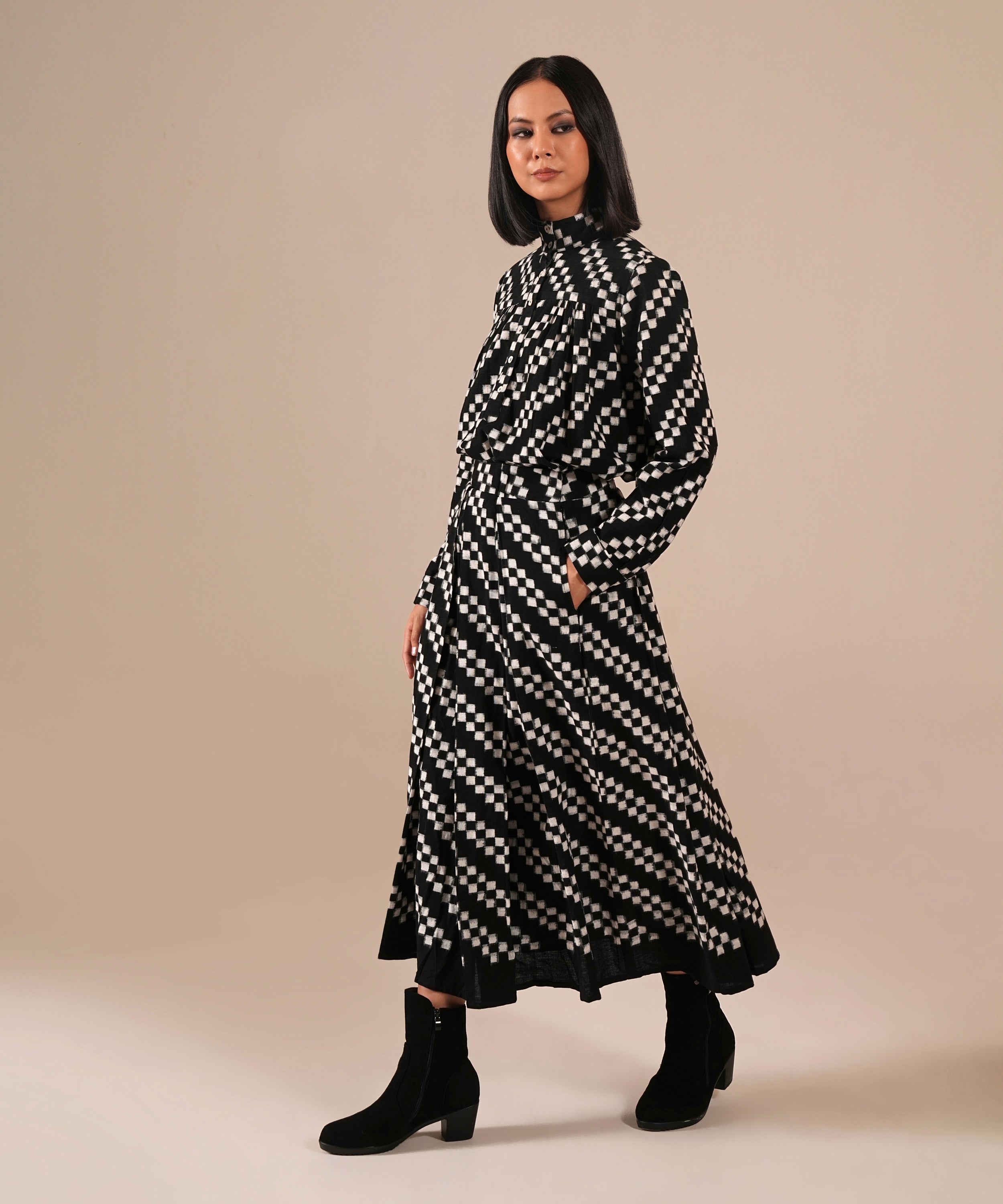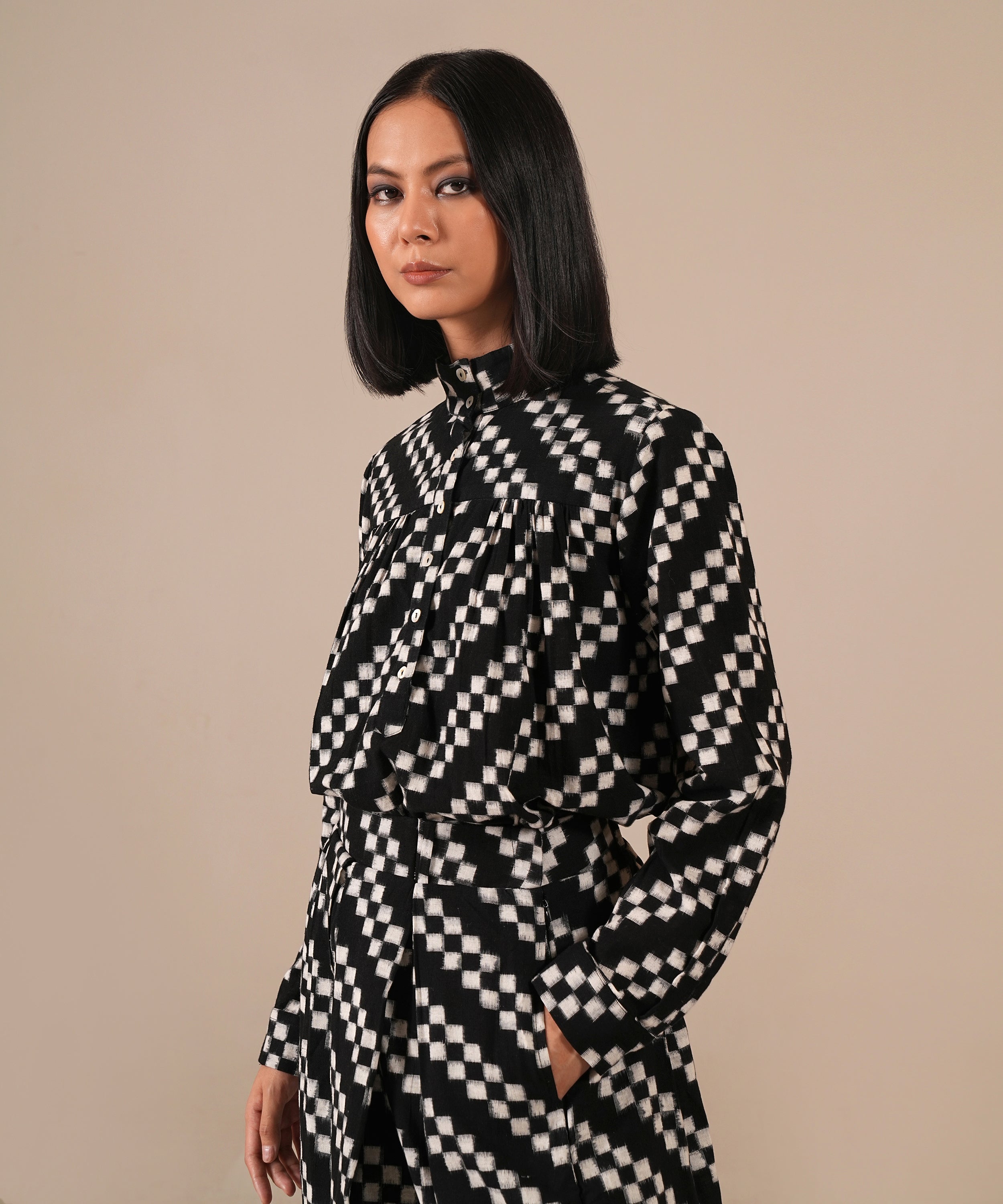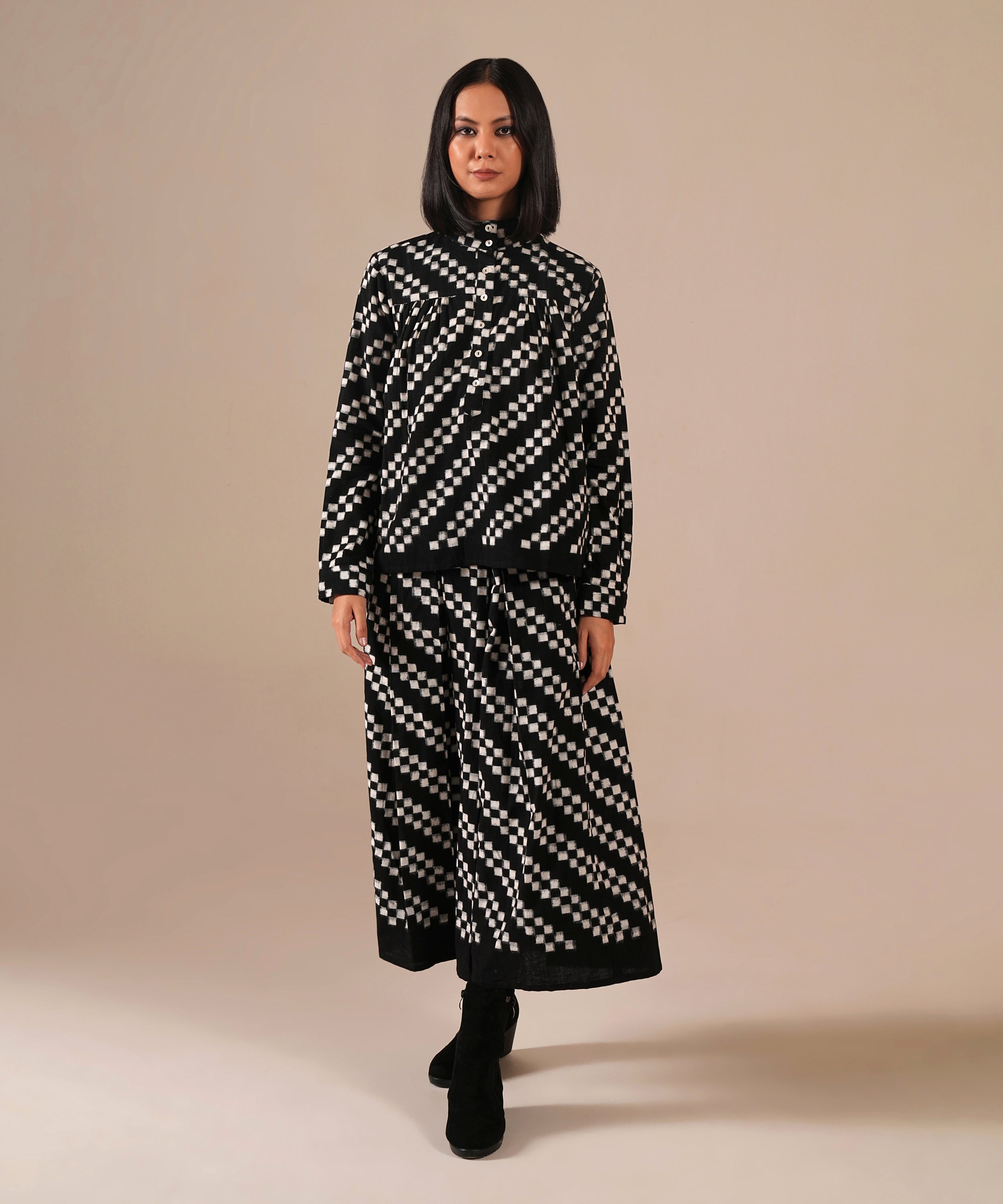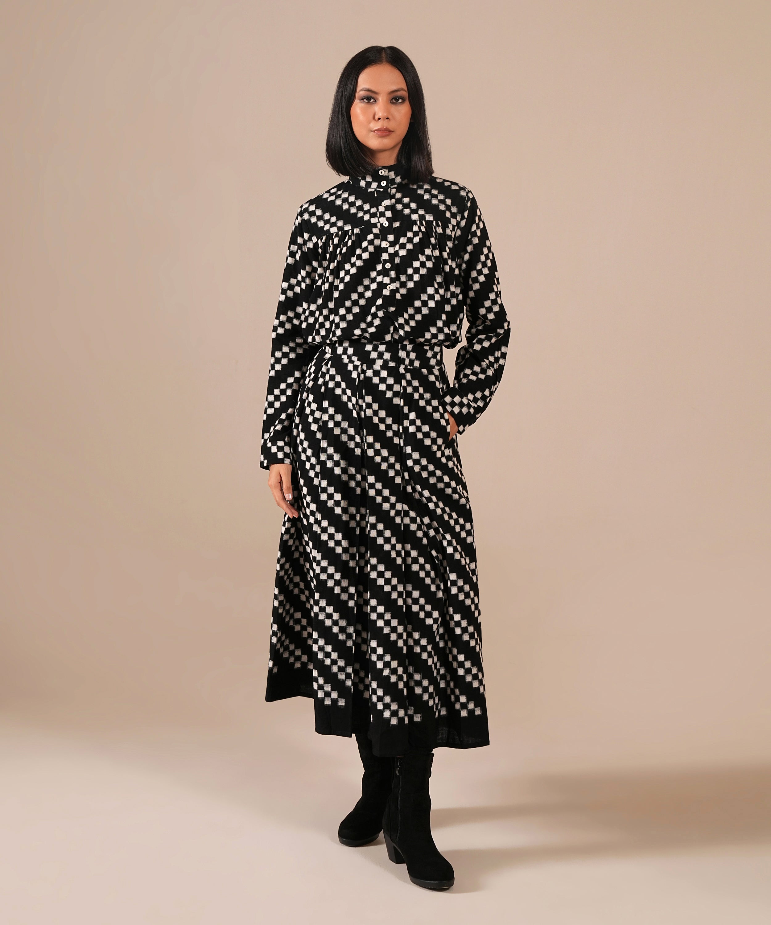 This handcrafted ensemble features a gathered skirt with side pockets and a co-ord high collared top.