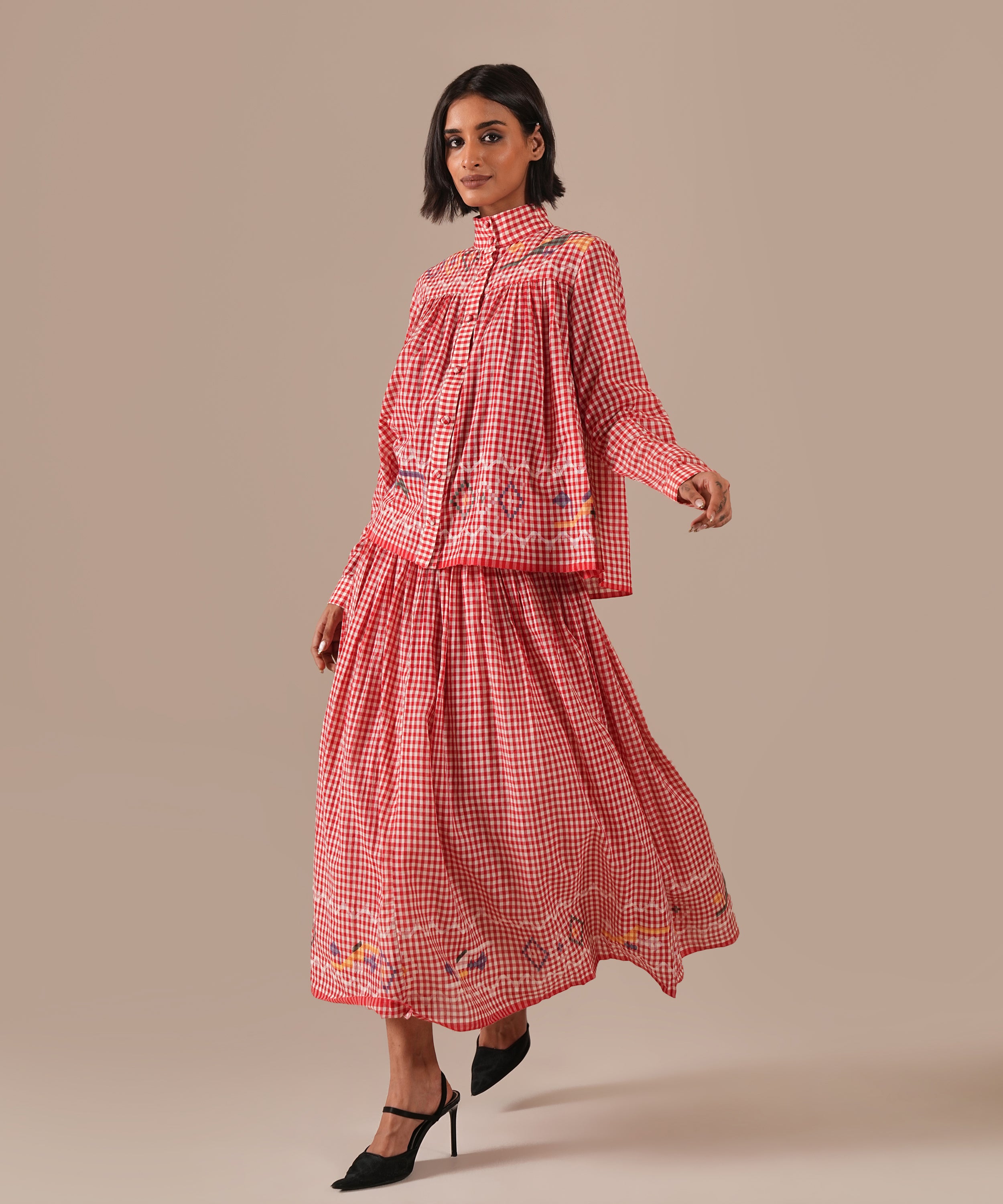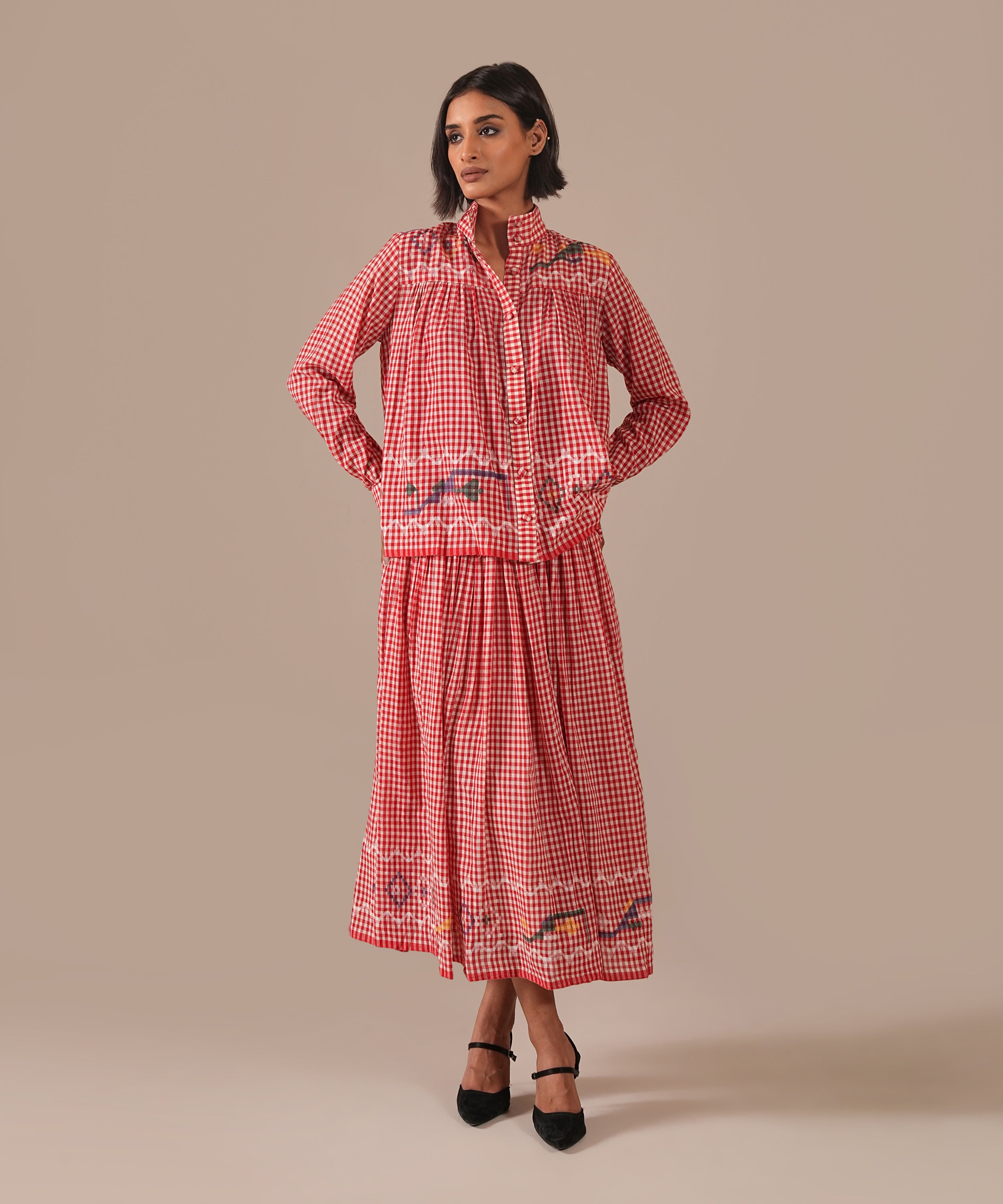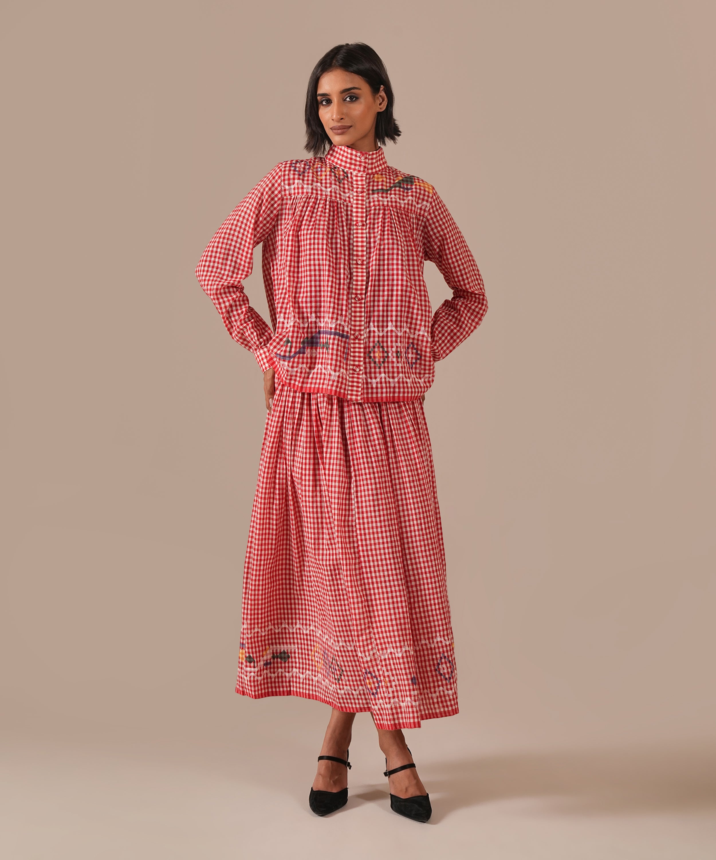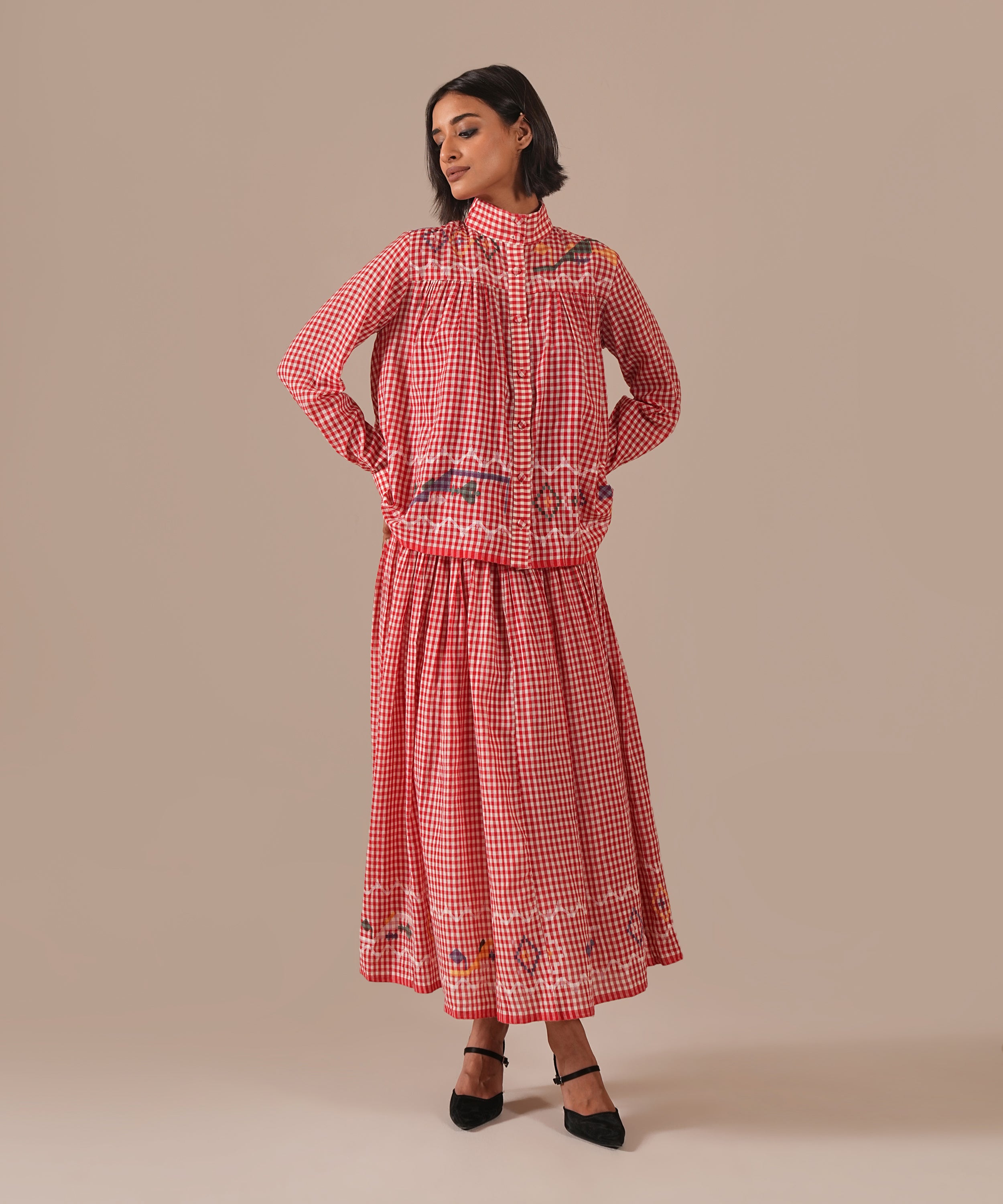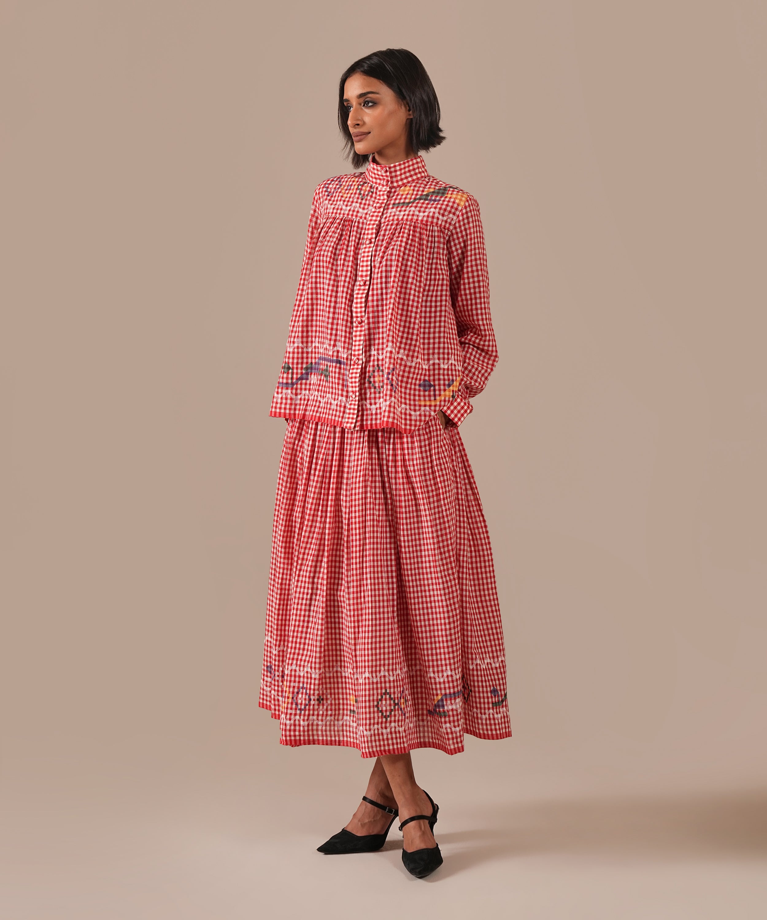 A handcrafted Jamdani ensemble with a gathered skirt, side zipper fastening, side pockets, and a co-ord high-collared shirt effortlessly refined and timeless.