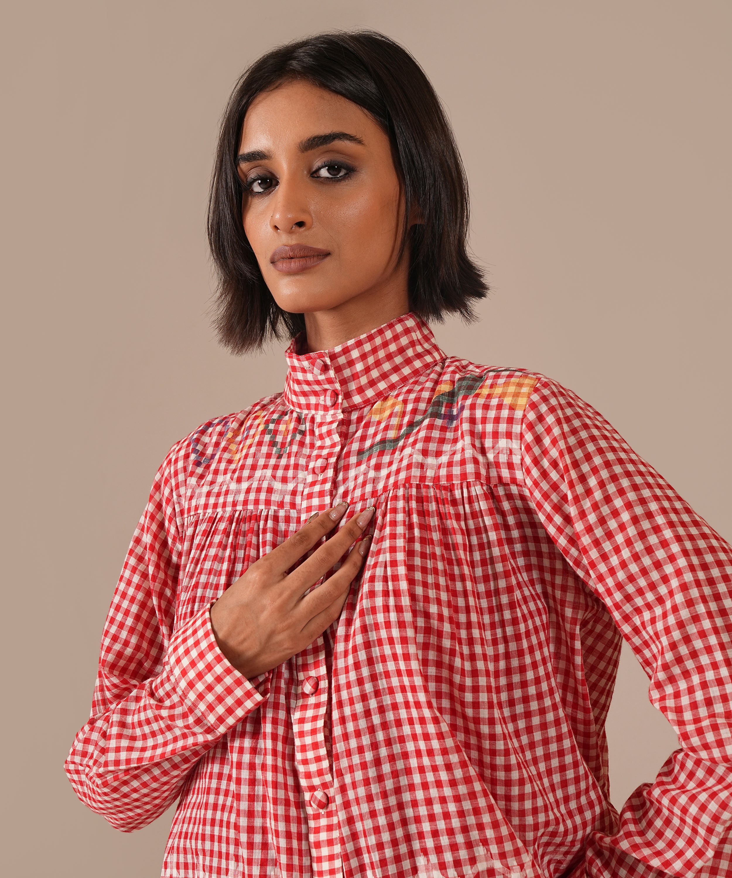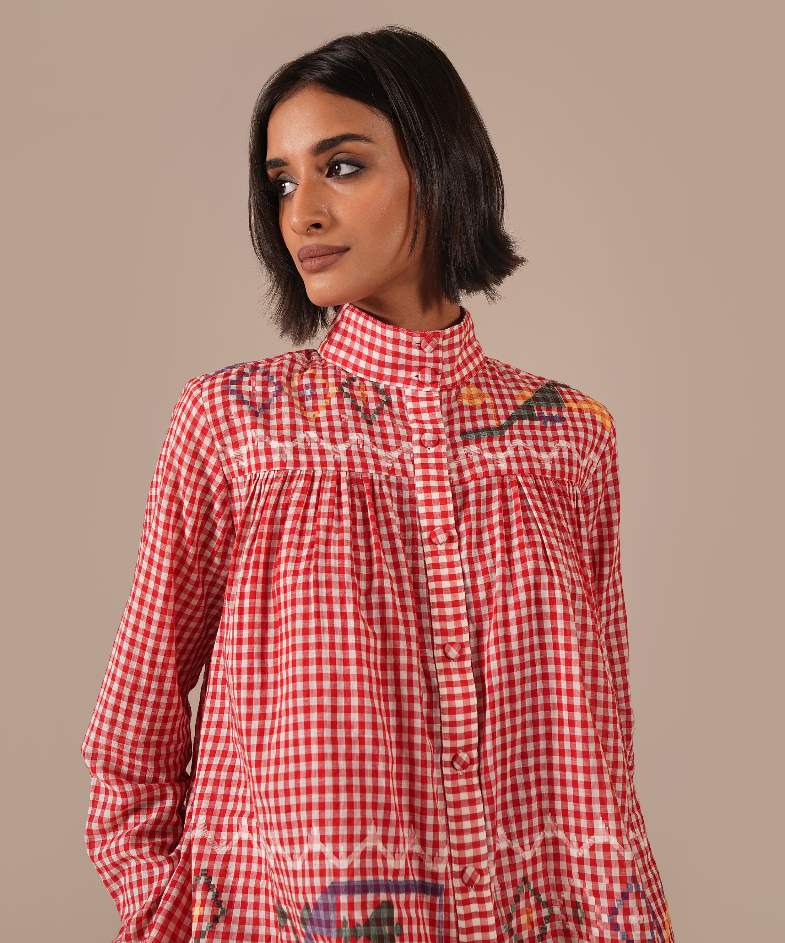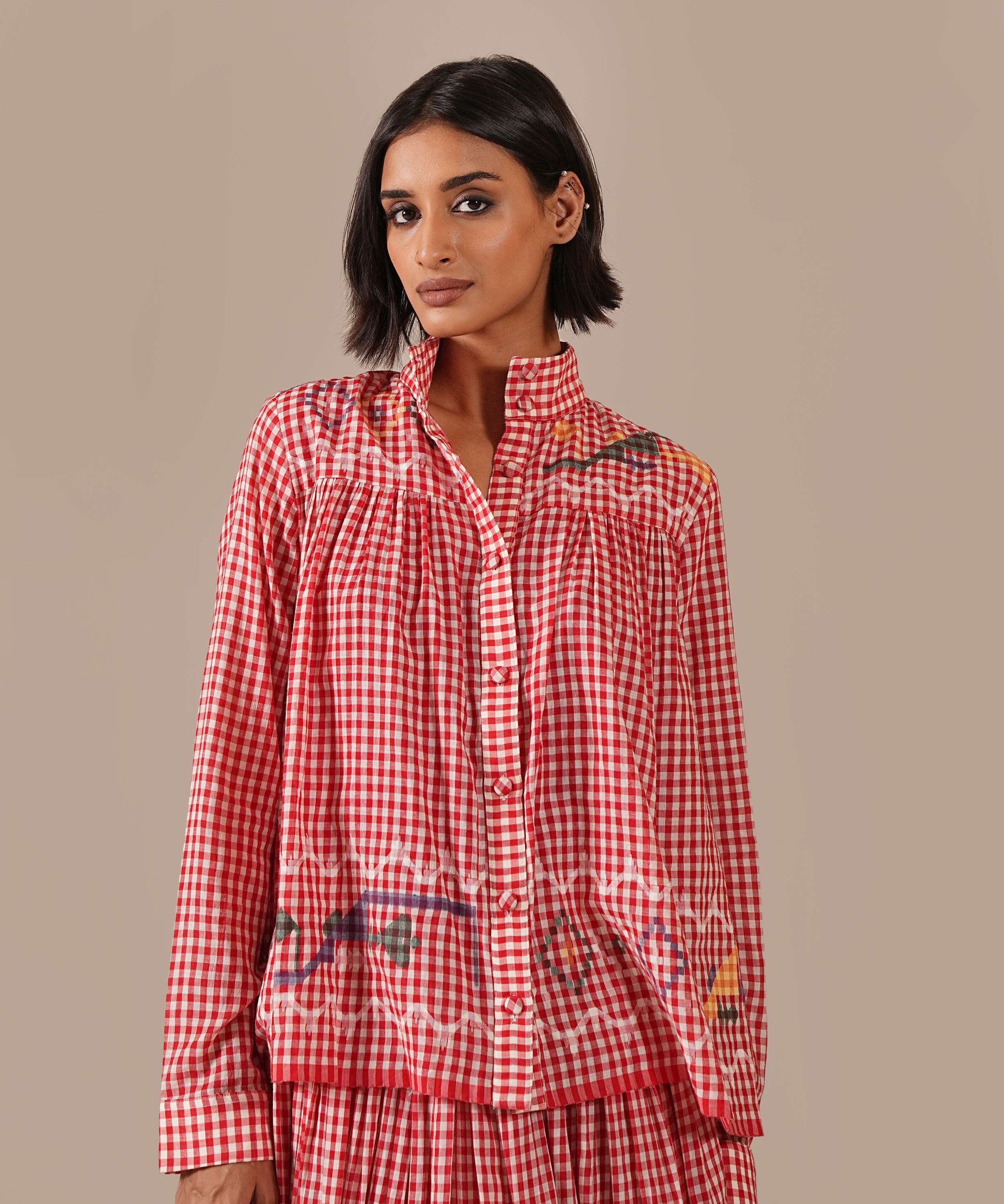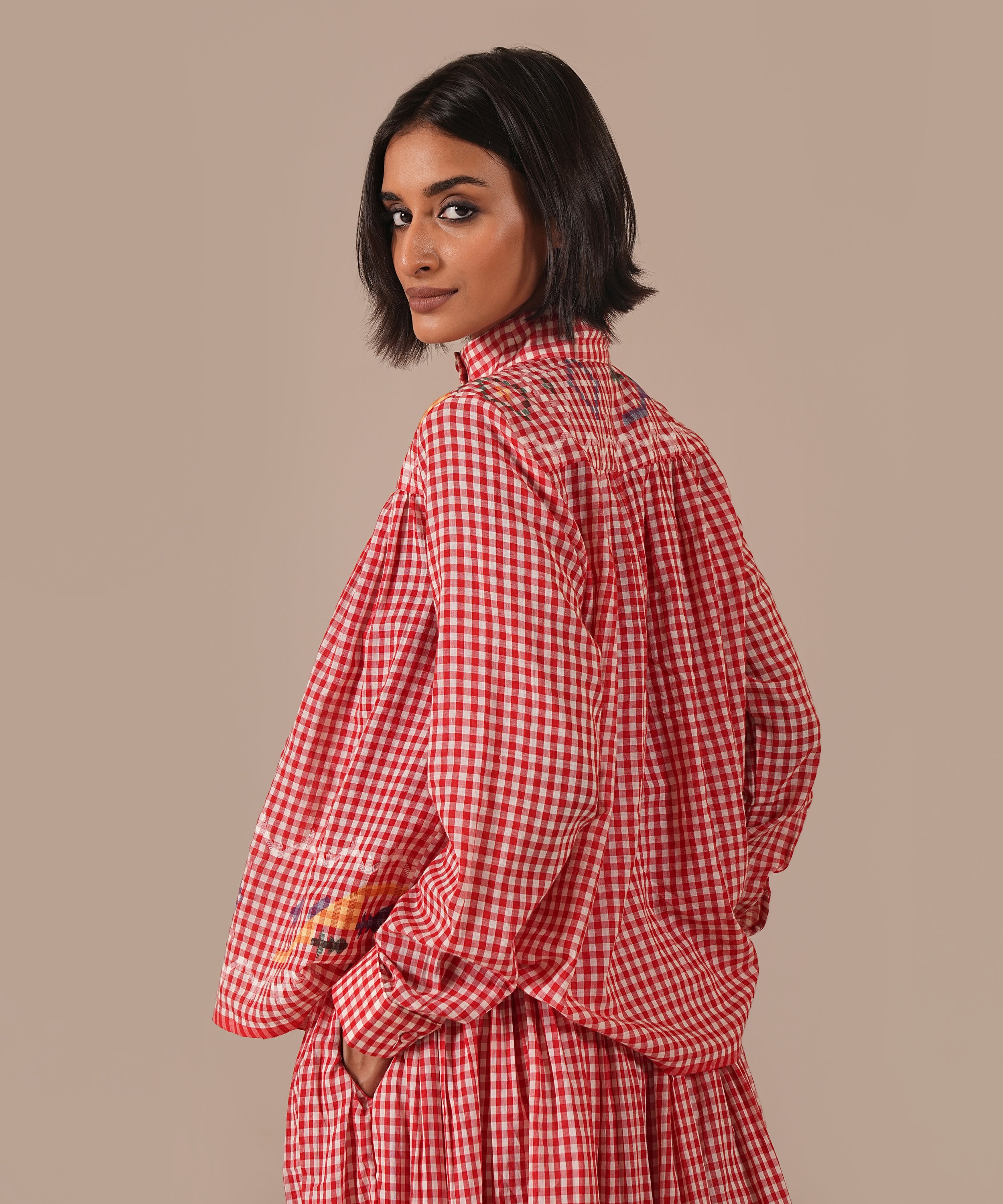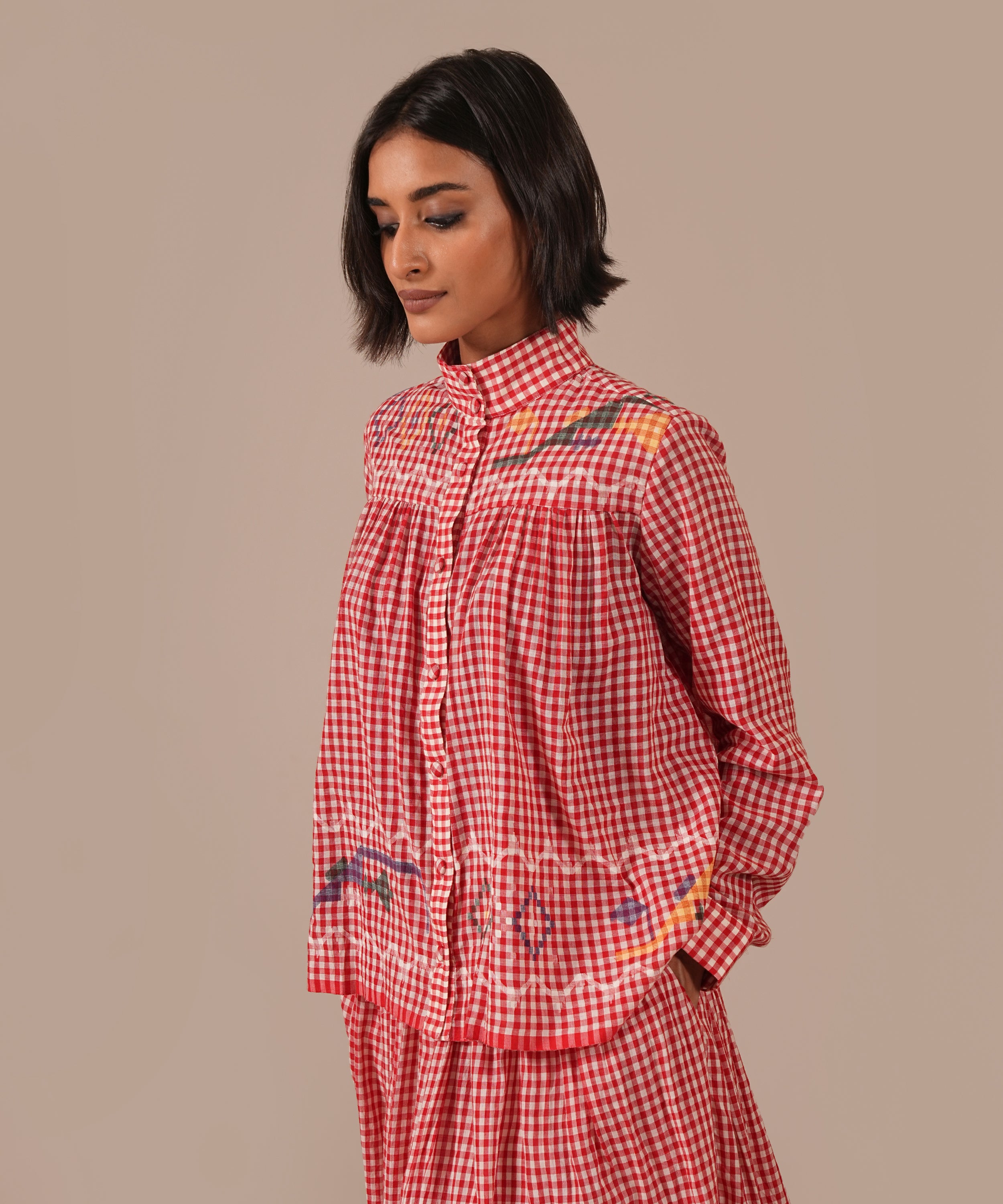 A handcrafted Jamdani ensemble with a gathered skirt, side zipper fastening, side pockets, and a co-ord high-collared shirt effortlessly refined and timeless.