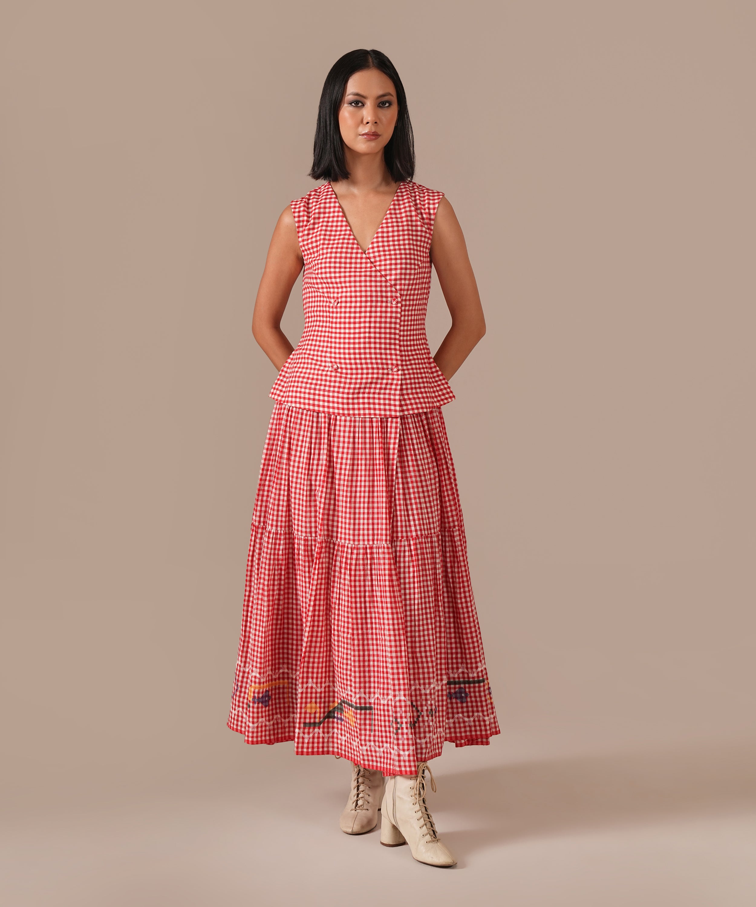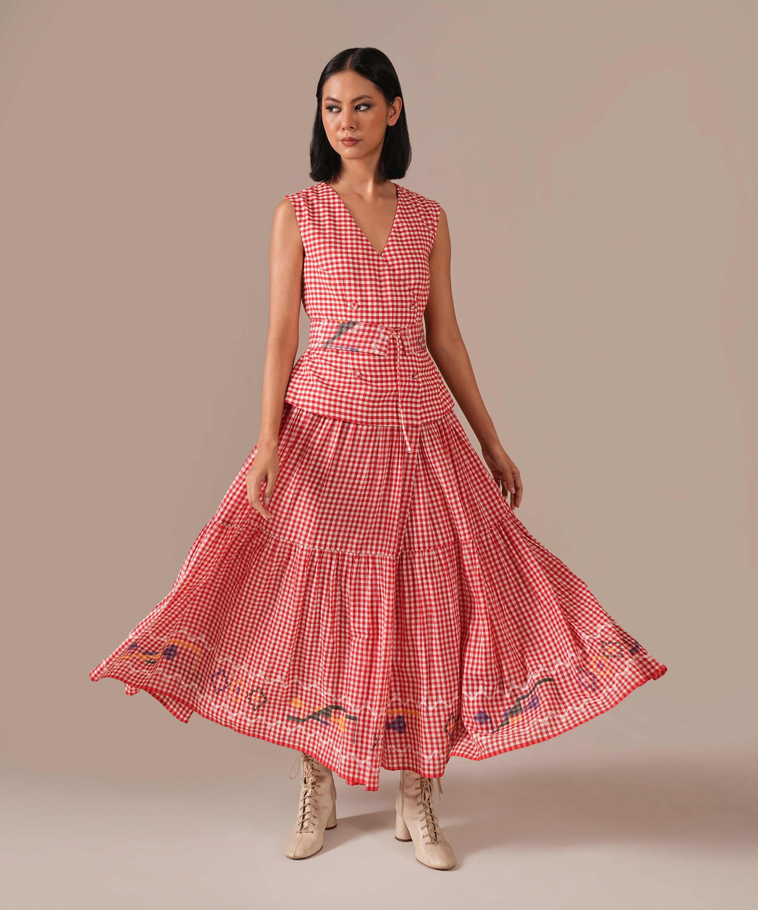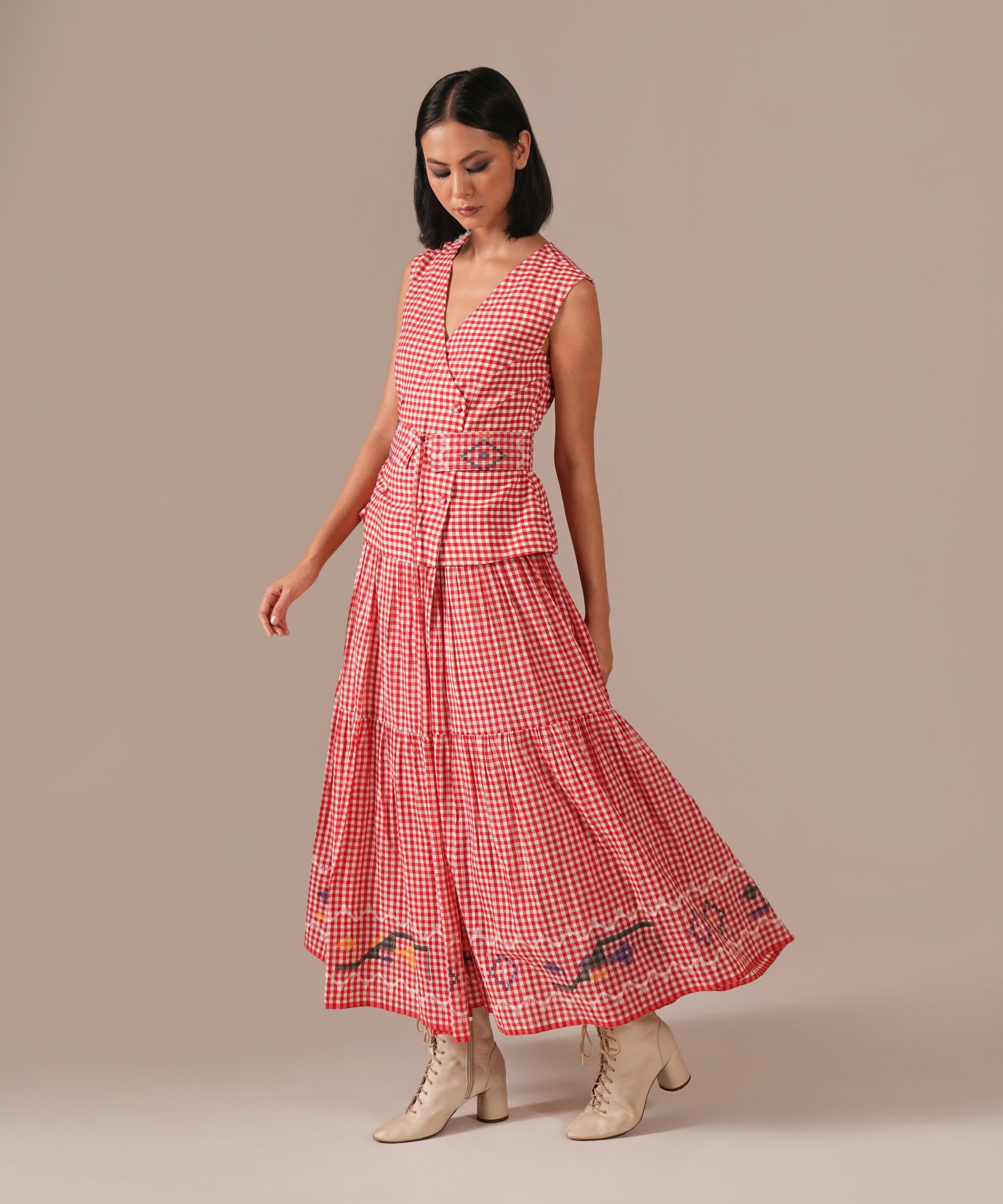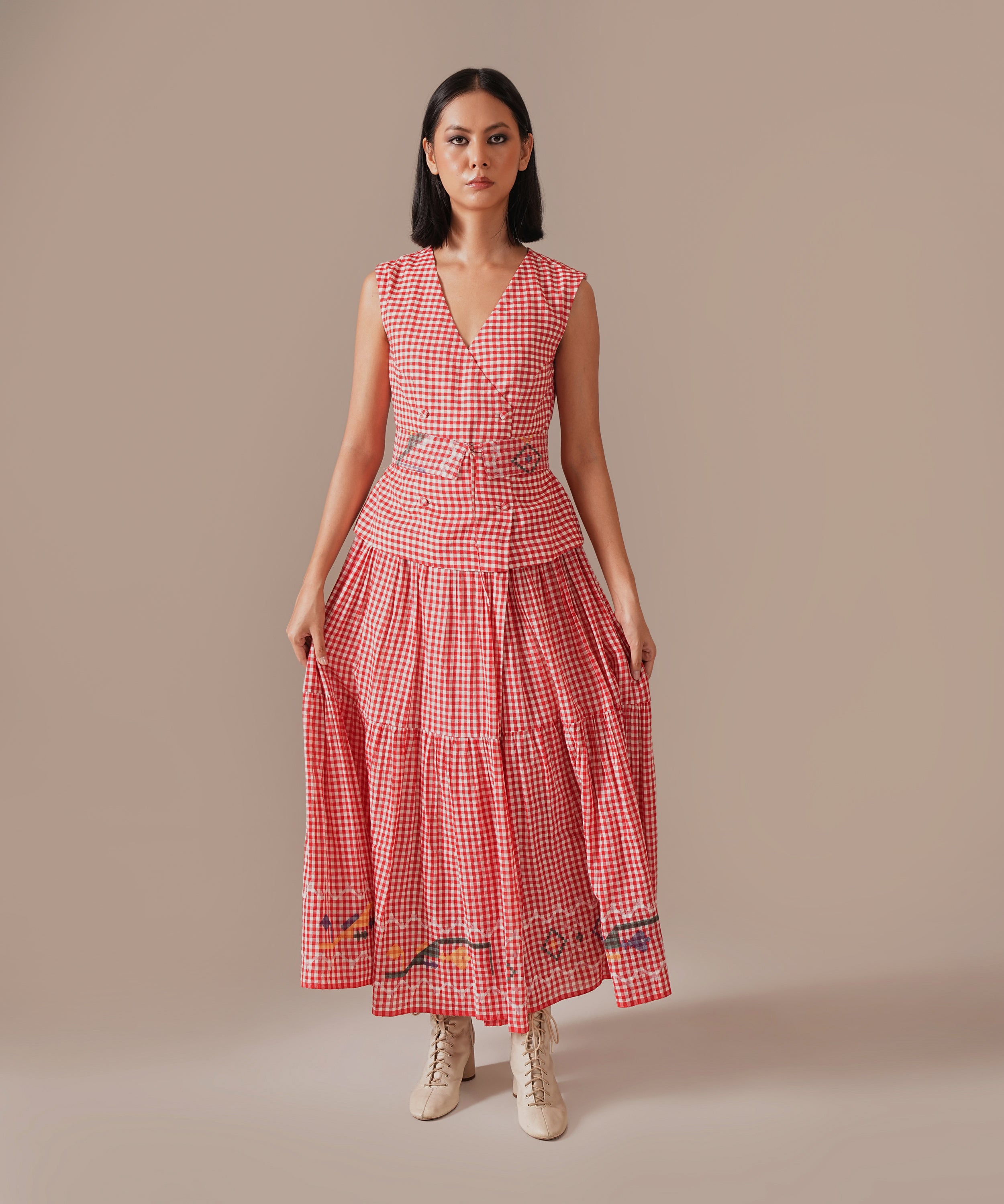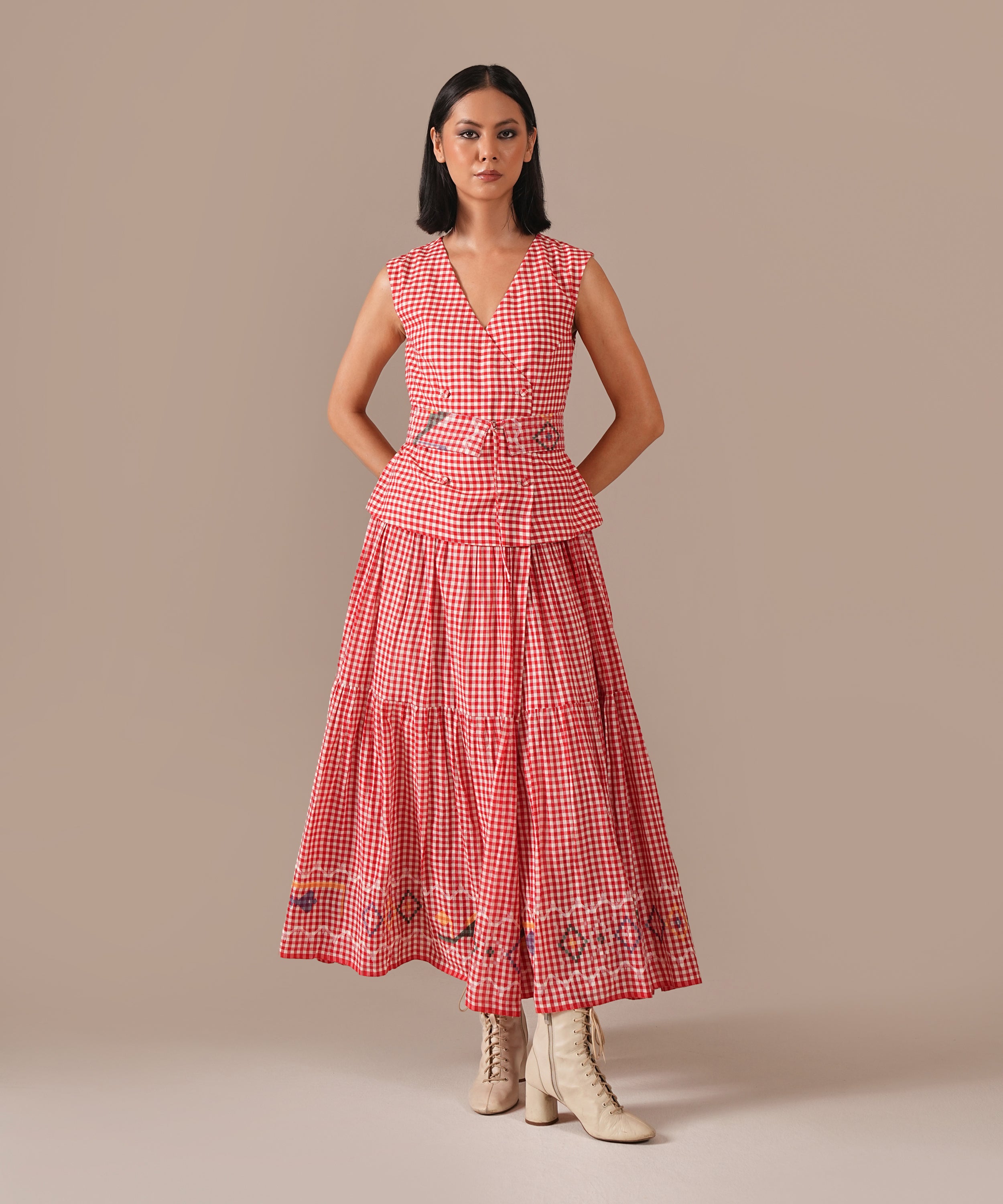 A classic double-breasted wrap dress featuring a tiered silhouette and a quilted belt. Thoughtfully designed to create the illusion of a skirt paired with a top, while in reality it’s a single, effortlessly chic dress.
