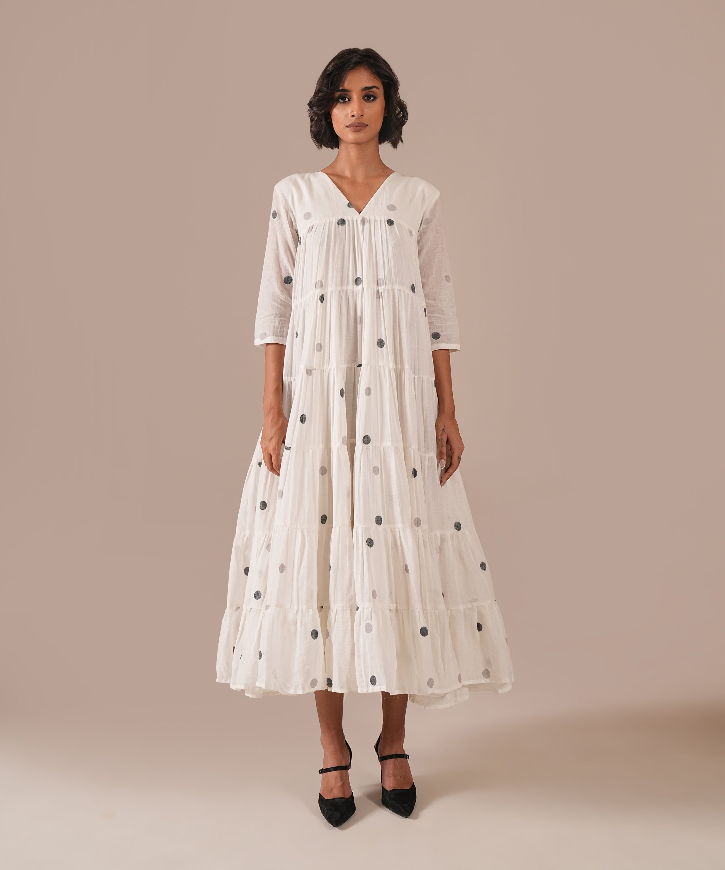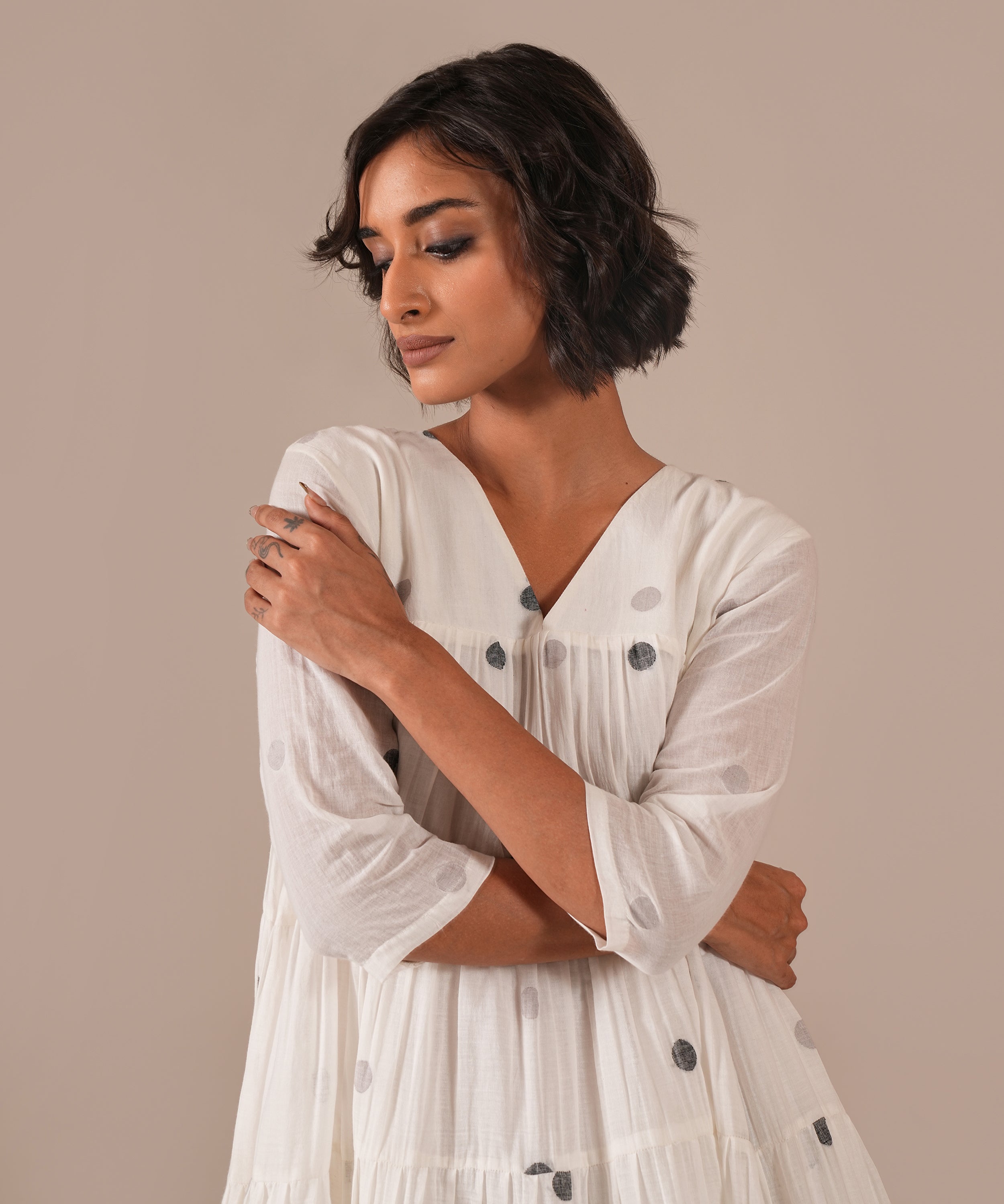 An elegant Jamdani swing dress designed to dazzle, featuring a V-neck, and 3/4th sleeves. With a romantic, voluminous silhouette crafted from 9 to 10 meters of gentle gathers, this dress flows beautifully, making every twirl and photograph a statement. Perfect for capturing the full drama and movement of your favourite moments.