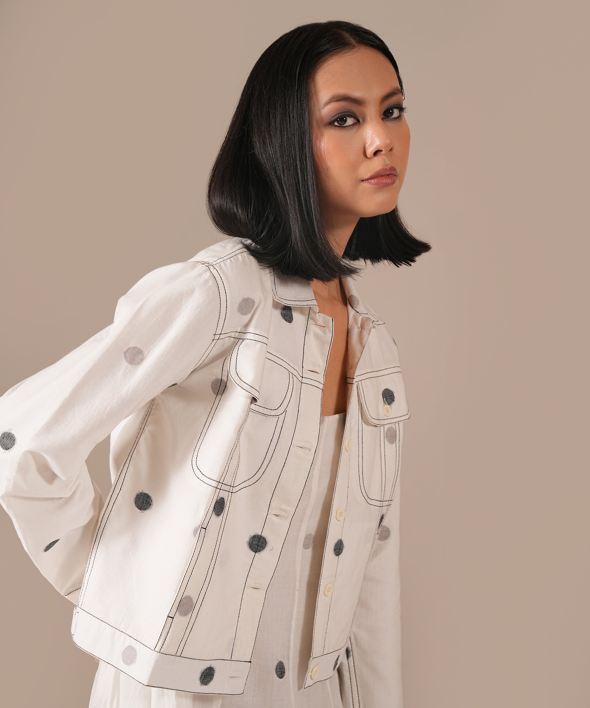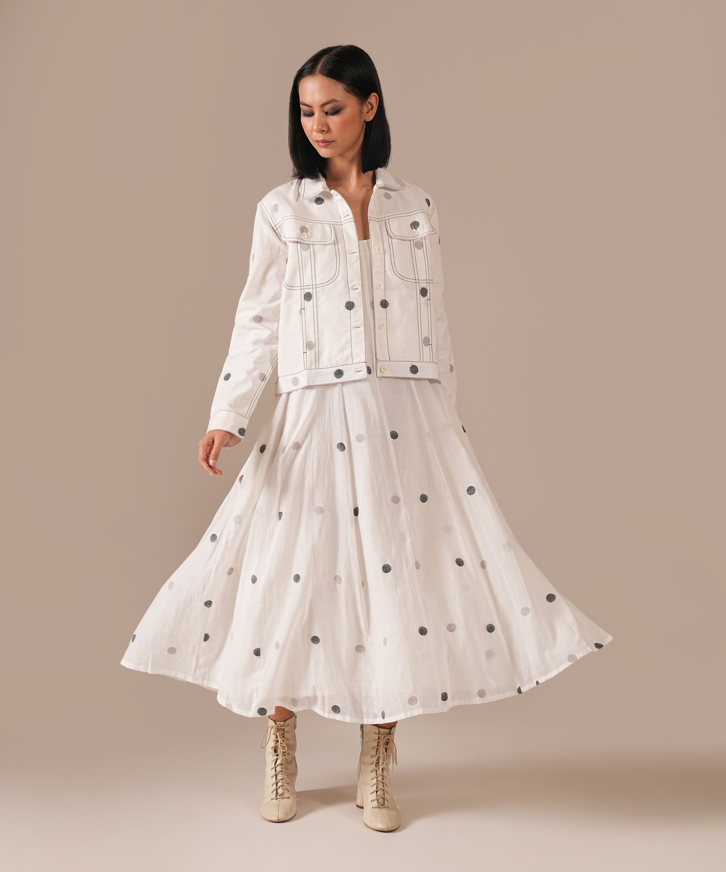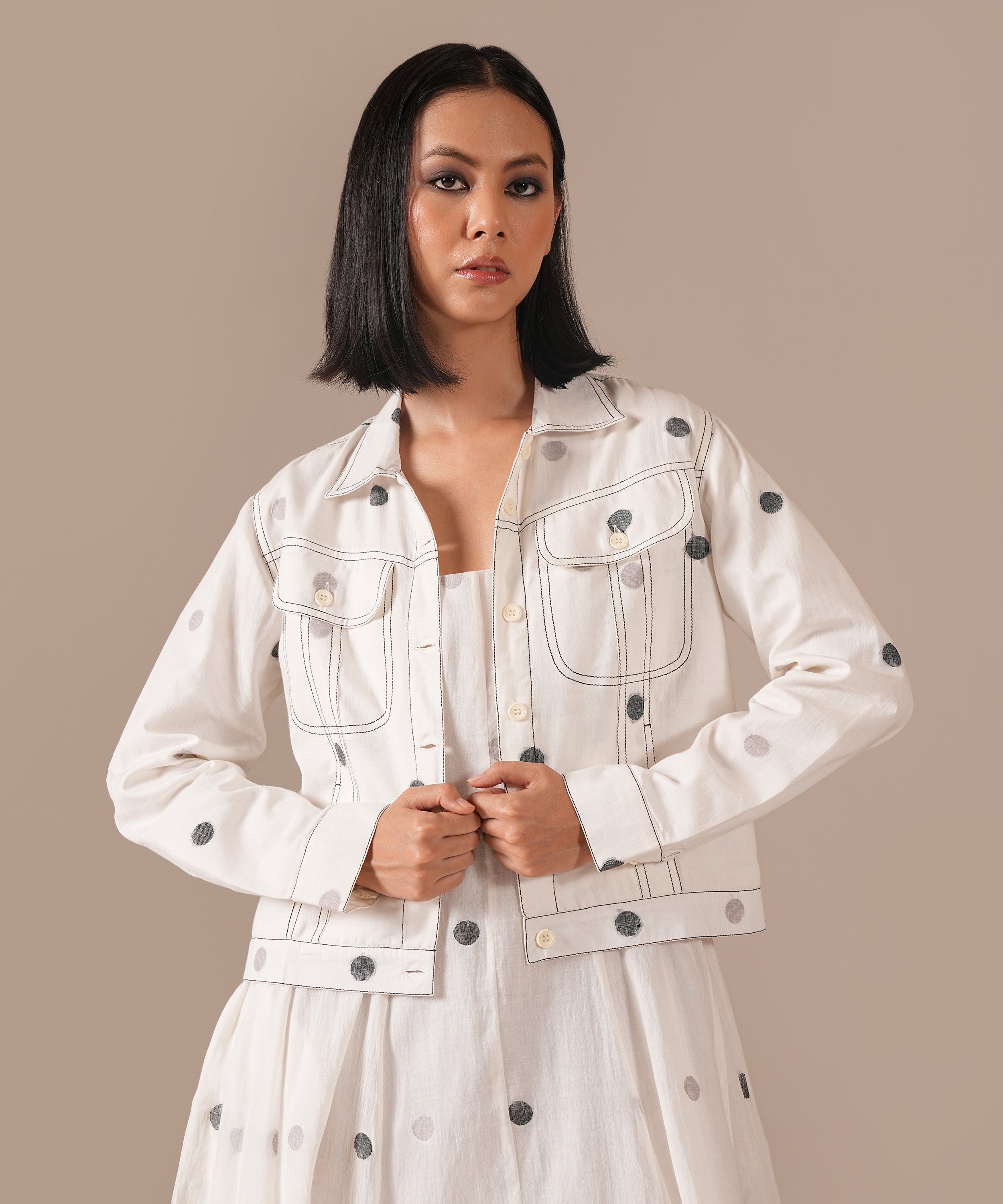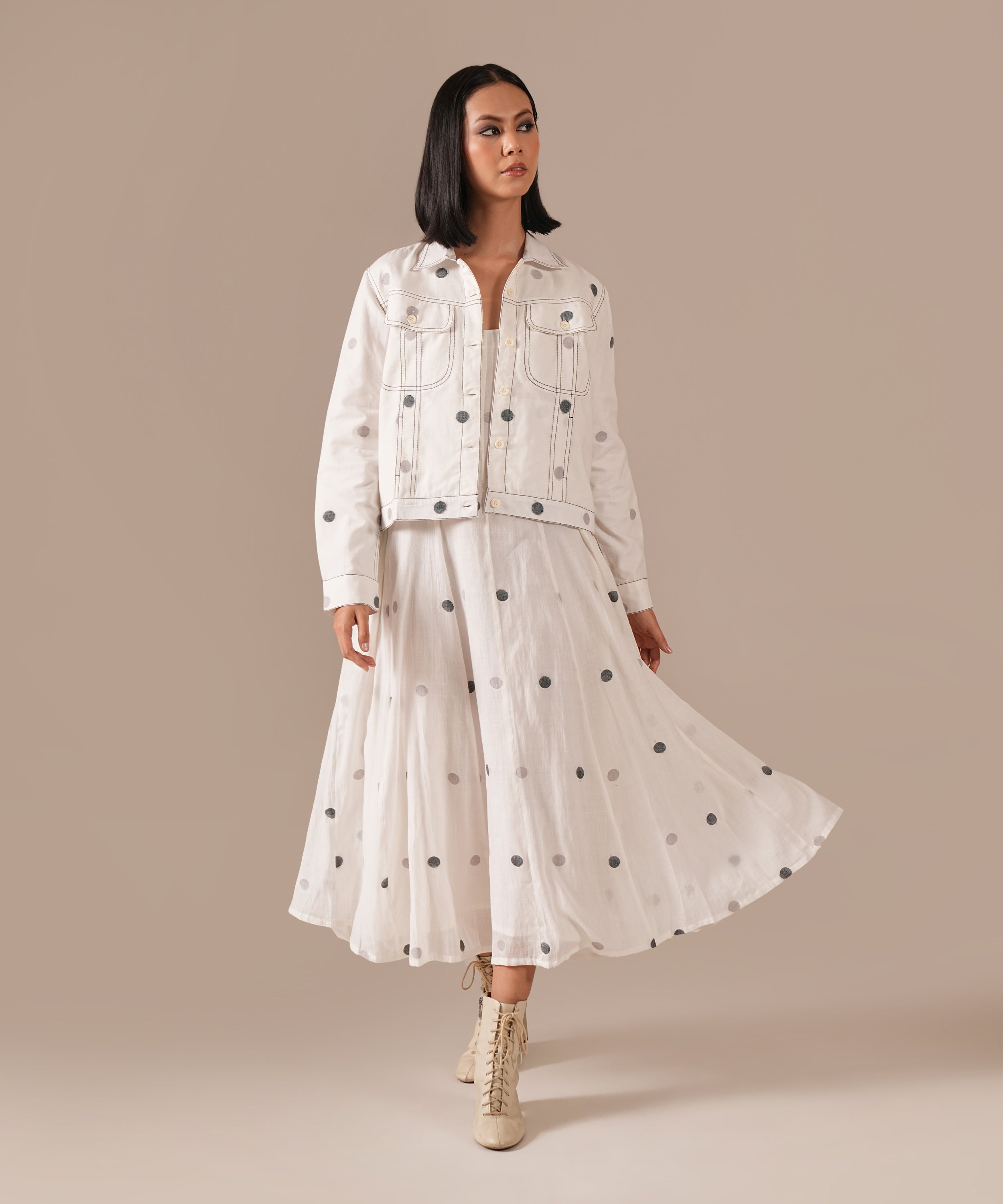 A Jamdani fit-and-flare ensemble featuring a deep square-neck dress with back zipper fastening, kali panel detailing, and functional side pockets. It is paired with a denim-inspired Jamdani co-ord jacket, reimagining the timeless weave with a modern denim aesthetic. Handwoven by Indian artisans, this set beautifully blends tradition with contemporary design.