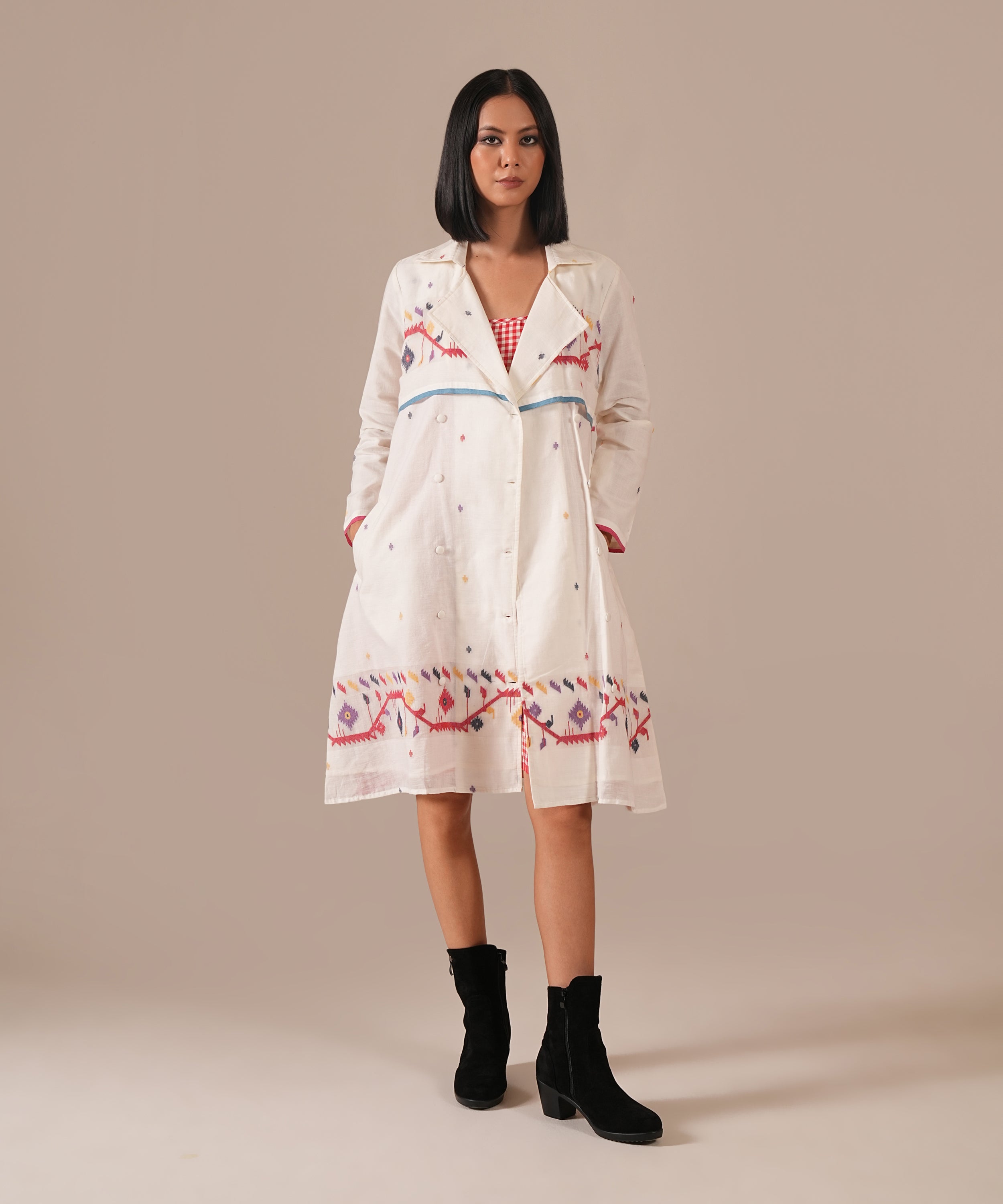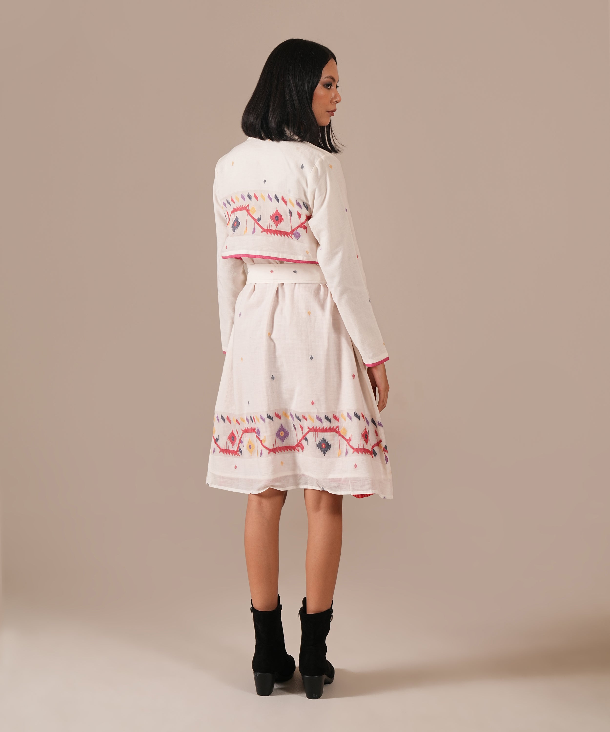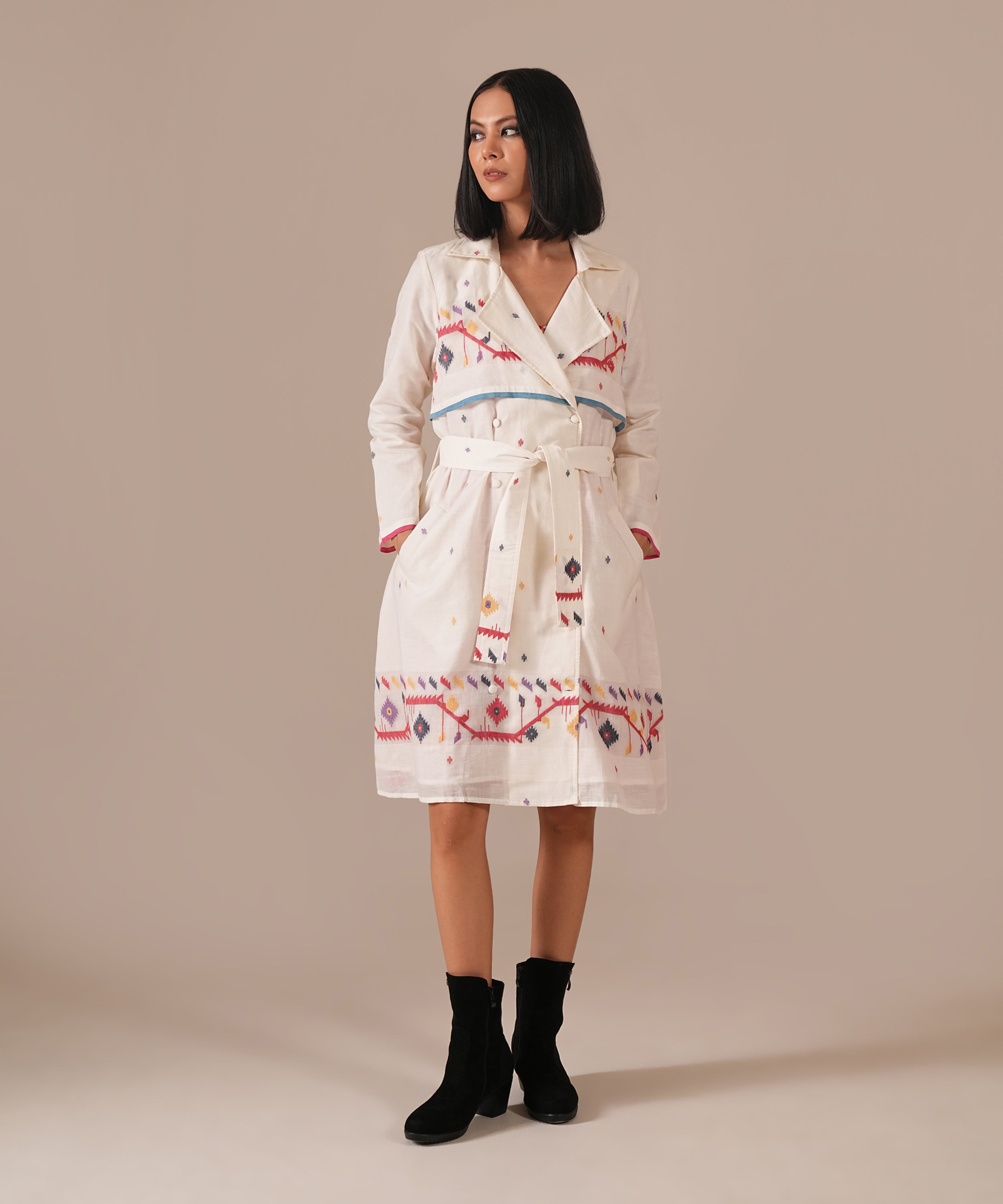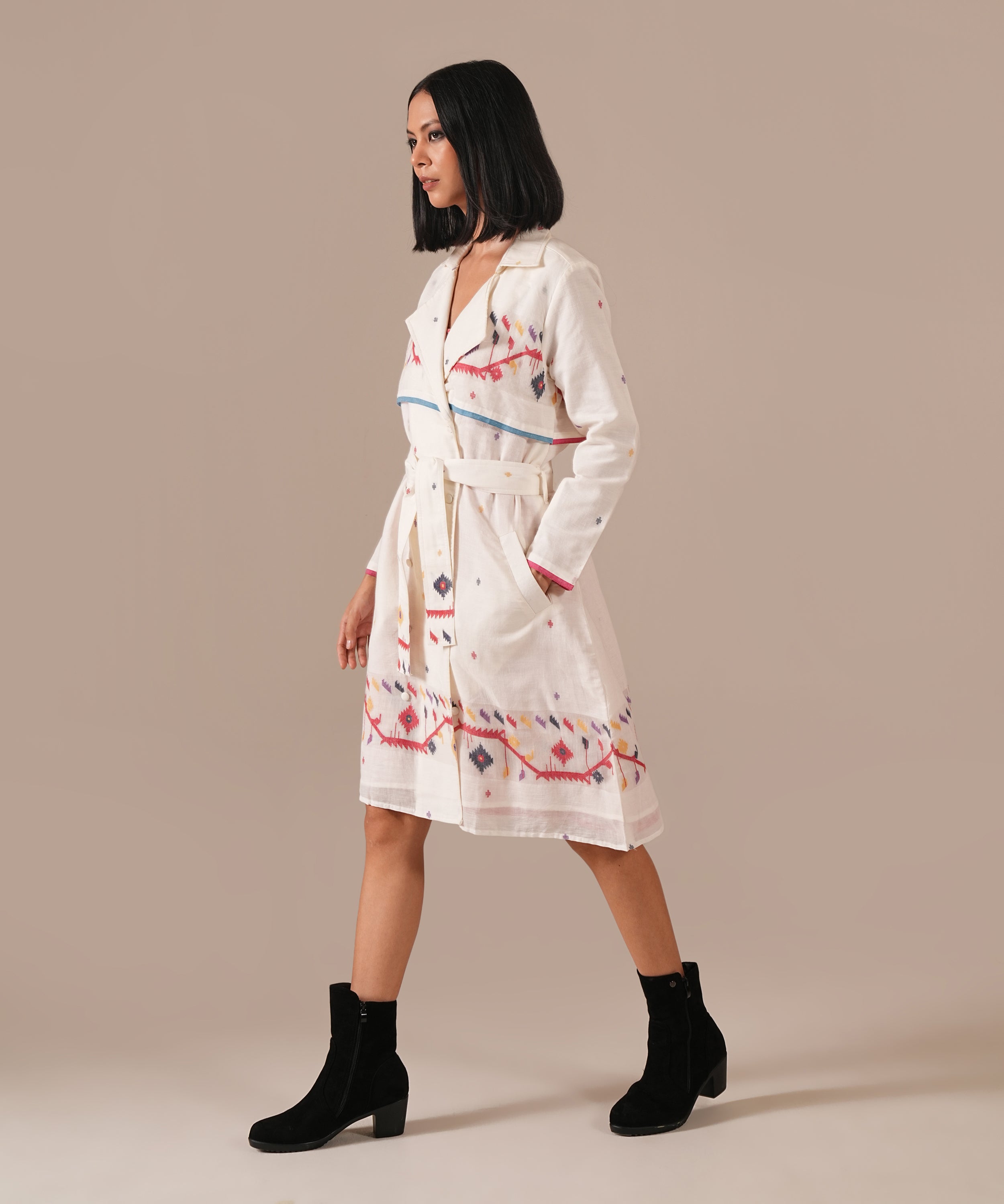A classic Jamdani double-breasted coat-cum-dress featuring an elegant A-line silhouette with a wrap-over front, notched lapel collar, and slanted welt pockets. A removable tie belt allows versatile styling, while the accompanying fully lined Jamdani slip dress can be worn on its own or layered with the overcoat. Thoughtfully designed for multiple styling possibilities, this ensemble is a timeless addition to a sustainable wardrobe.