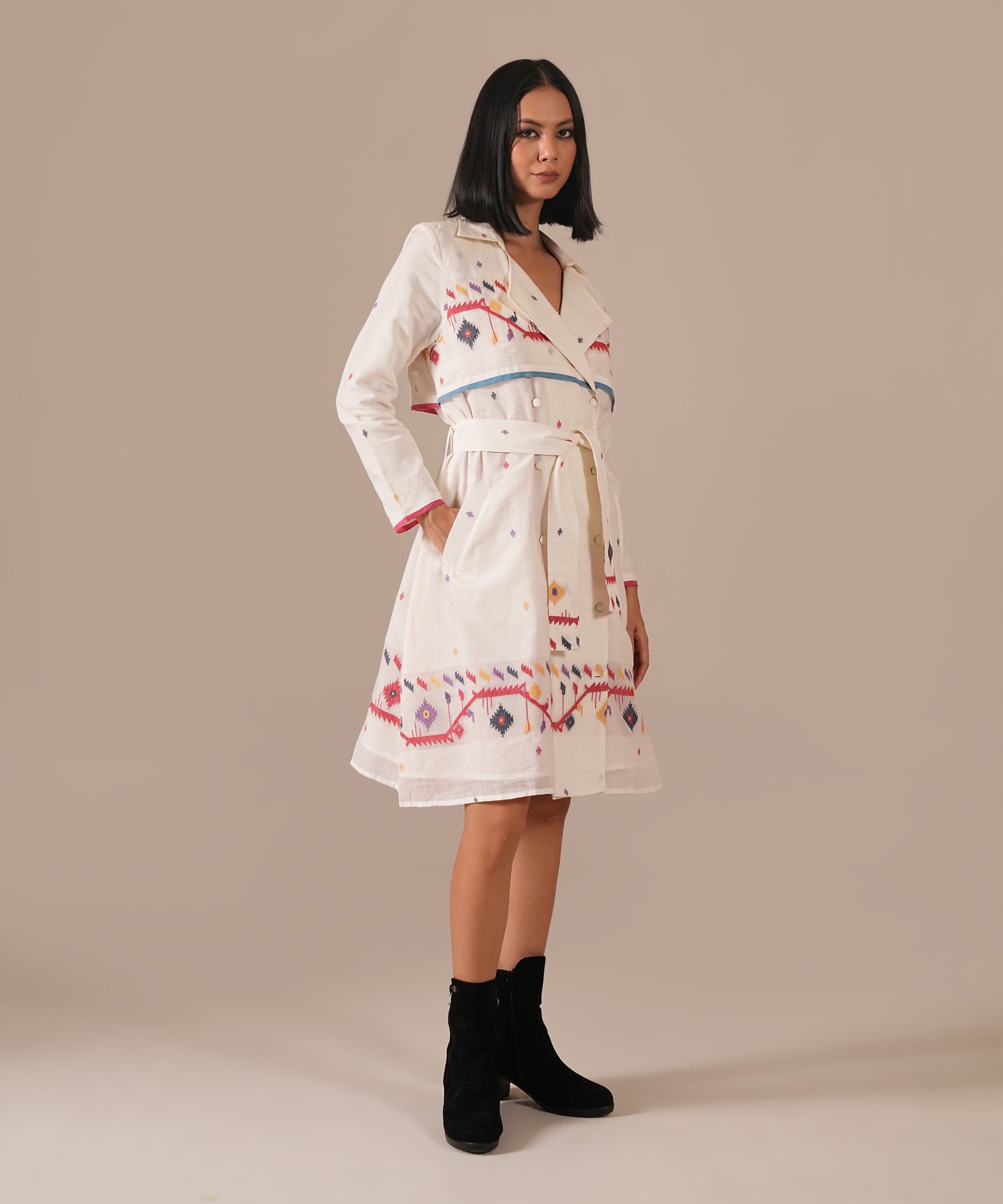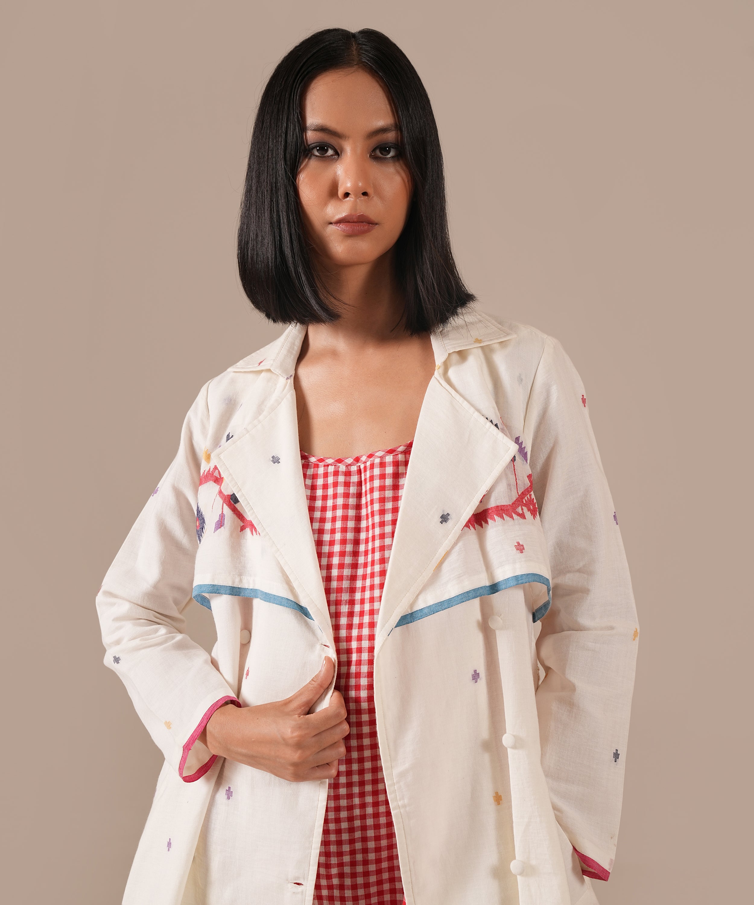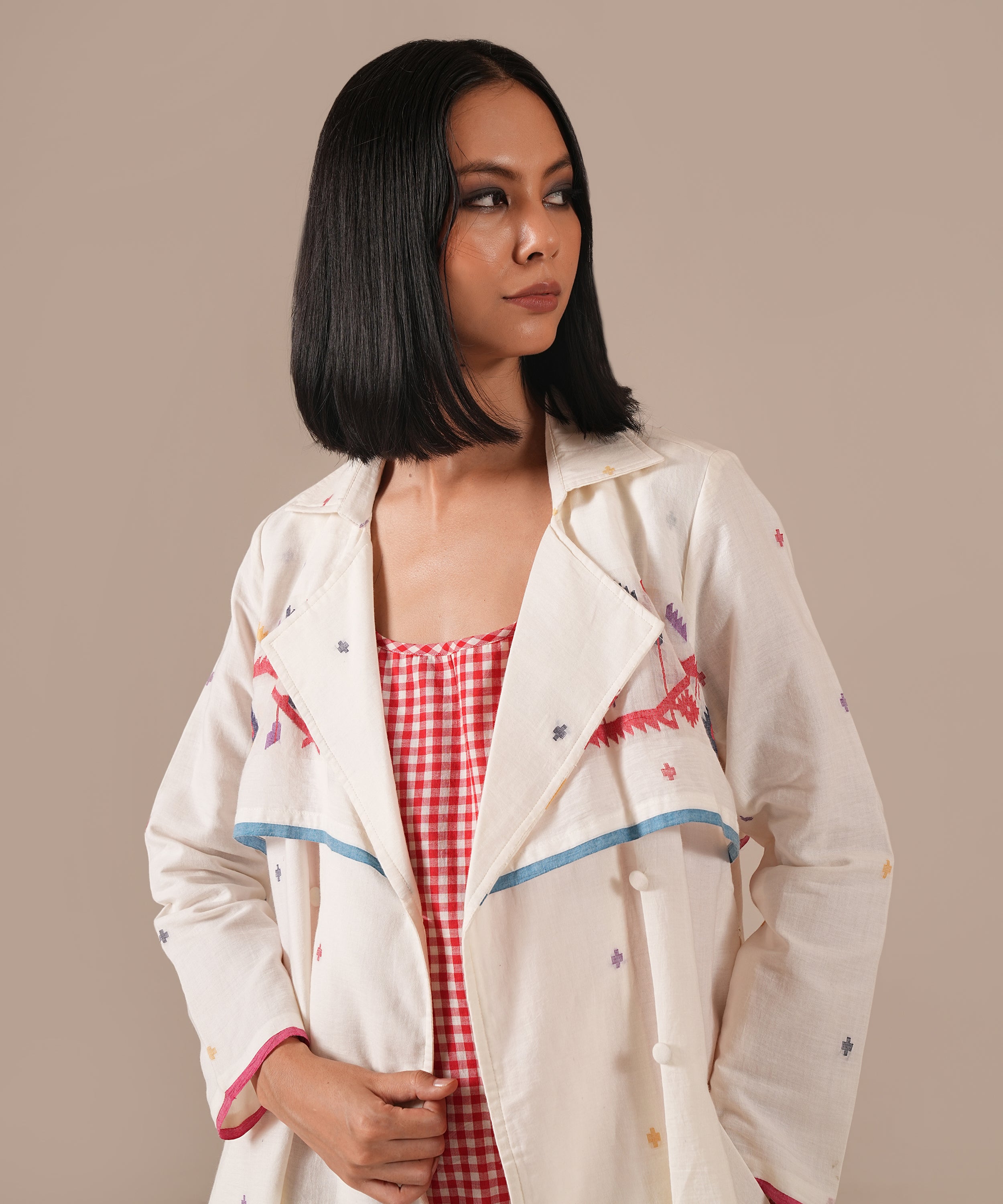 A classic Jamdani double-breasted coat-cum-dress featuring an elegant A-line silhouette with a wrap-over front, notched lapel collar, and slanted welt pockets. A removable tie belt allows versatile styling, while the accompanying fully lined Jamdani slip dress can be worn on its own or layered with the overcoat. Thoughtfully designed for multiple styling possibilities, this ensemble is a timeless addition to a sustainable wardrobe.