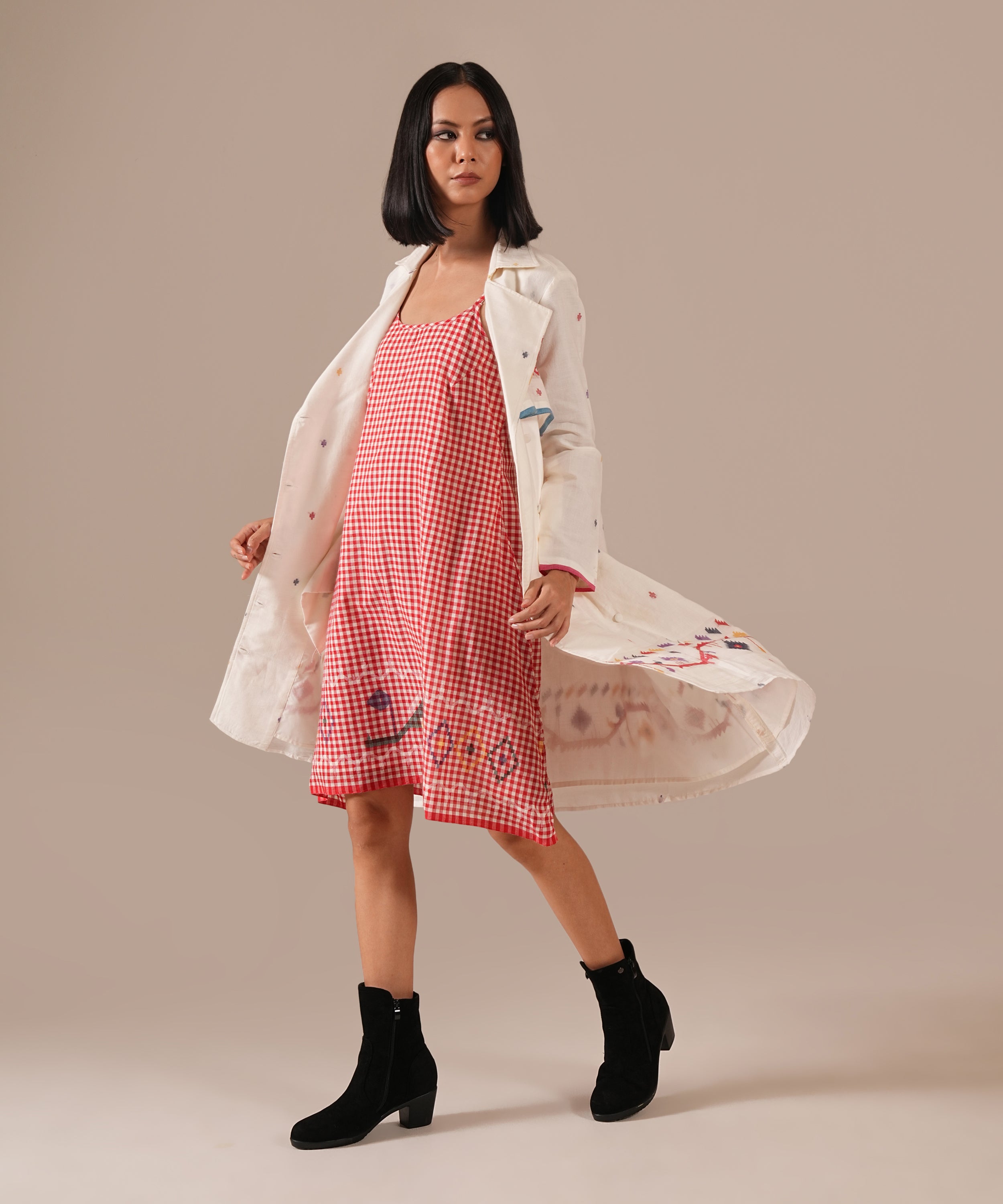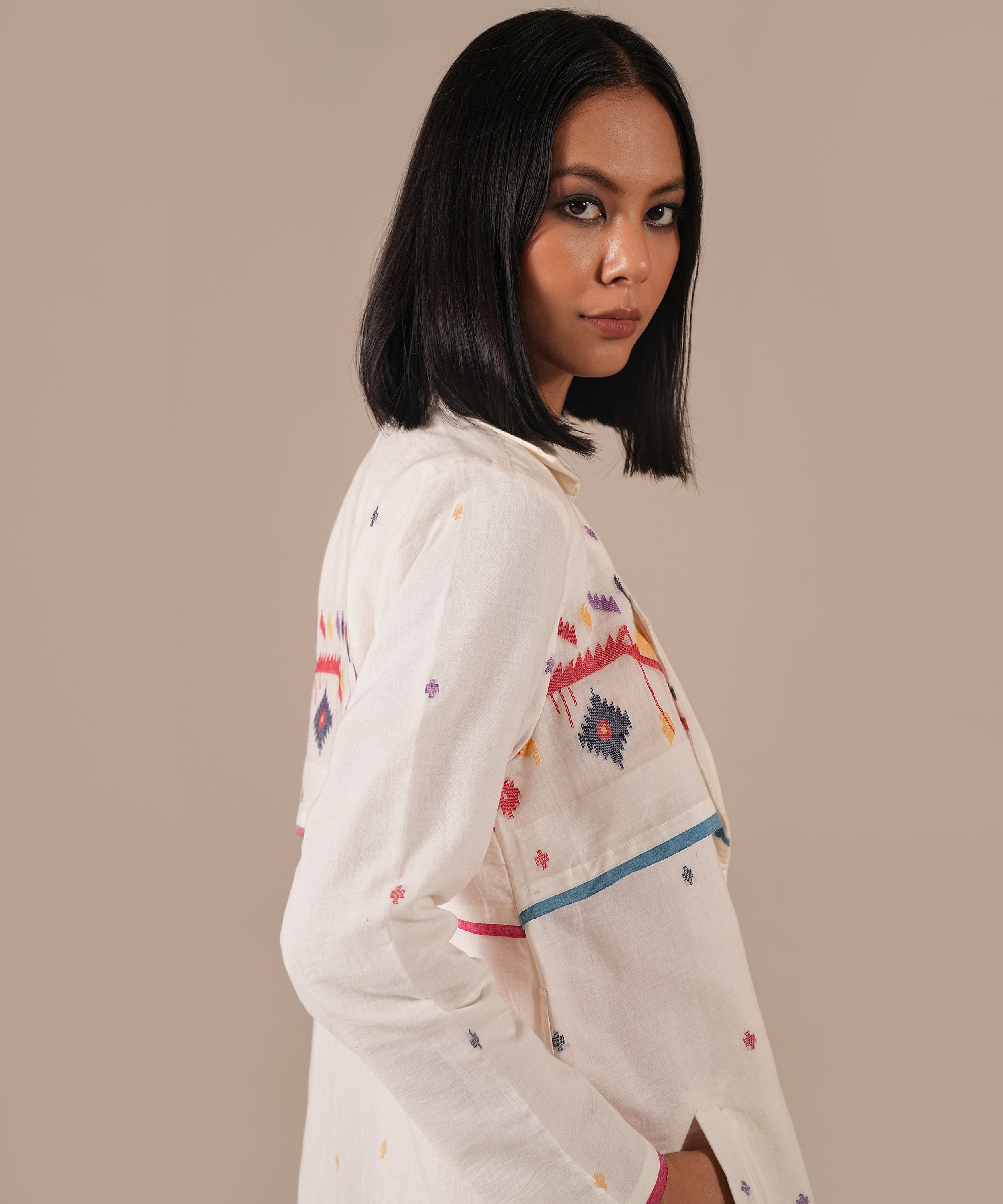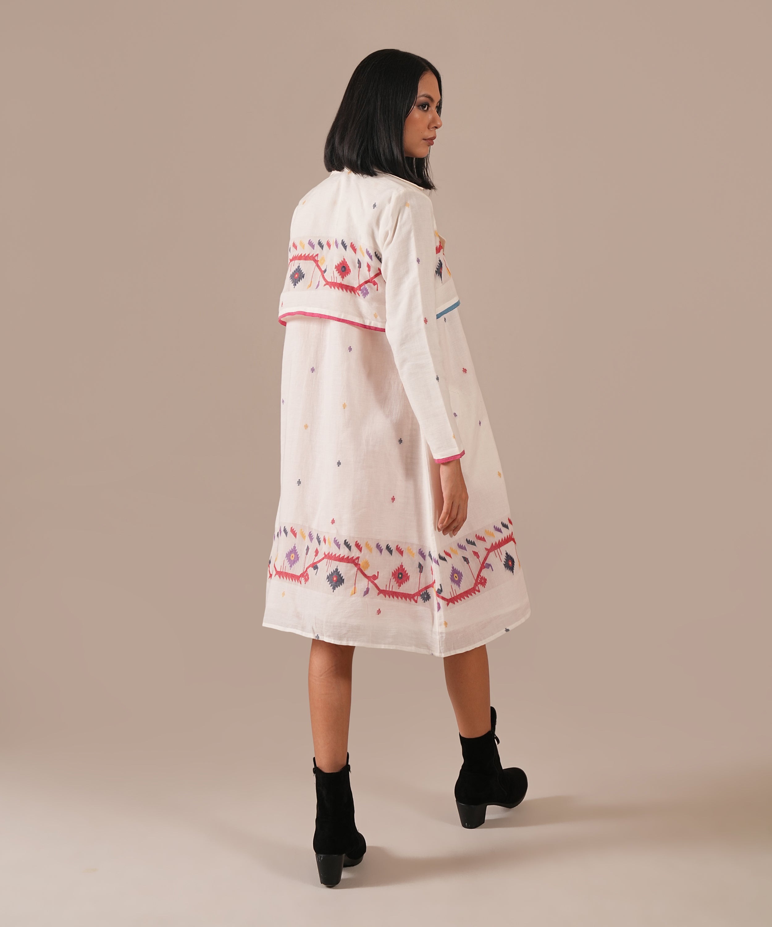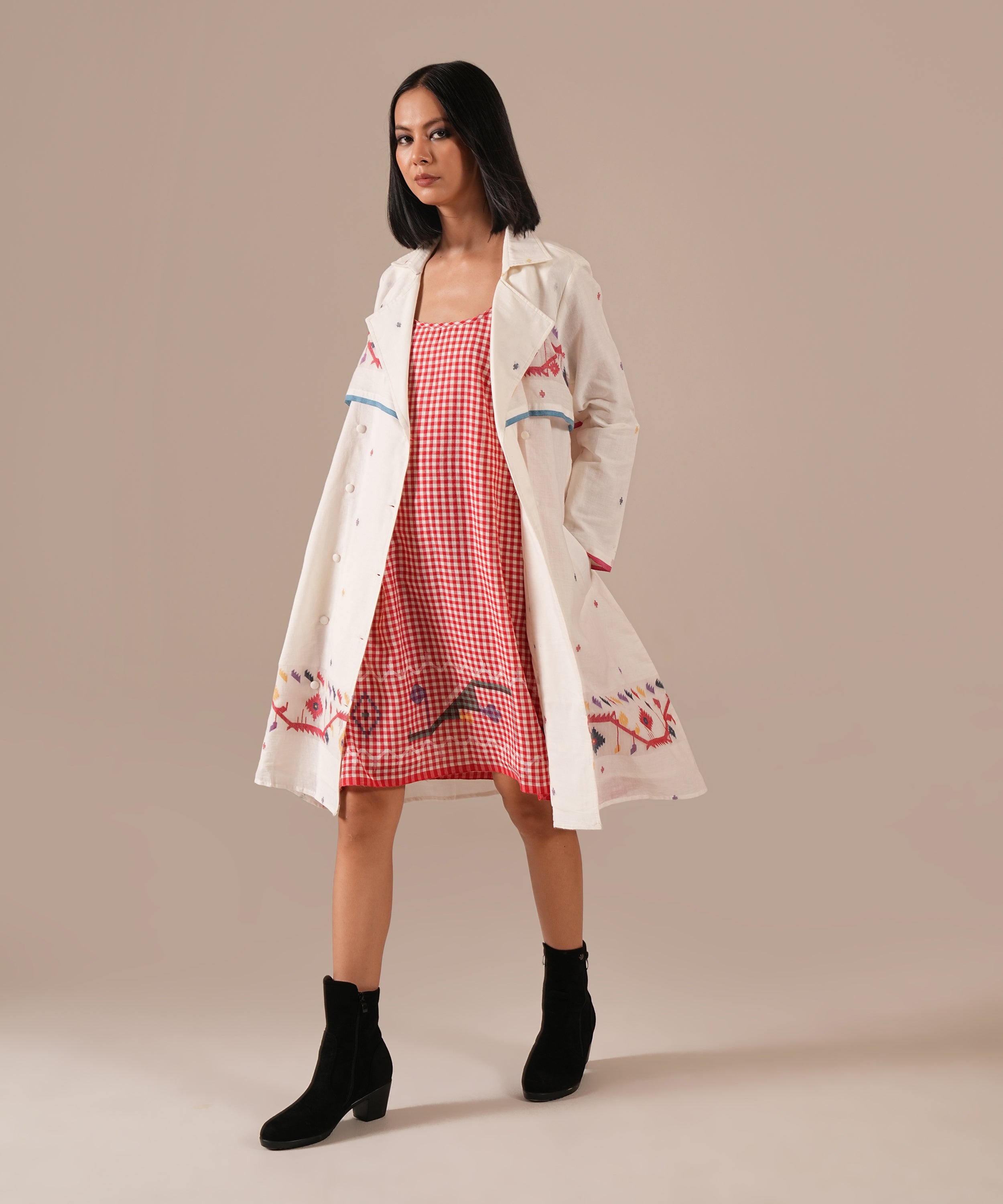 A classic Jamdani double-breasted coat-cum-dress featuring an elegant A-line silhouette with a wrap-over front, notched lapel collar, and slanted welt pockets. A removable tie belt allows versatile styling, while the accompanying fully lined Jamdani slip dress can be worn on its own or layered with the overcoat. Thoughtfully designed for multiple styling possibilities, this ensemble is a timeless addition to a sustainable wardrobe.