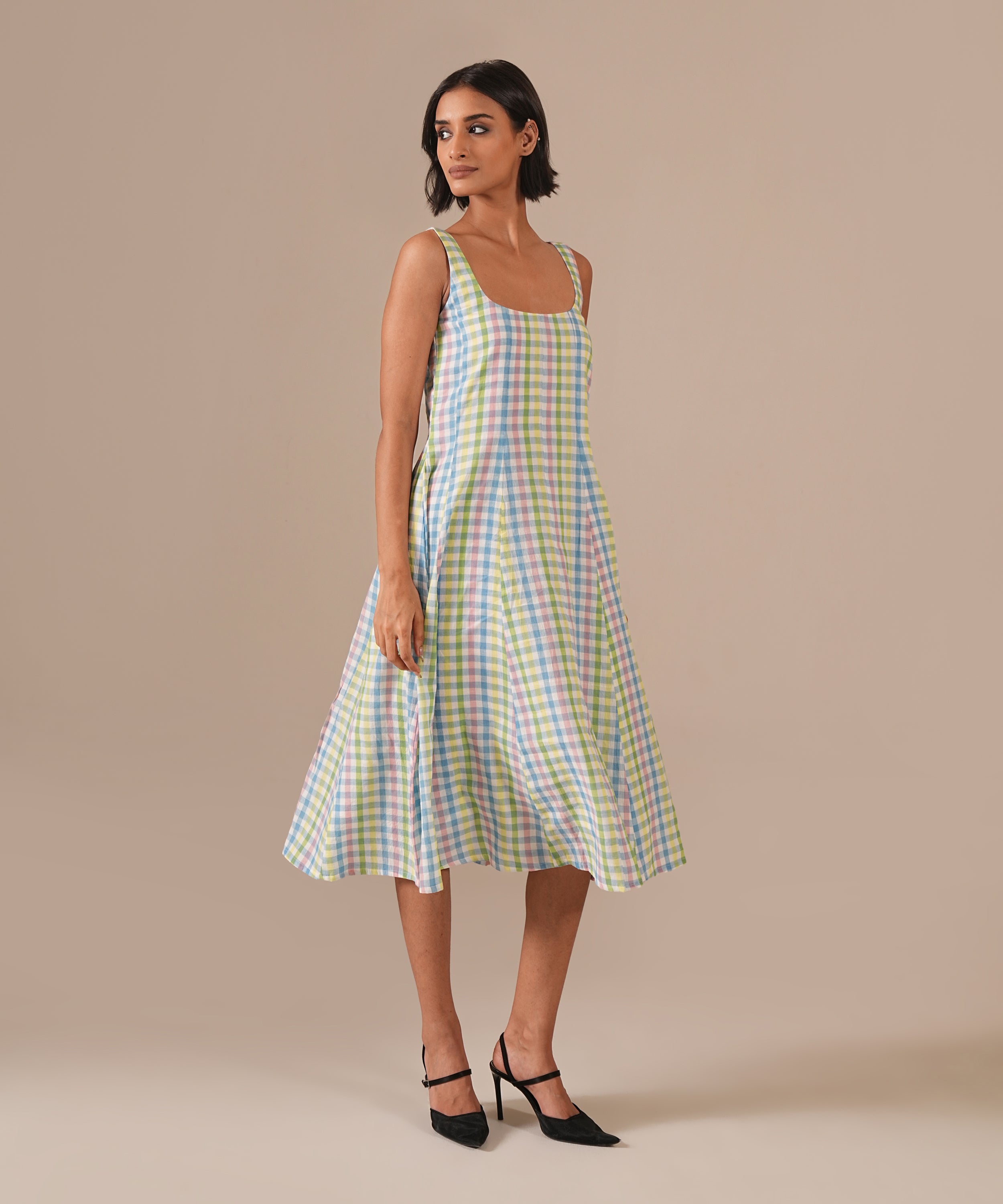 A classic fit-and-flare dress featuring a deep square neckline, back zipper fastening, elegant kali panel detailing, and functional side pockets, a seamless blend of timeless style and modern sophistication.