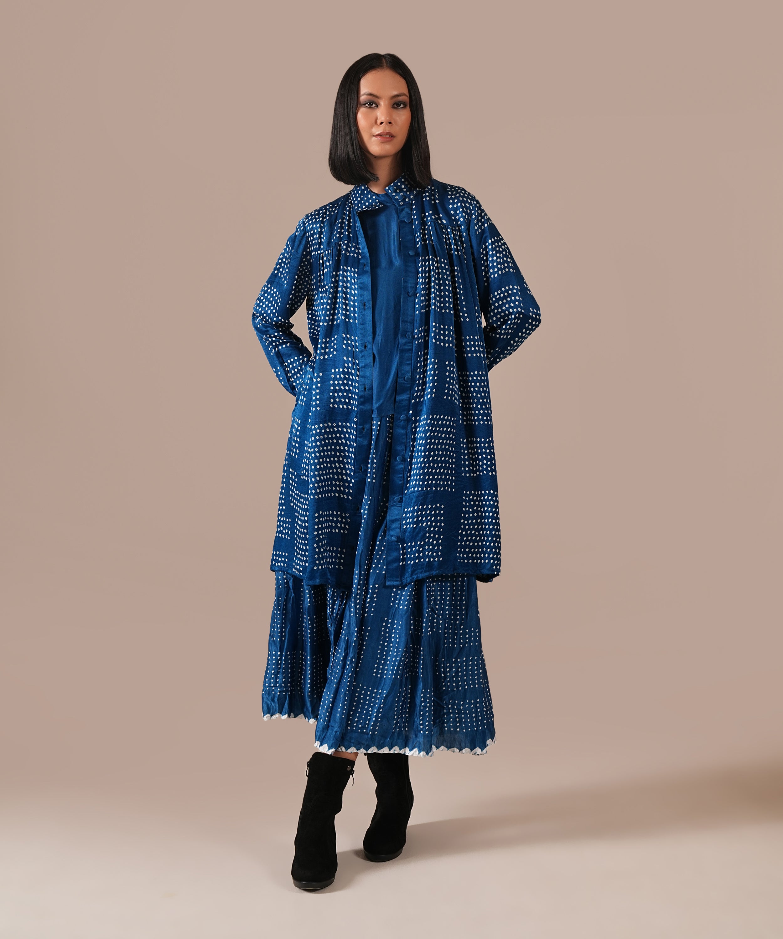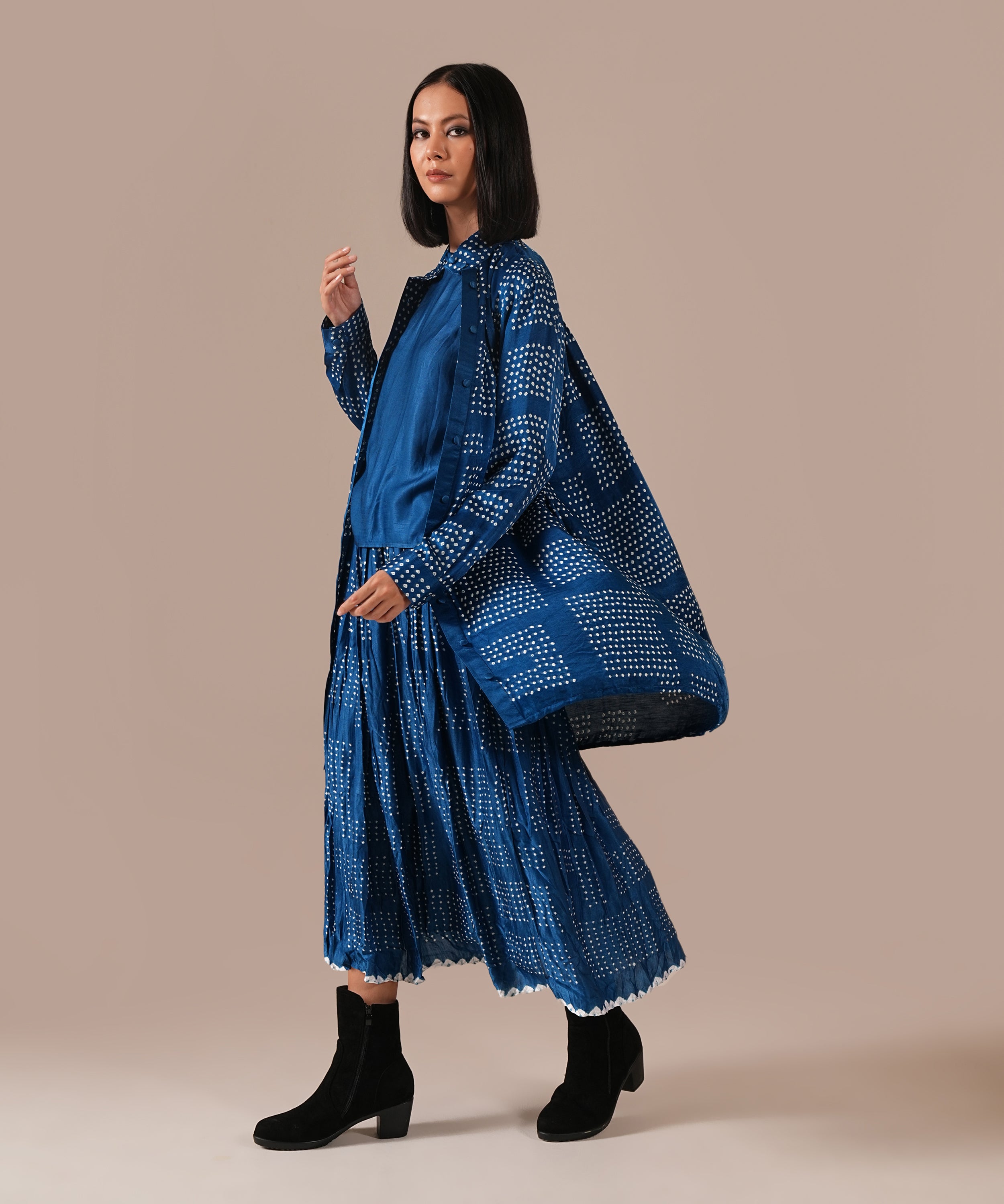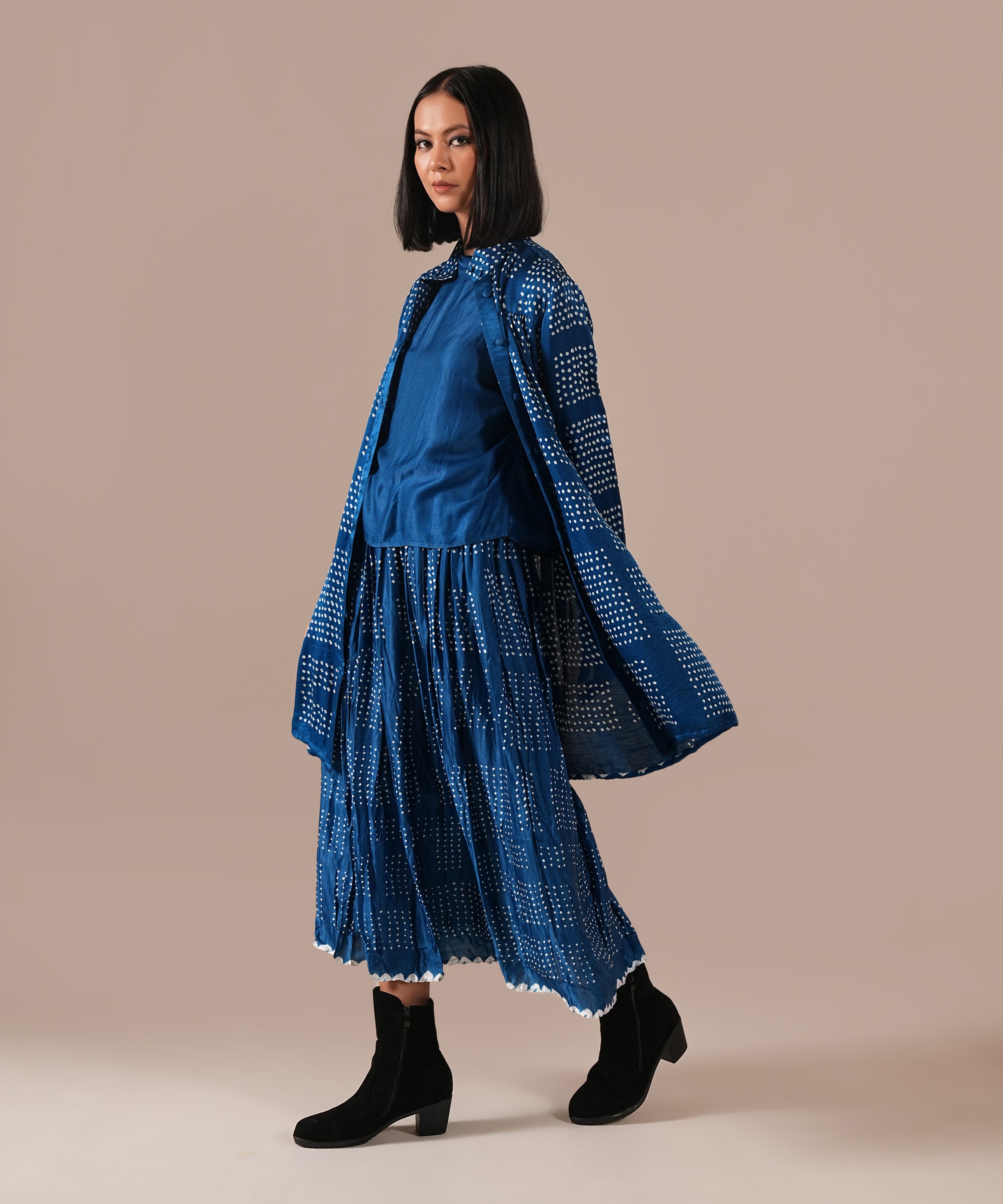 This ensemble is a masterful blend of heritage and contemporary elegance: a gathered silk bandhani skirt with side pockets, a sleek silk boxy top, and a silk Bandhani overlay that doubles as a chic shirt, cinched with a versatile Bandhani tie belt. Each piece showcases artisanal craftsmanship, luxurious textures, and effortless sophistication. It is a celebration of India’s rich handloom legacy, now reinterpreted for the modern wardrobe.