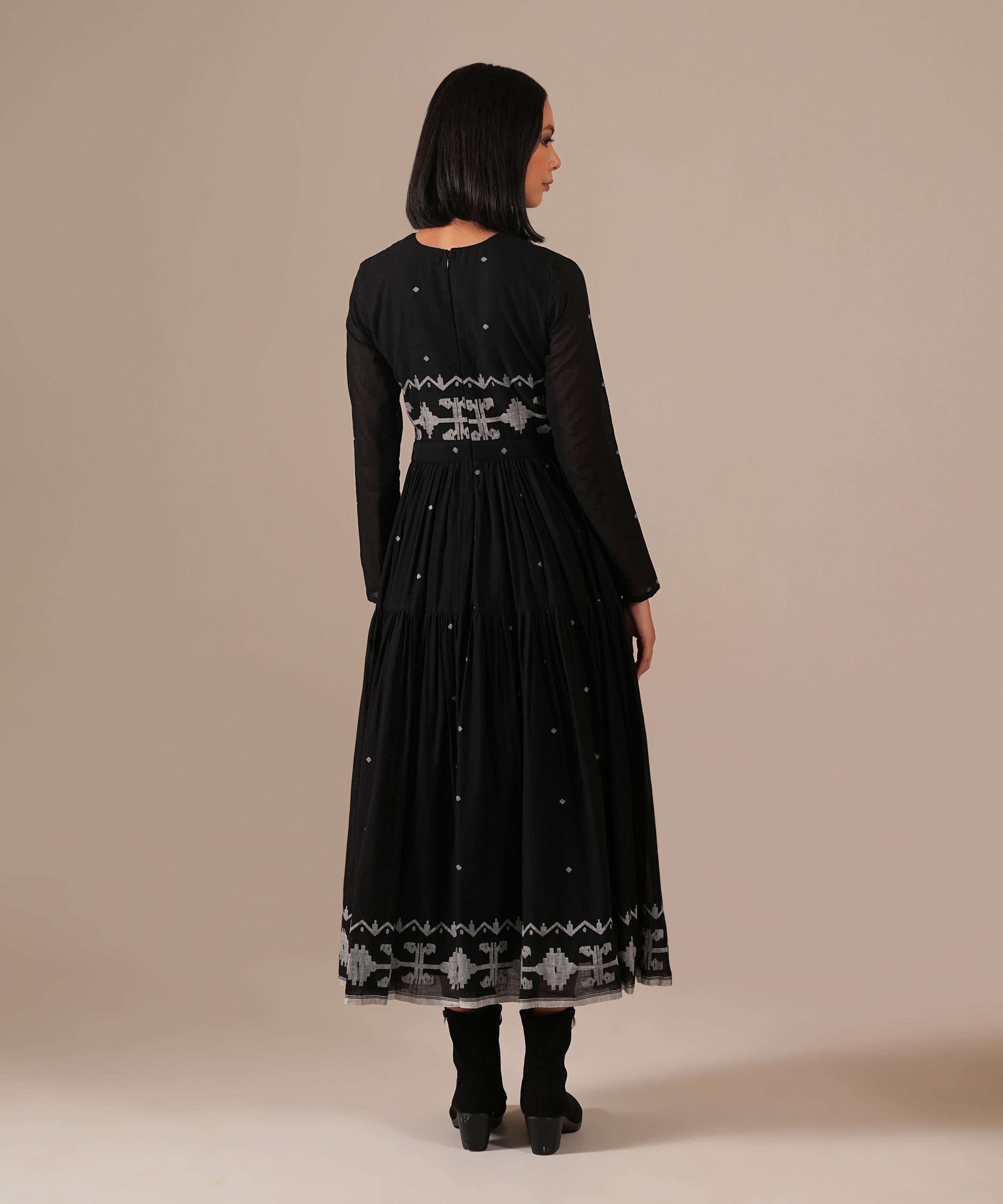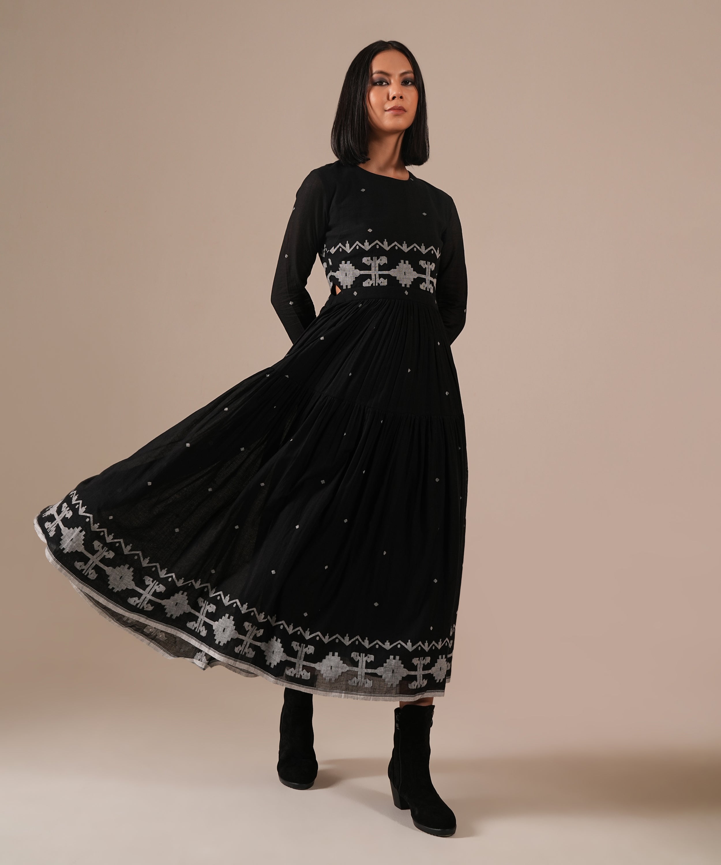 An attire that stands for its glamour and effortlessness features a fitted bodice, round neck, full sleeves, back zipper fastening, and skin-barring cut out at the waist that comes with a voluminous tiered silhouette. Handwoven by Indian artisans, the dress comes with side pockets.