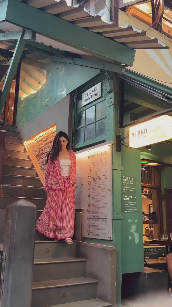 A handcrafted Jamdani ensemble with a gathered skirt, side zipper fastening, side pockets, and a co-ord high-collared shirt effortlessly refined and timeless.
