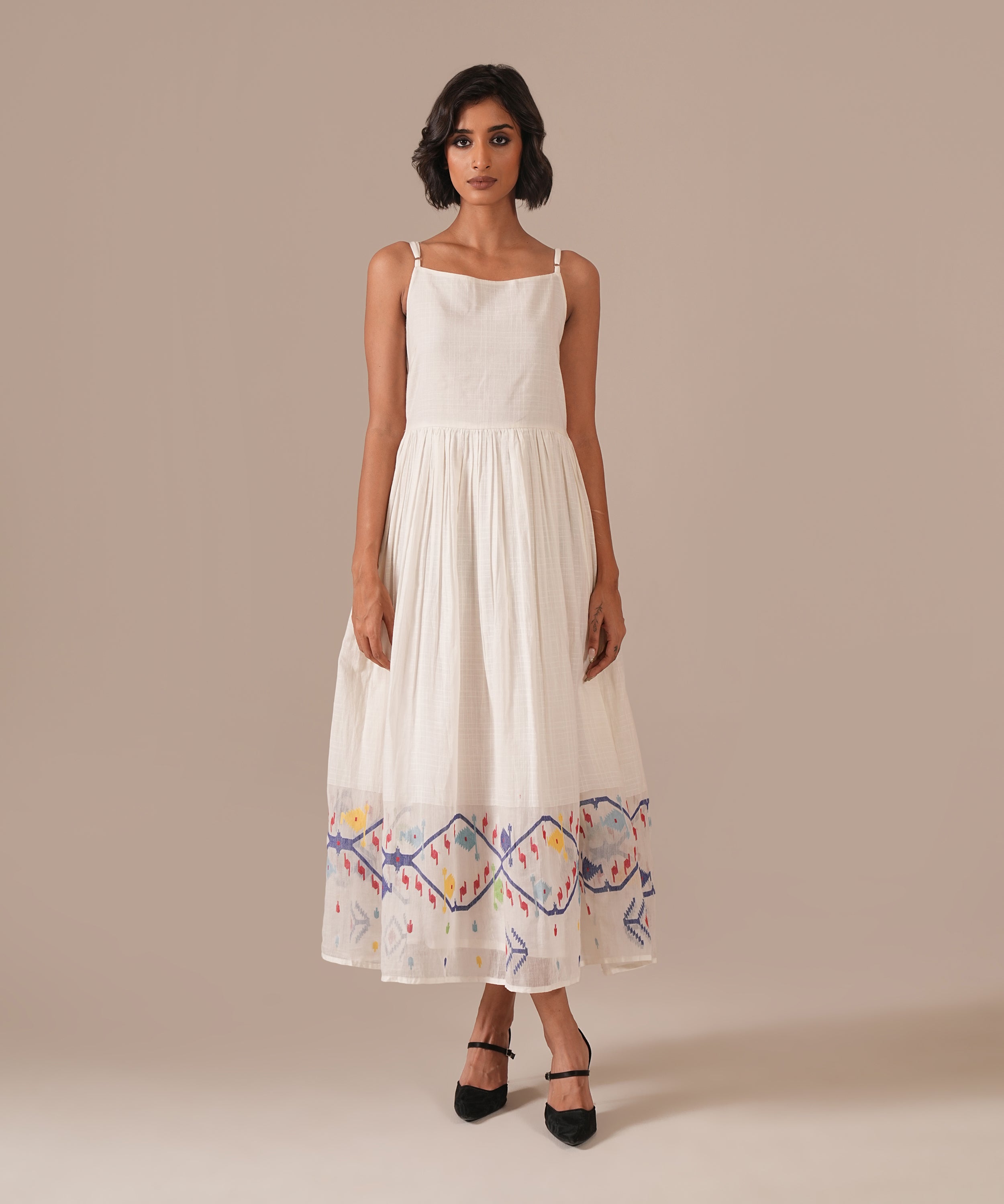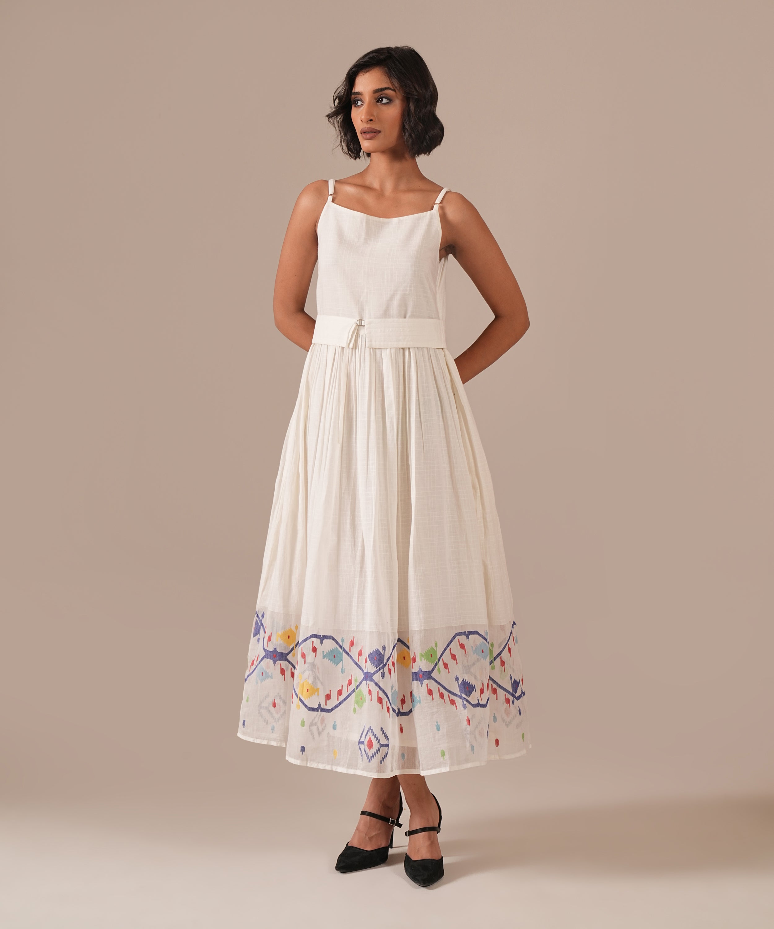 A classic Jamdani dress with a fit-and-flare silhouette, adjustable straps, and back zipper fastening, a timeless addition to a sustainable wardrobe. Handwoven by Indian artisans, it features a signature fabric belt and functional side pockets, blending artisanal craftsmanship with effortless elegance.