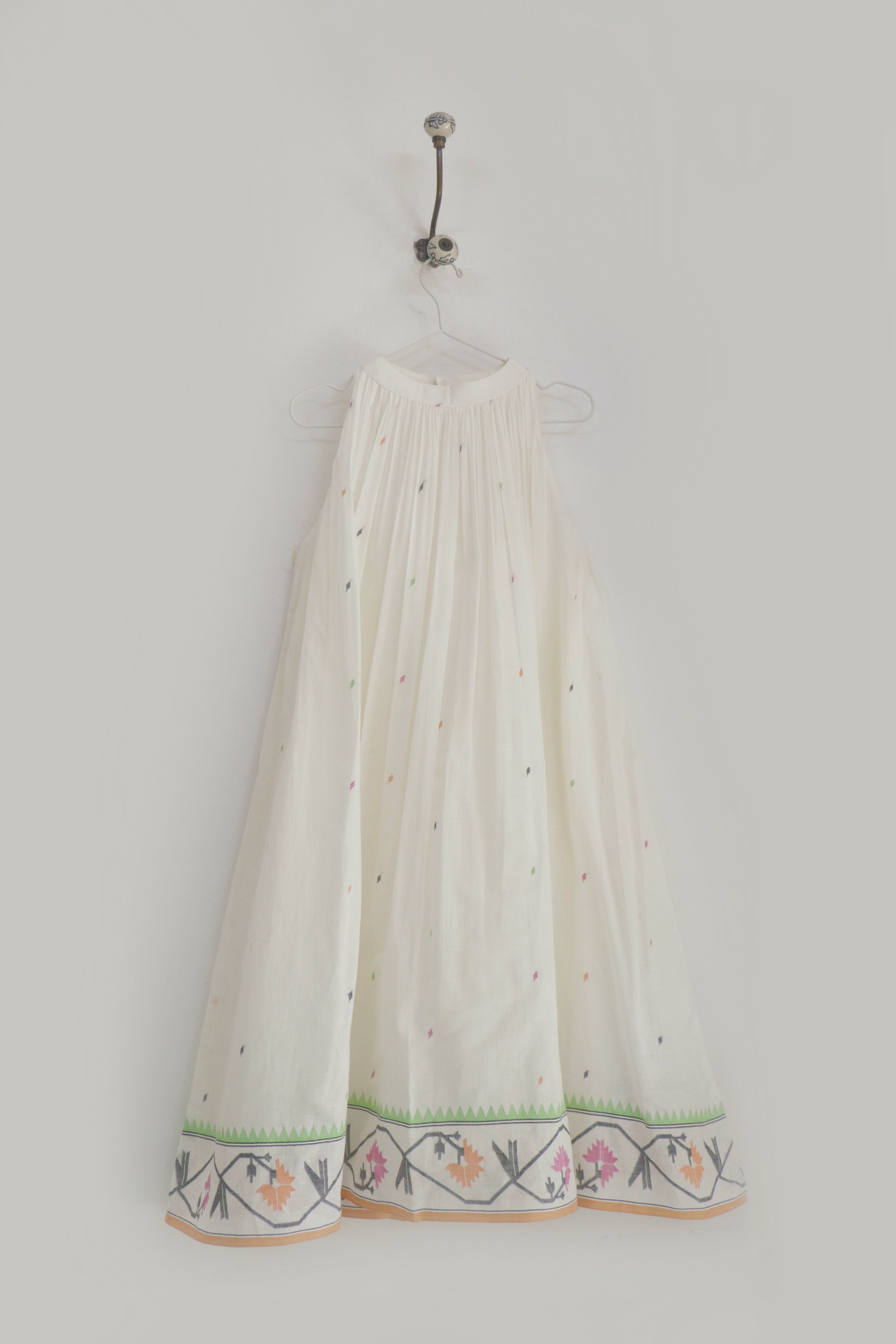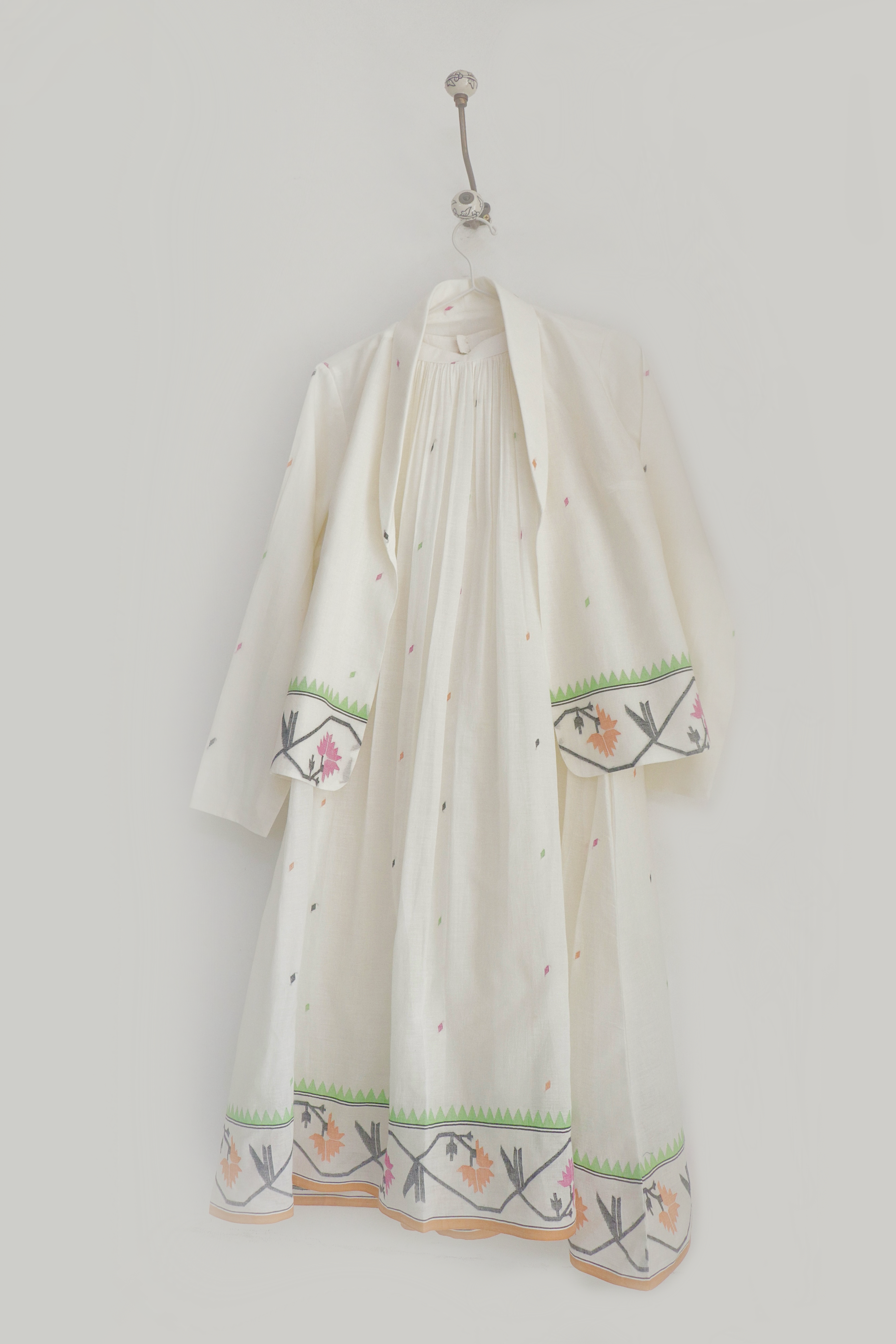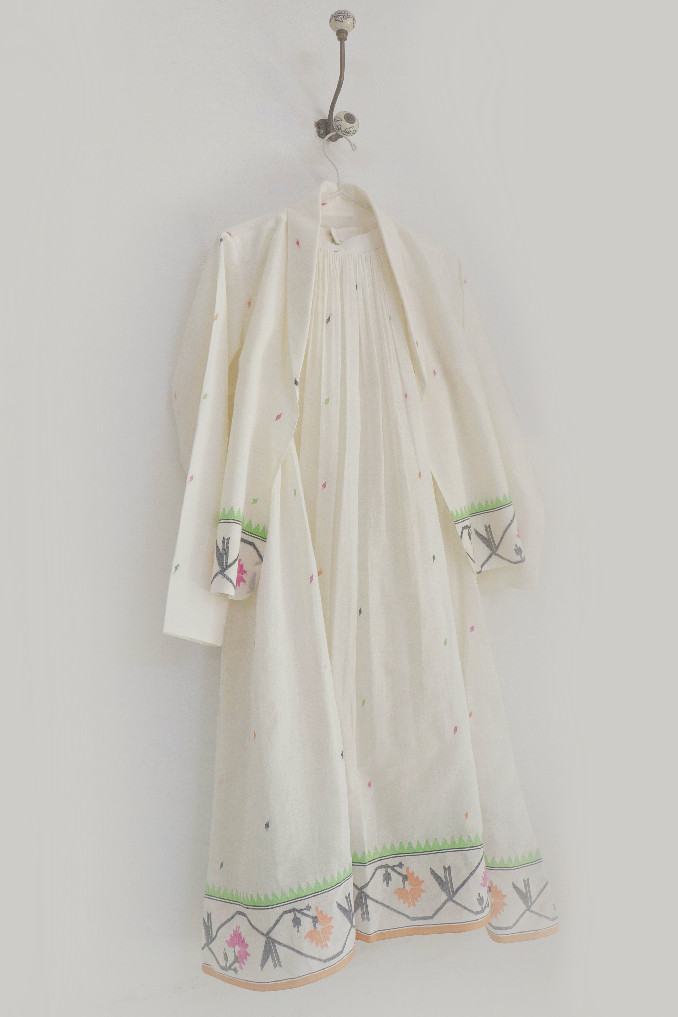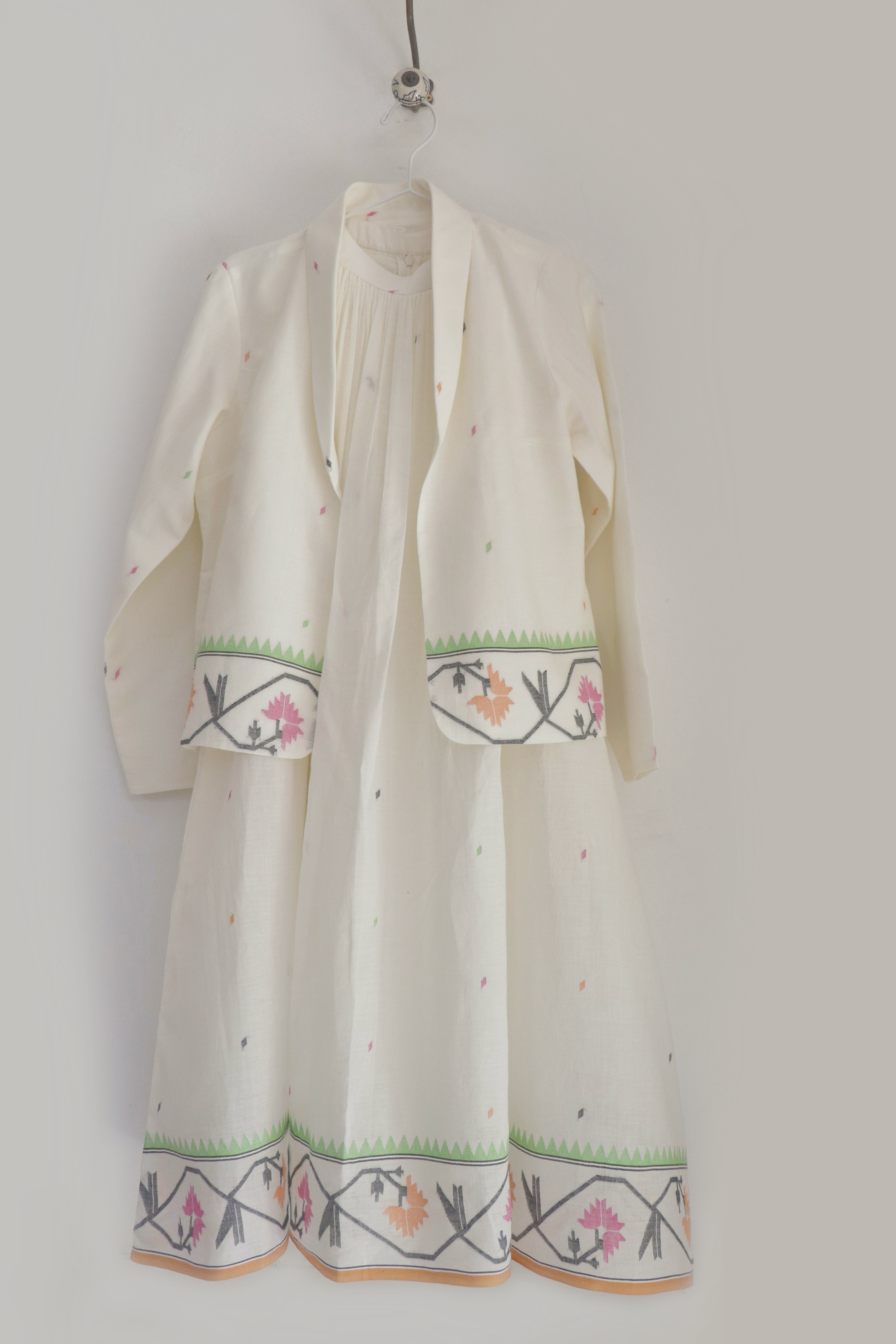 The Tamara is a stunning two-piece ensemble crafted in handwoven Jamdani — a halter neck dress paired with a versatile shawl collar jacket that can be styled in multiple ways. The tiered dress features a checkered bodice with gentle gathers and an adjustable strap, while the open jacket adds an effortless layer of elegance. Both pieces are fully lined with convenient side pockets. Best worn with the matching Jamdani belt included in this set.